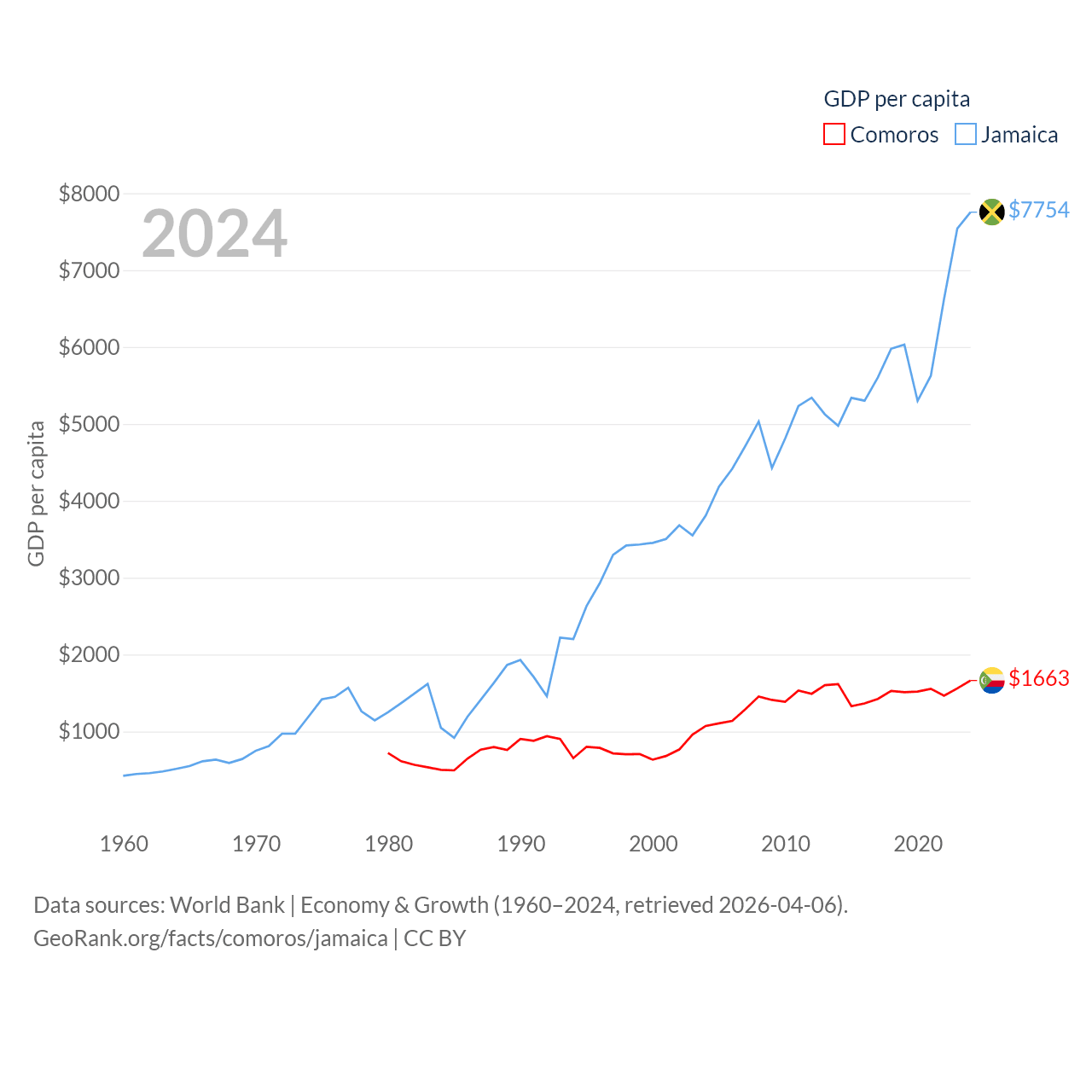 By GDP, Comoros ranks 183/197 ($1.44B) and Jamaica ranks 124/197 ($22B). By GDP per capita, Comoros ranks 161/197 ($1,663), while Jamaica ranks 95/197 ($7,754).