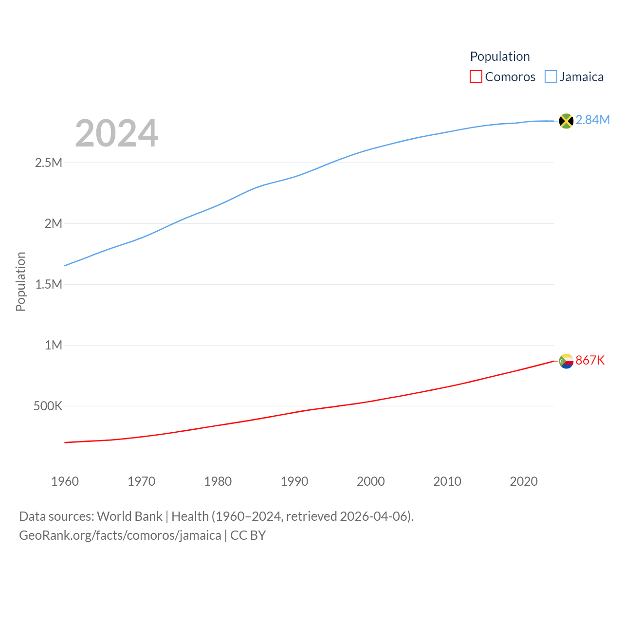 Comoros has a population of 867K (ranked 160/197), compared with 2.84M in Jamaica (ranked 139/197). Comoros' land area is 719 sq mi versus 4,181 sq mi for Jamaica (ranked 171st vs. 159th).