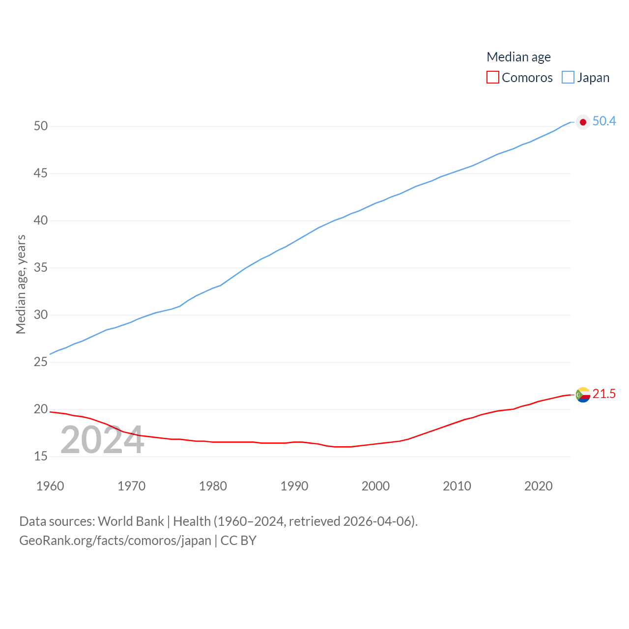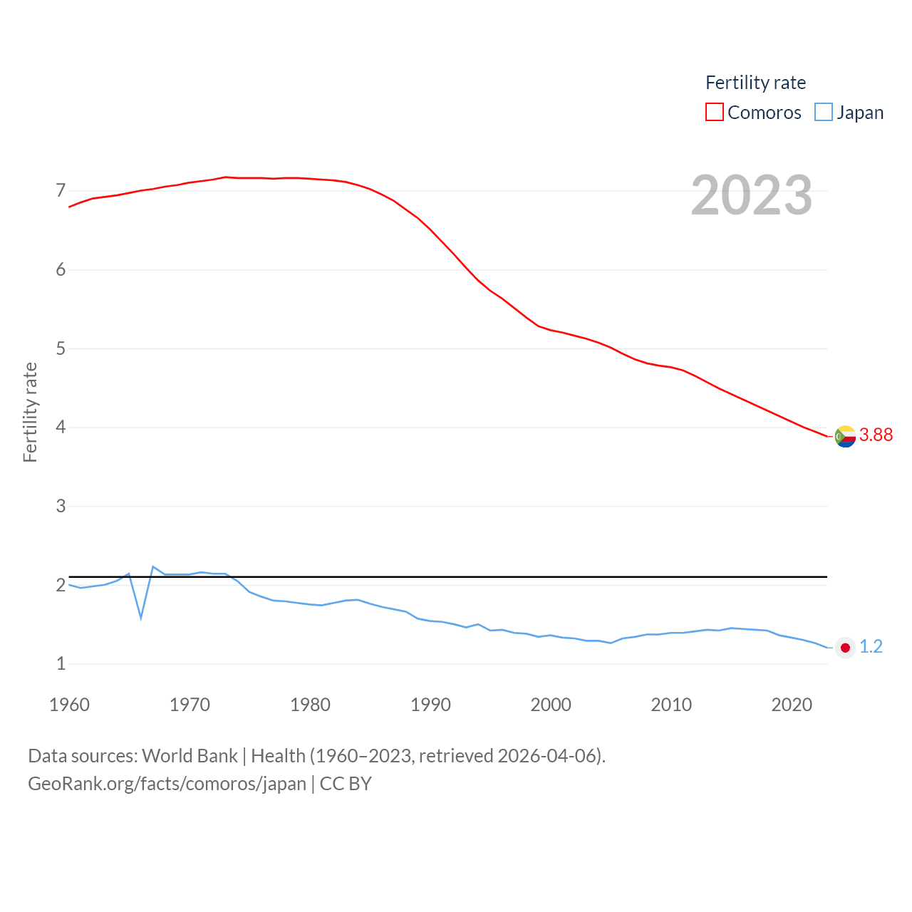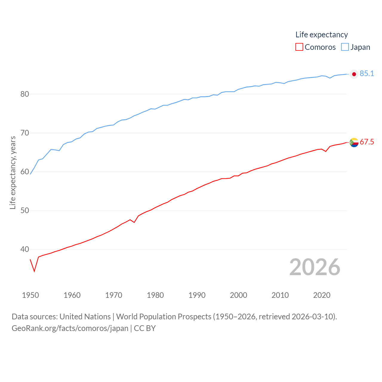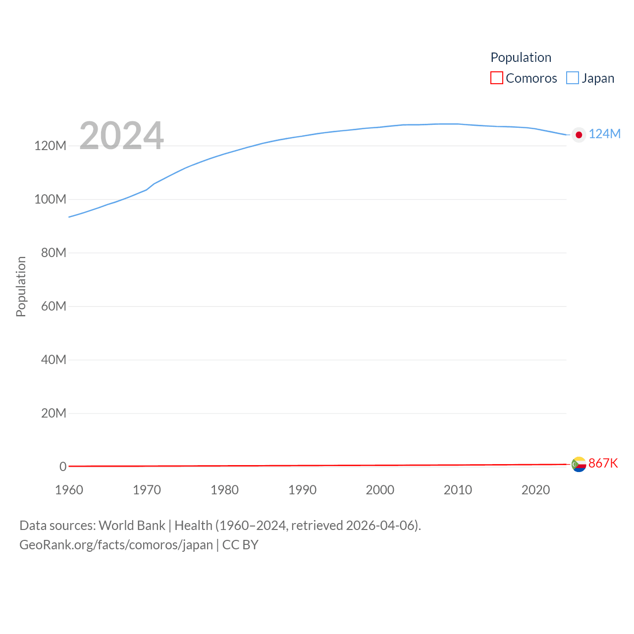 Comoros has a population of 867K (ranked 160/197), compared with 124M in Japan (ranked 12/197). Comoros' land area is 719 sq mi versus 140,761 sq mi for Japan (ranked 171st vs. 61st).