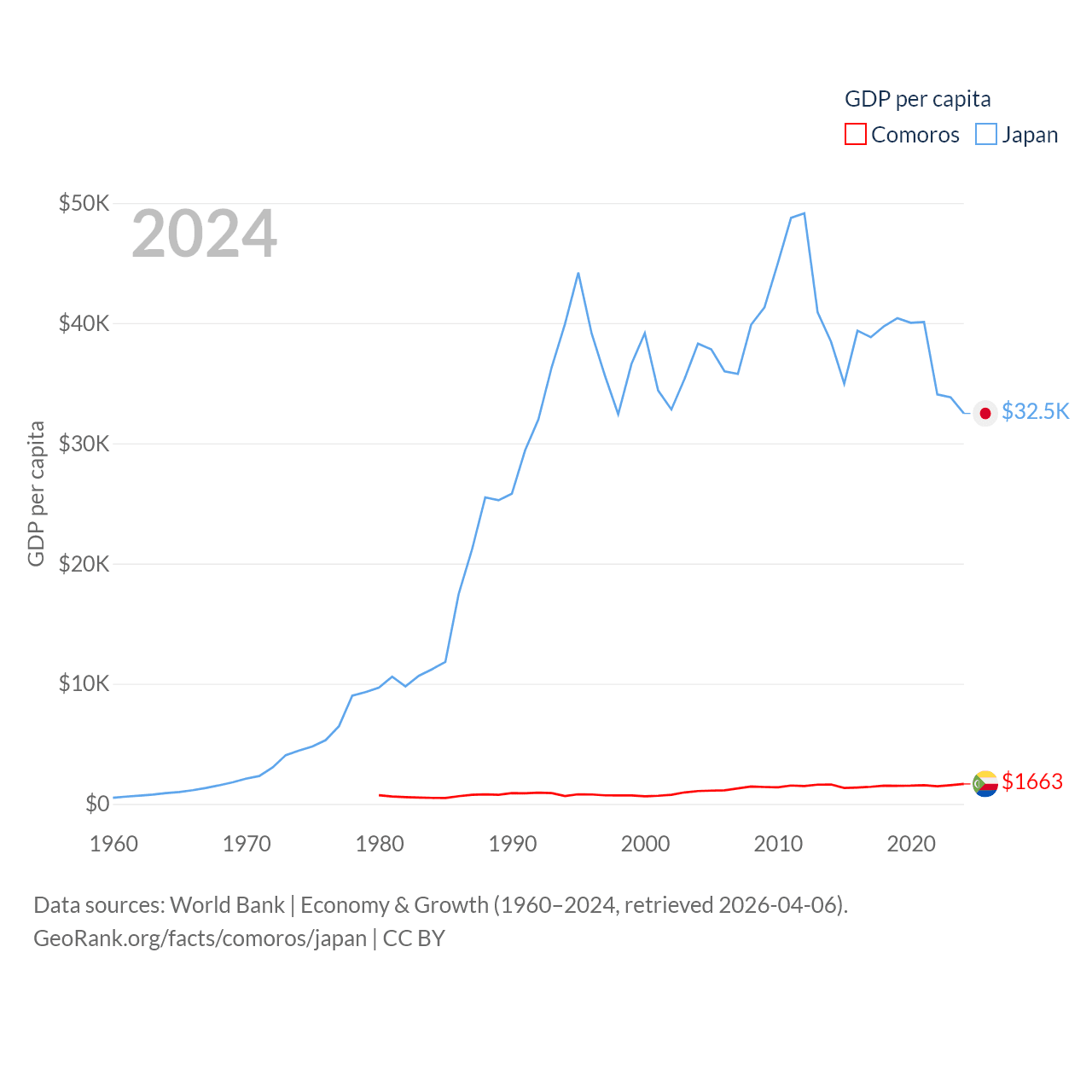 By GDP, Comoros ranks 183/197 ($1.44B) and Japan ranks 4/197 ($4.03T). By GDP per capita, Comoros ranks 161/197 ($1,663), while Japan ranks 38/197 ($32,487).