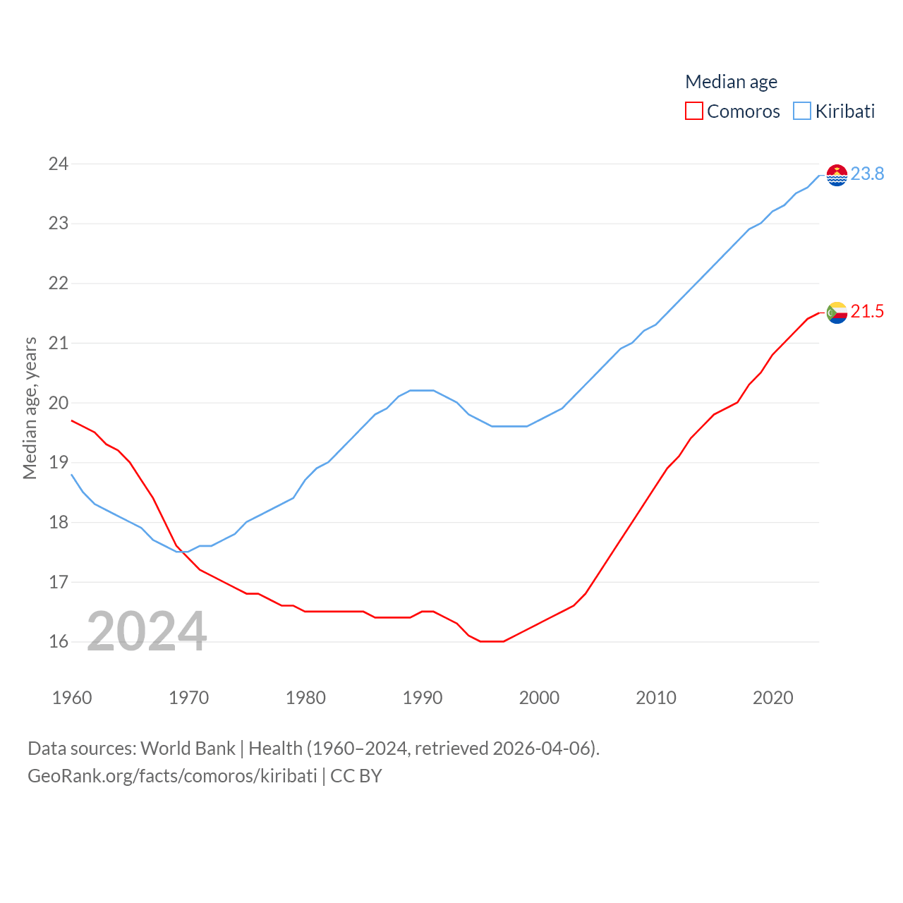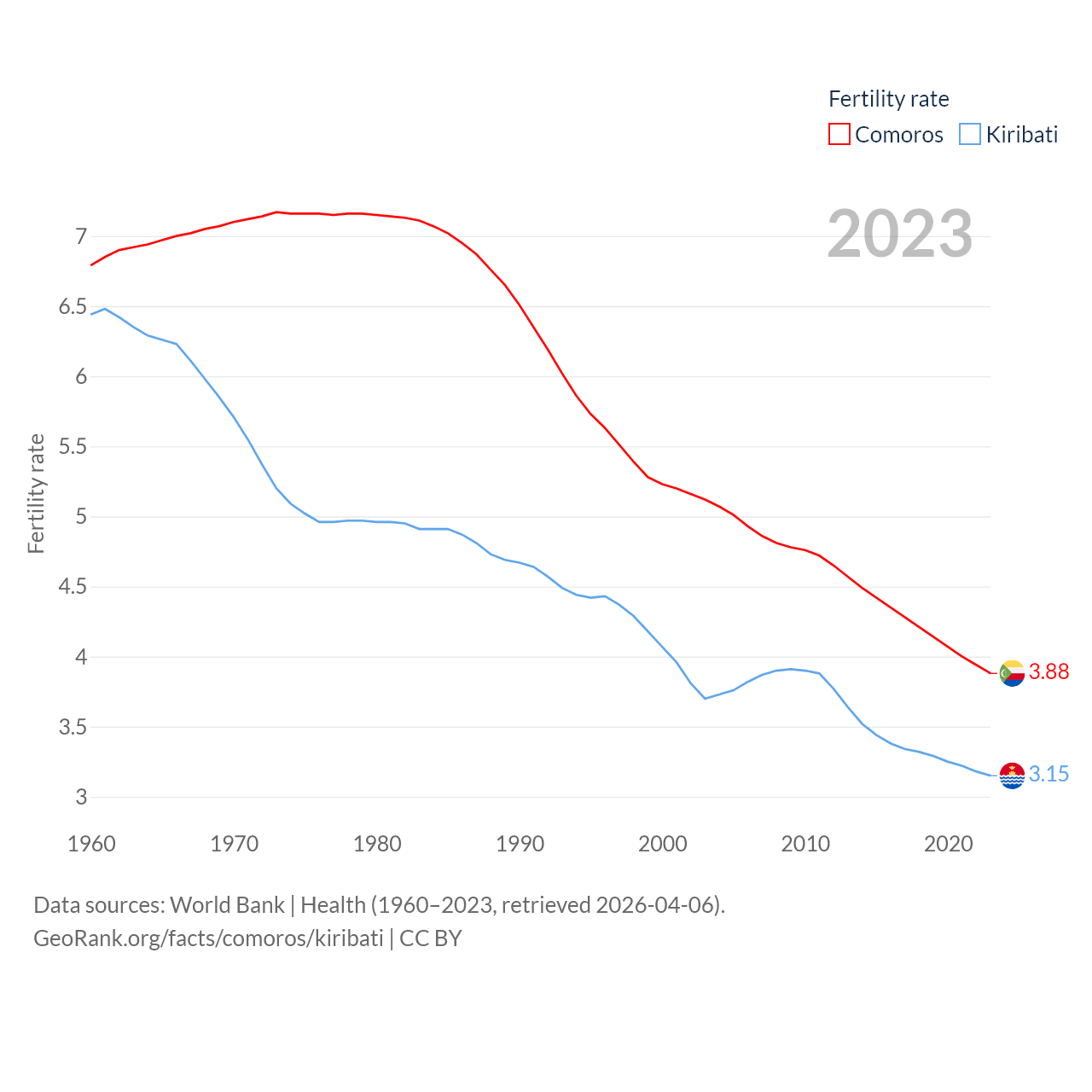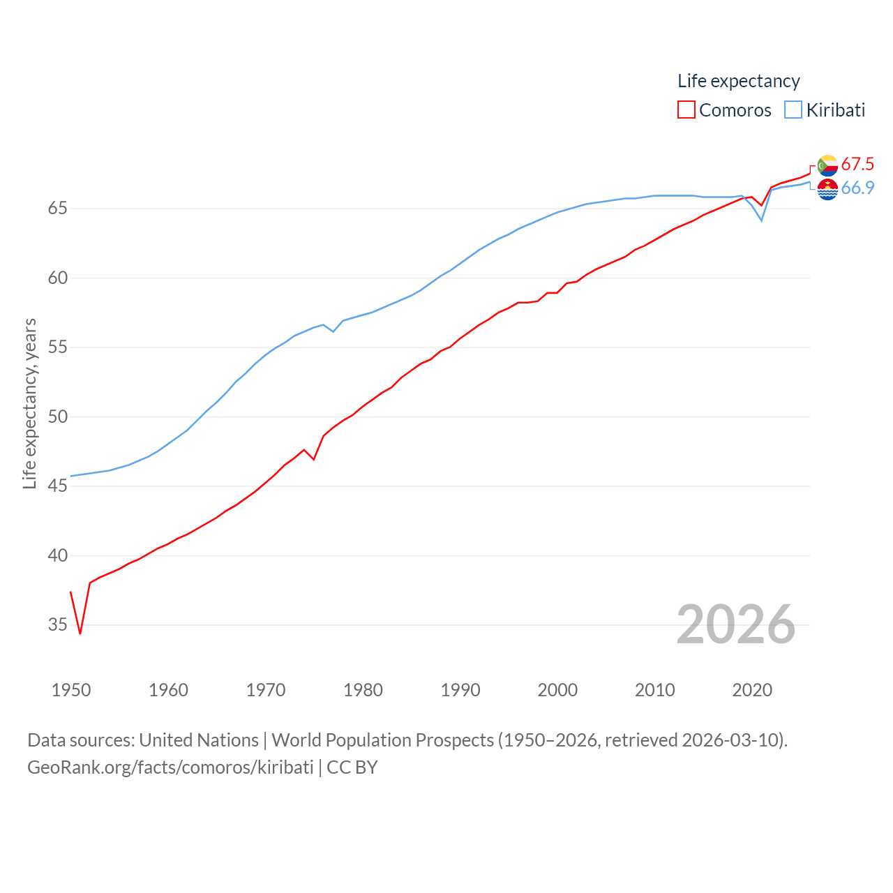 Comoros has a population of 867K (ranked 160/197), compared with 135K in Kiribati (ranked 180/197). Comoros' land area is 719 sq mi versus 313 sq mi for Kiribati (ranked 171st vs. 173rd).