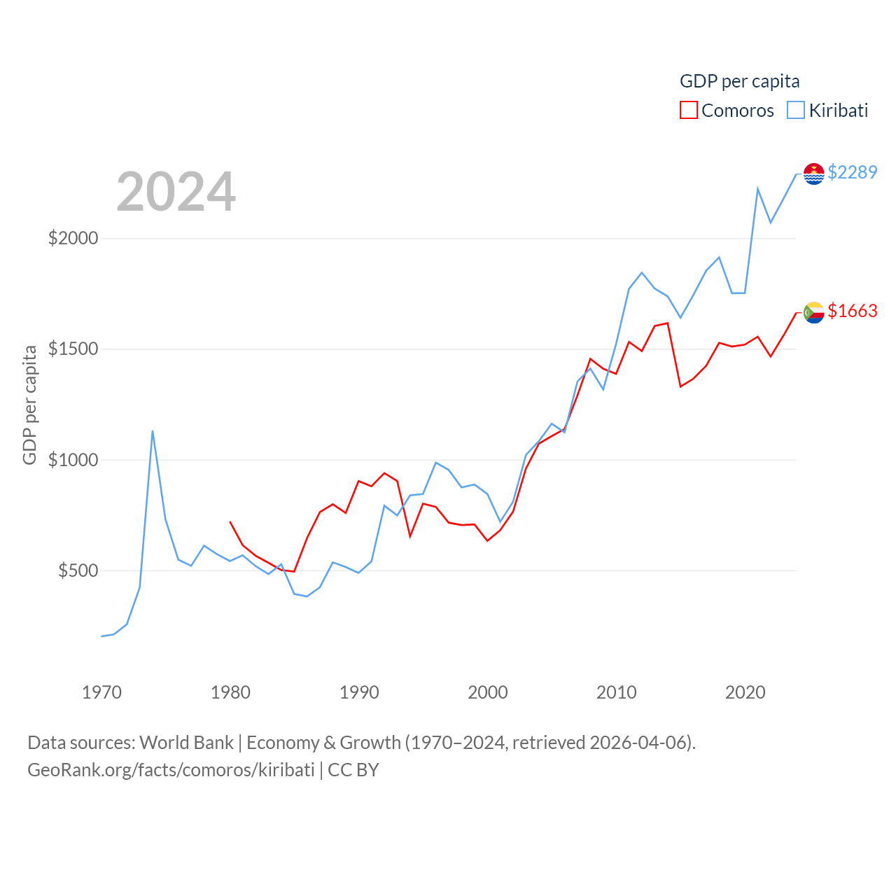 By GDP, Comoros ranks 183/197 ($1.44B) and Kiribati ranks 192/197 ($308M). By GDP per capita, Comoros ranks 161/197 ($1,663), while Kiribati ranks 152/197 ($2,289).