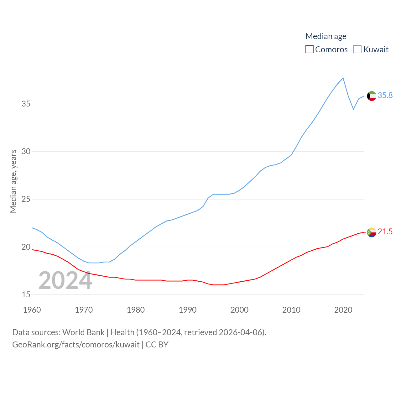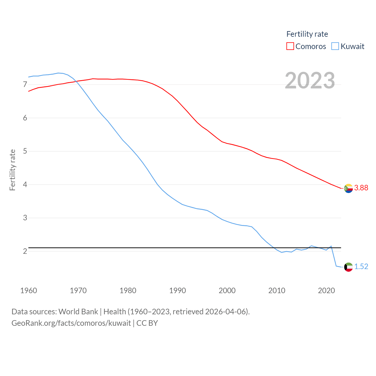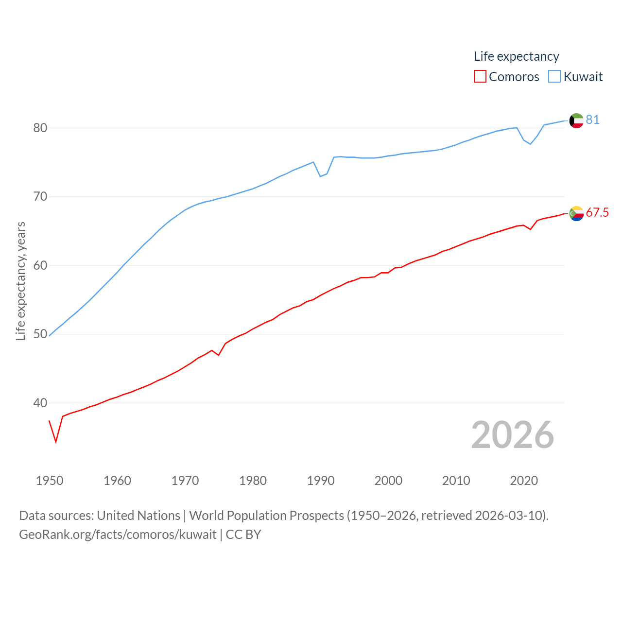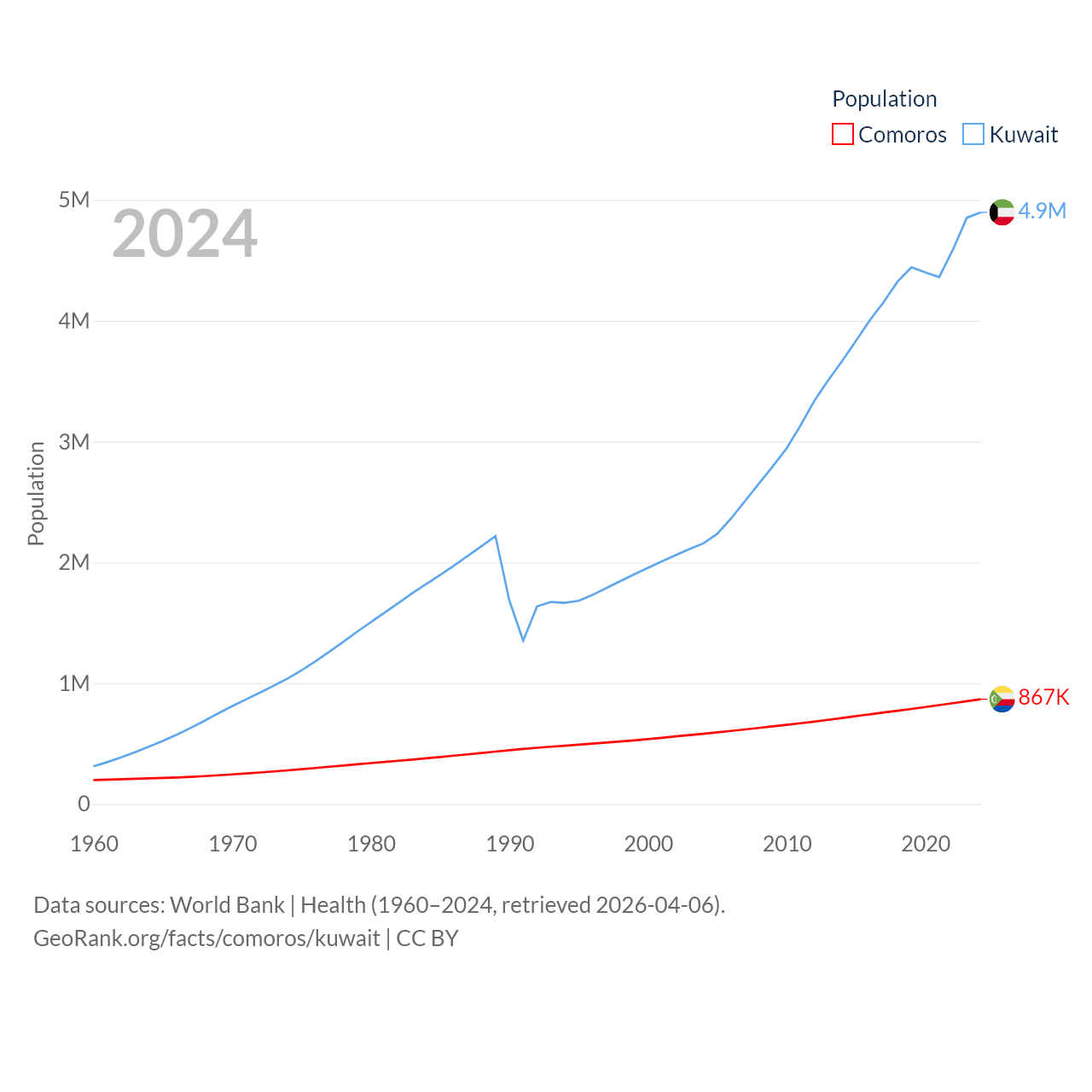 Comoros has a population of 867K (ranked 160/197), compared with 4.9M in Kuwait (ranked 127/197). Comoros' land area is 719 sq mi versus 6,880 sq mi for Kuwait (ranked 171st vs. 153rd).
