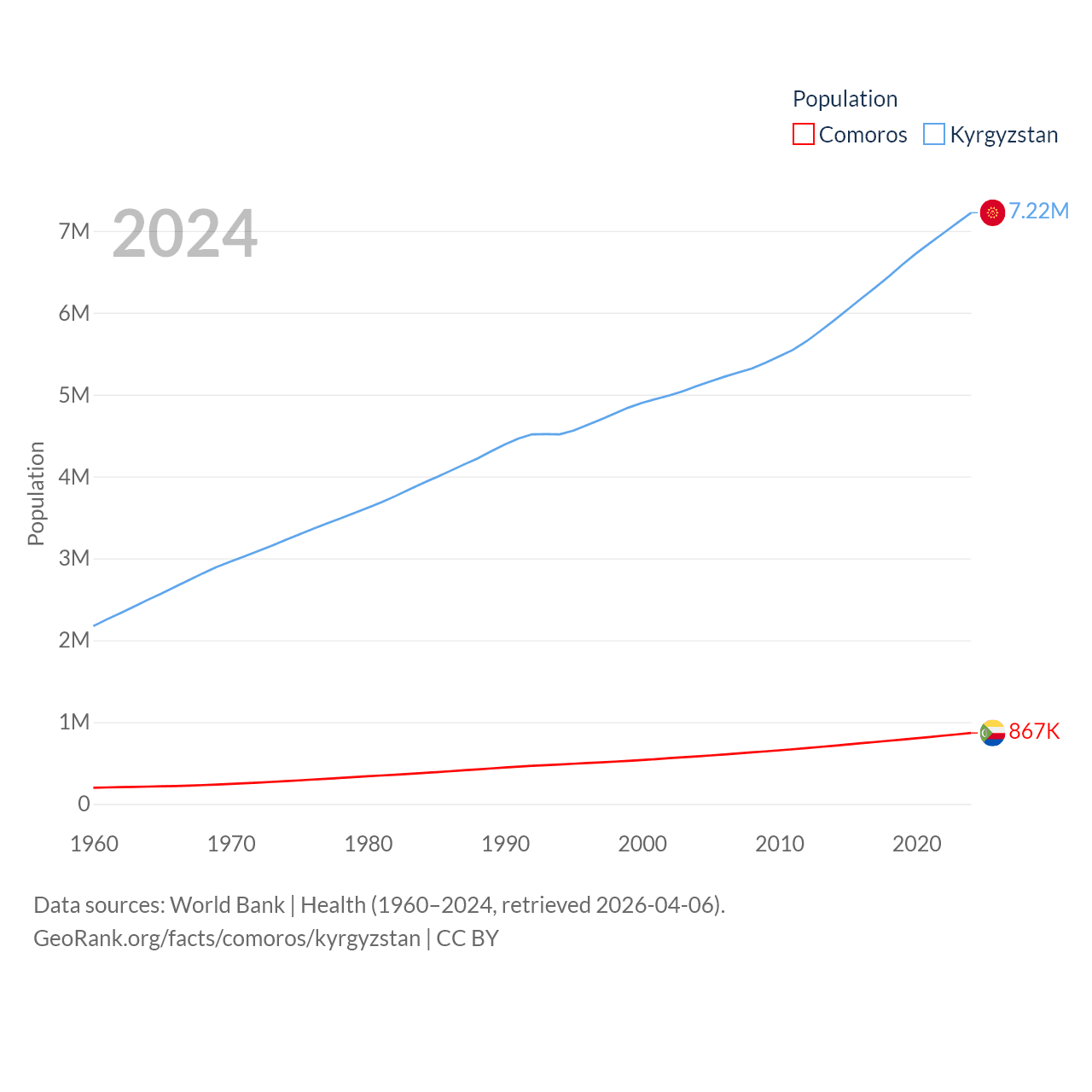 Comoros has a population of 867K (ranked 160/197), compared with 7.22M in Kyrgyzstan (ranked 106/197). Comoros' land area is 719 sq mi versus 74,054 sq mi for Kyrgyzstan (ranked 171st vs. 86th).