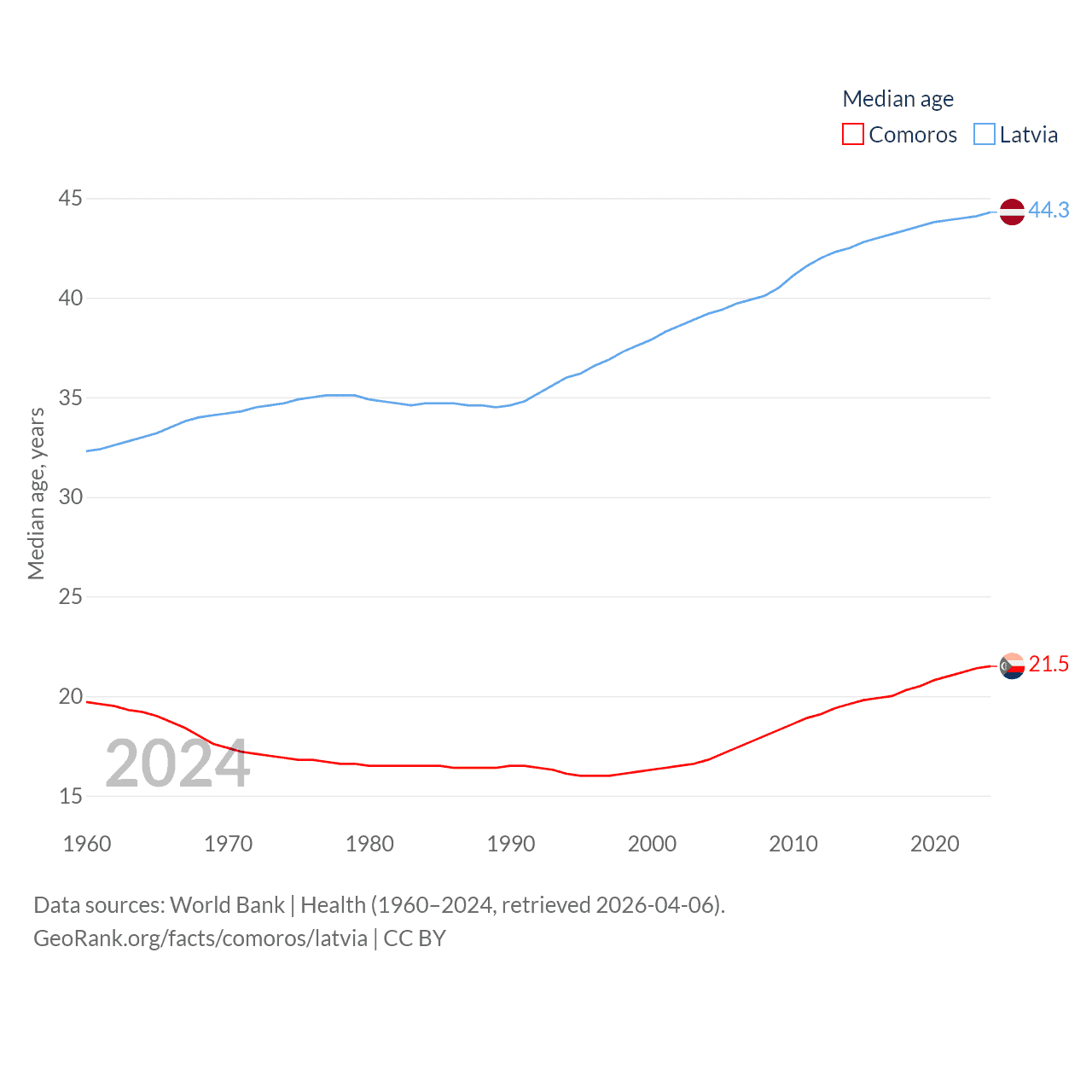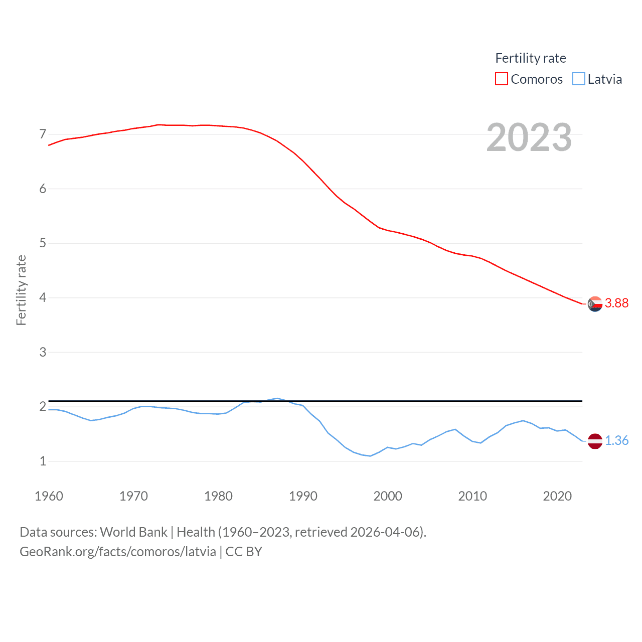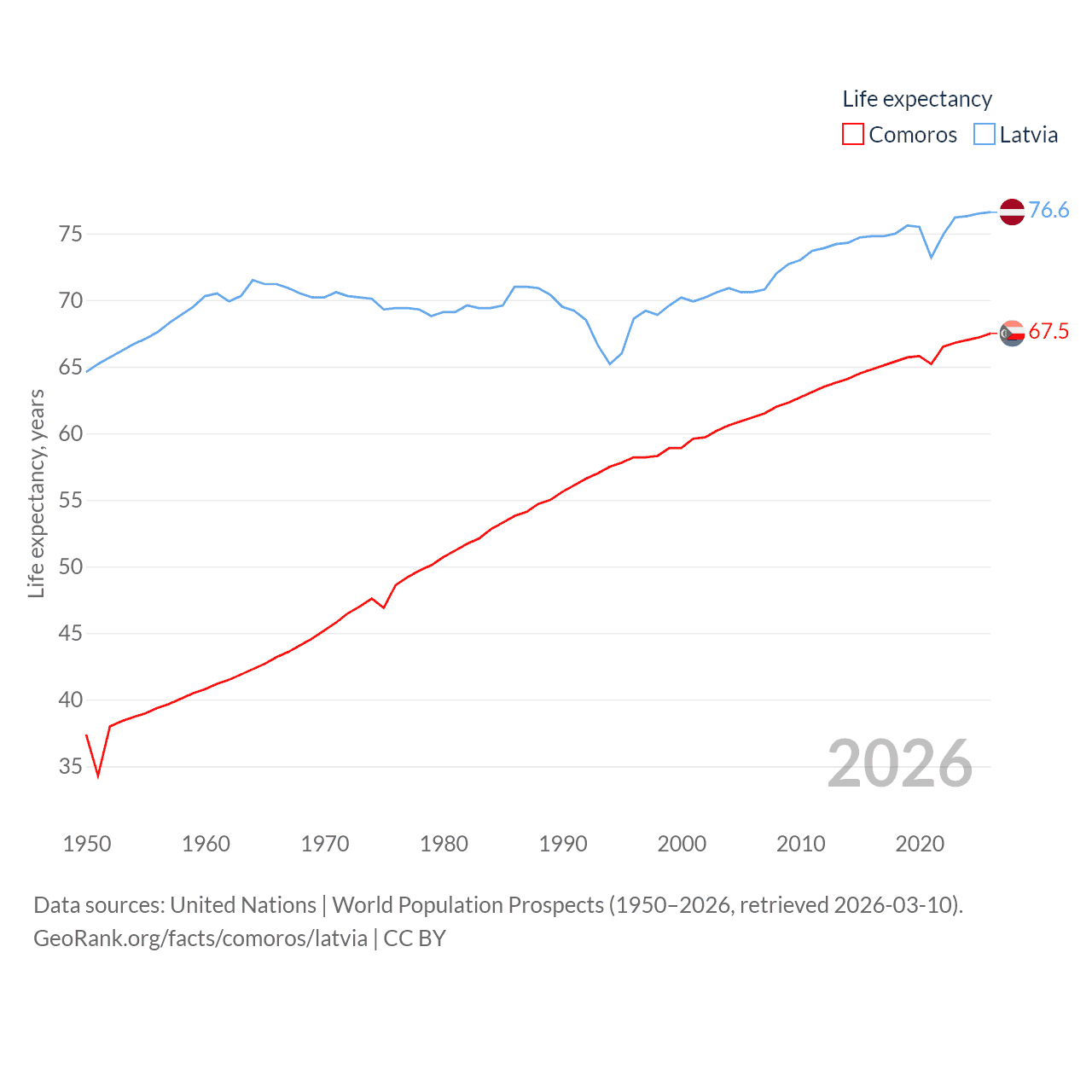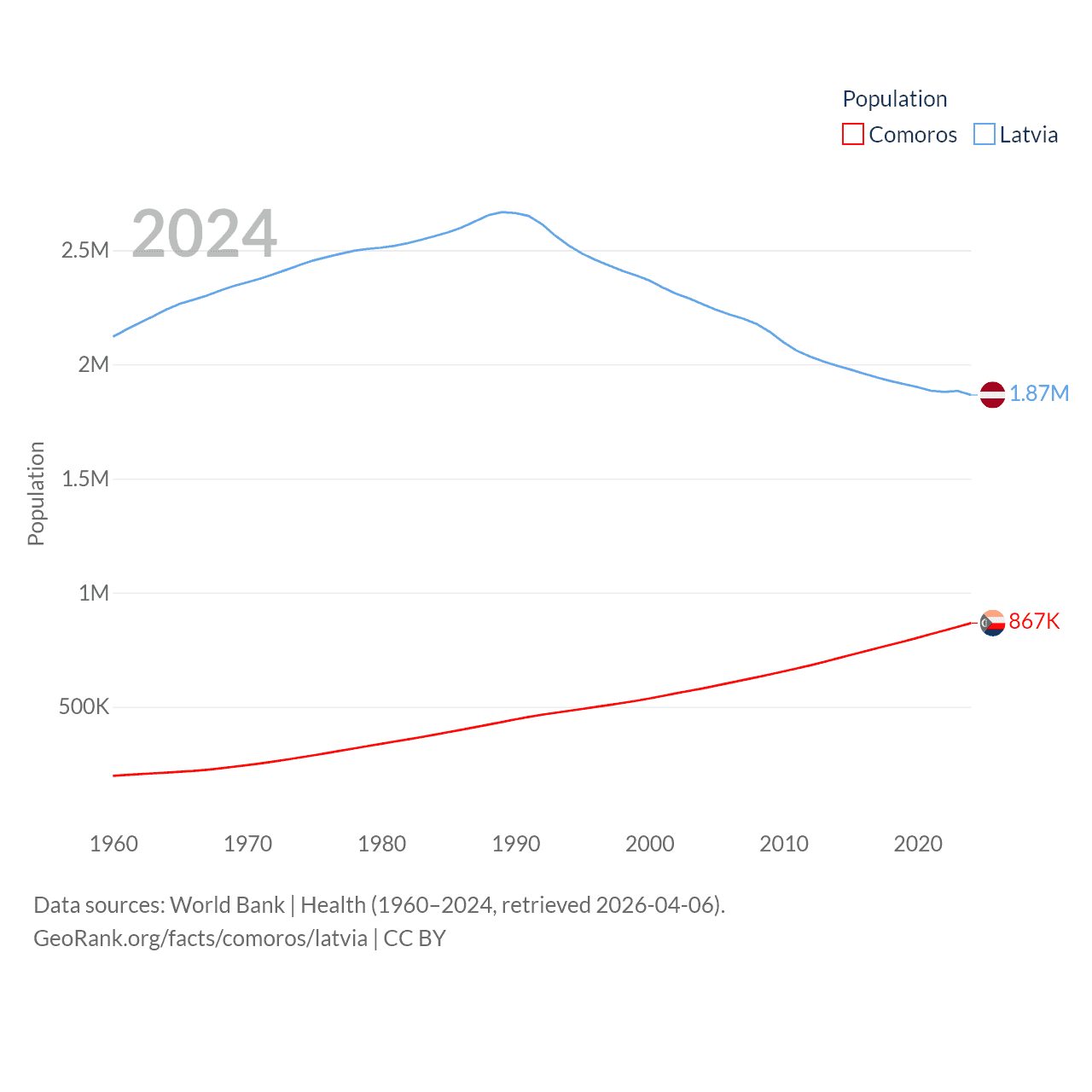Comoros has a population of 867K (ranked 160/197), compared with 1.87M in Latvia (ranked 149/197). Comoros' land area is 719 sq mi versus 24,027 sq mi for Latvia (ranked 171st vs. 121st).