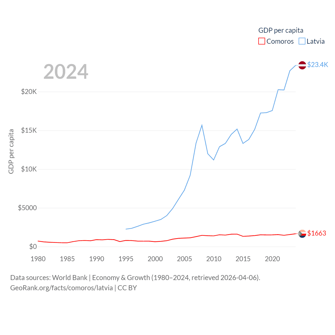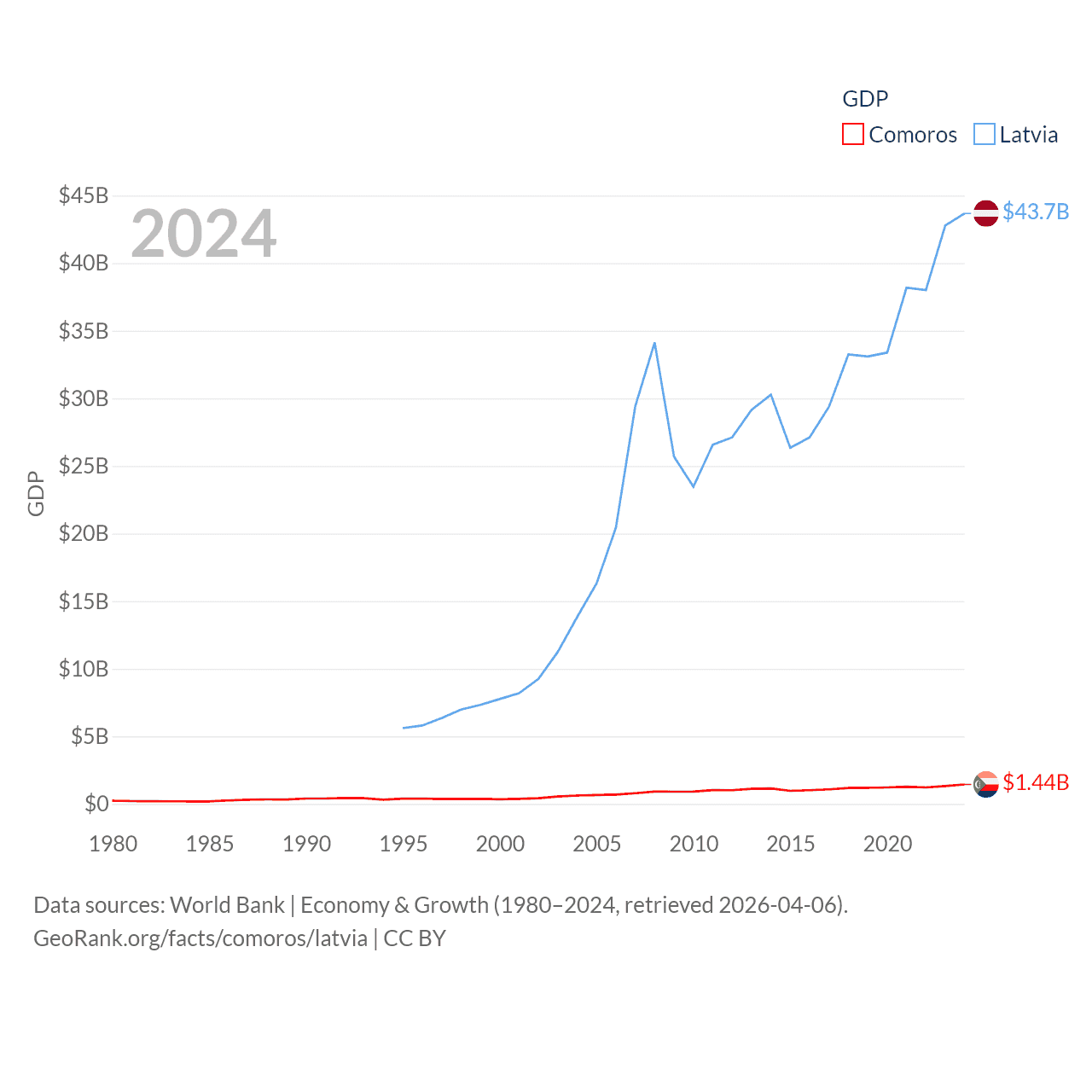By GDP, Comoros ranks 183/197 ($1.44B) and Latvia ranks 99/197 ($43.7B). By GDP per capita, Comoros ranks 161/197 ($1,663), while Latvia ranks 54/197 ($23,409).