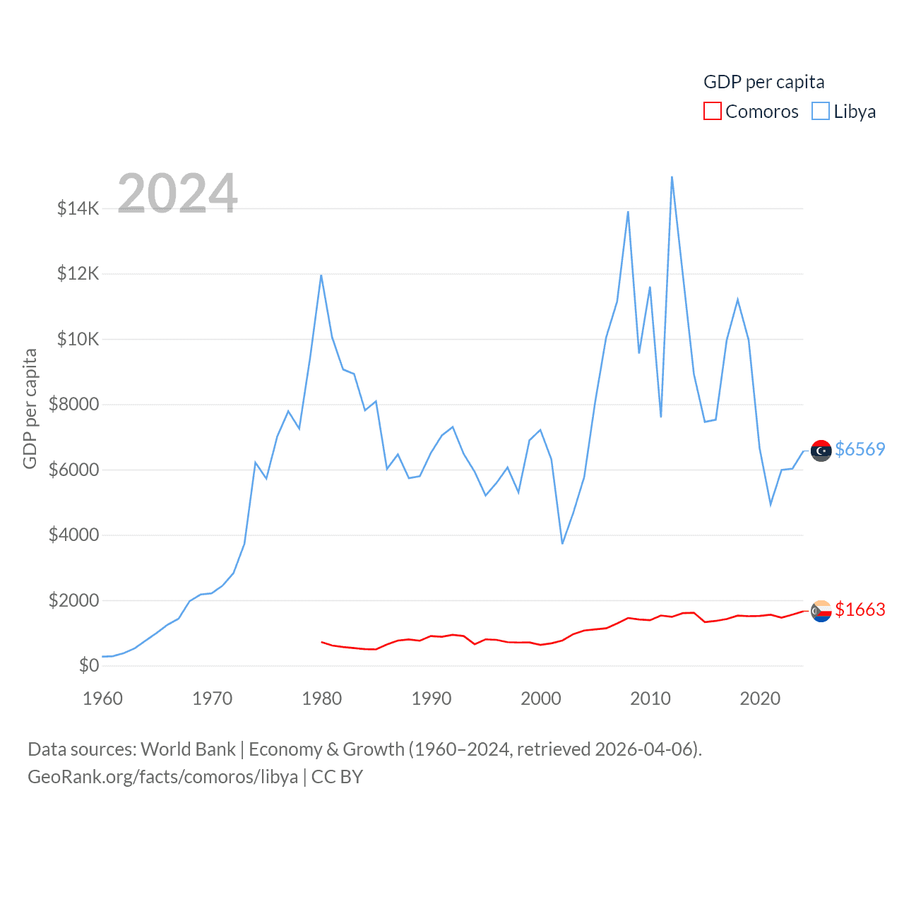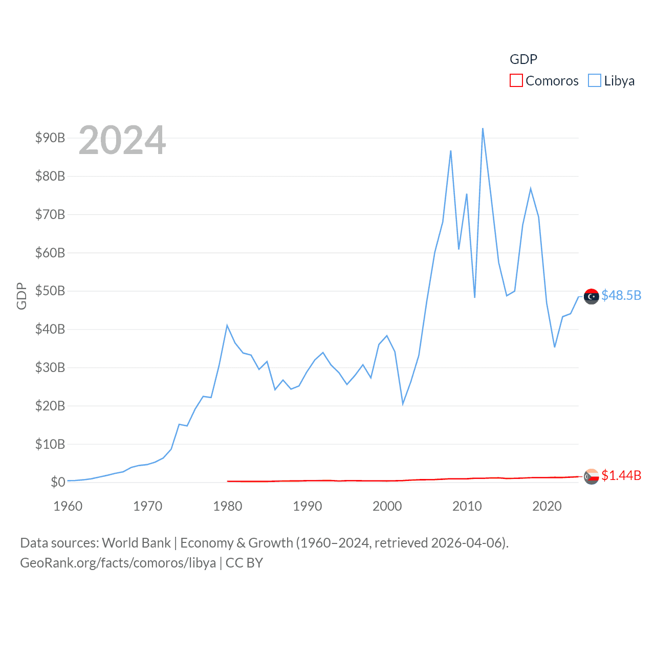 By GDP, Comoros ranks 183/197 ($1.44B) and Libya ranks 95/197 ($48.5B). By GDP per capita, Comoros ranks 161/197 ($1,663), while Libya ranks 107/197 ($6,569).