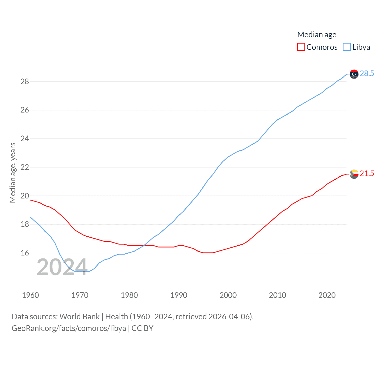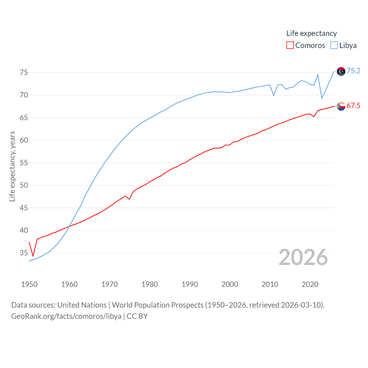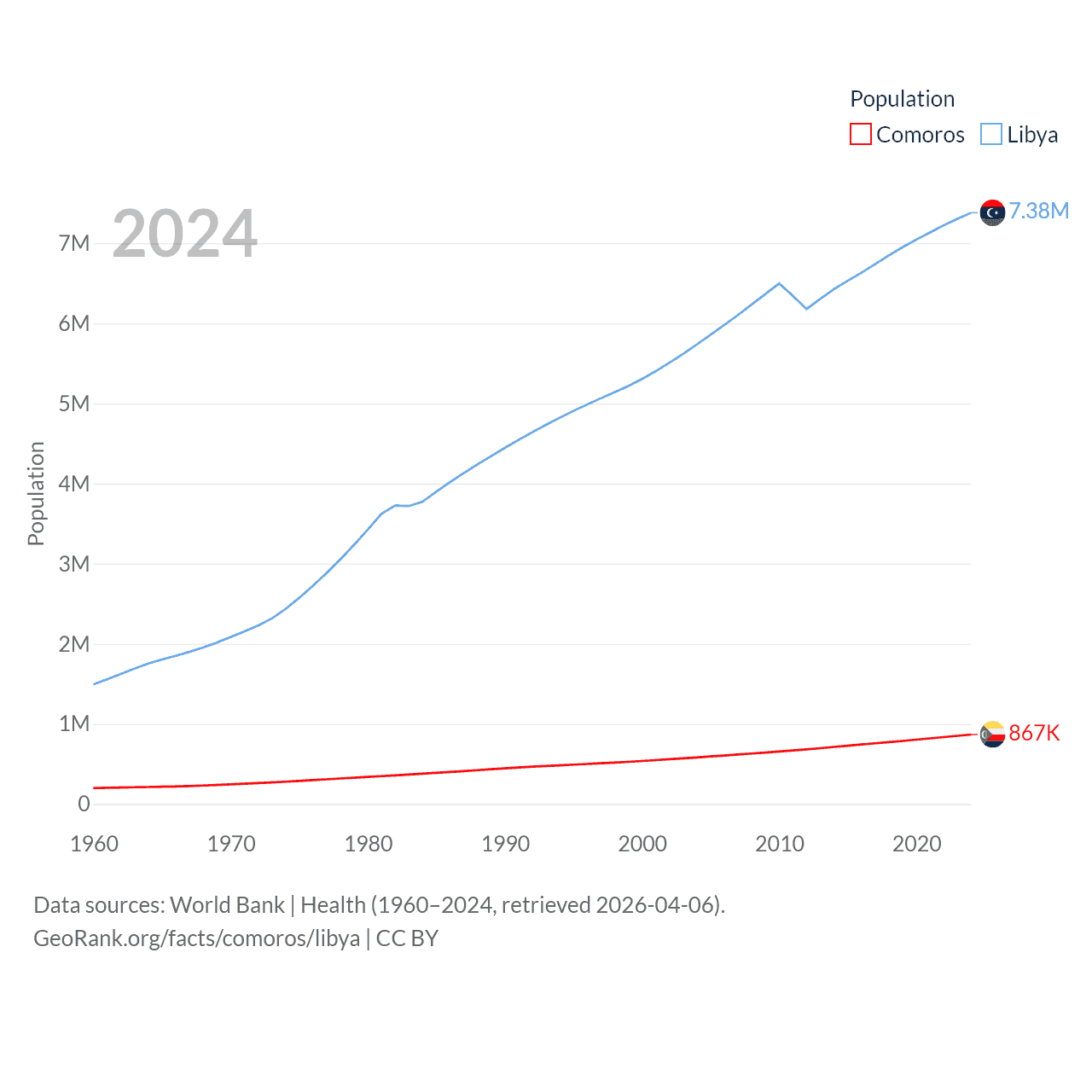 Comoros has a population of 867K (ranked 160/197), compared with 7.38M in Libya (ranked 105/197). Comoros' land area is 719 sq mi versus 679,362 sq mi for Libya (ranked 171st vs. 16th).