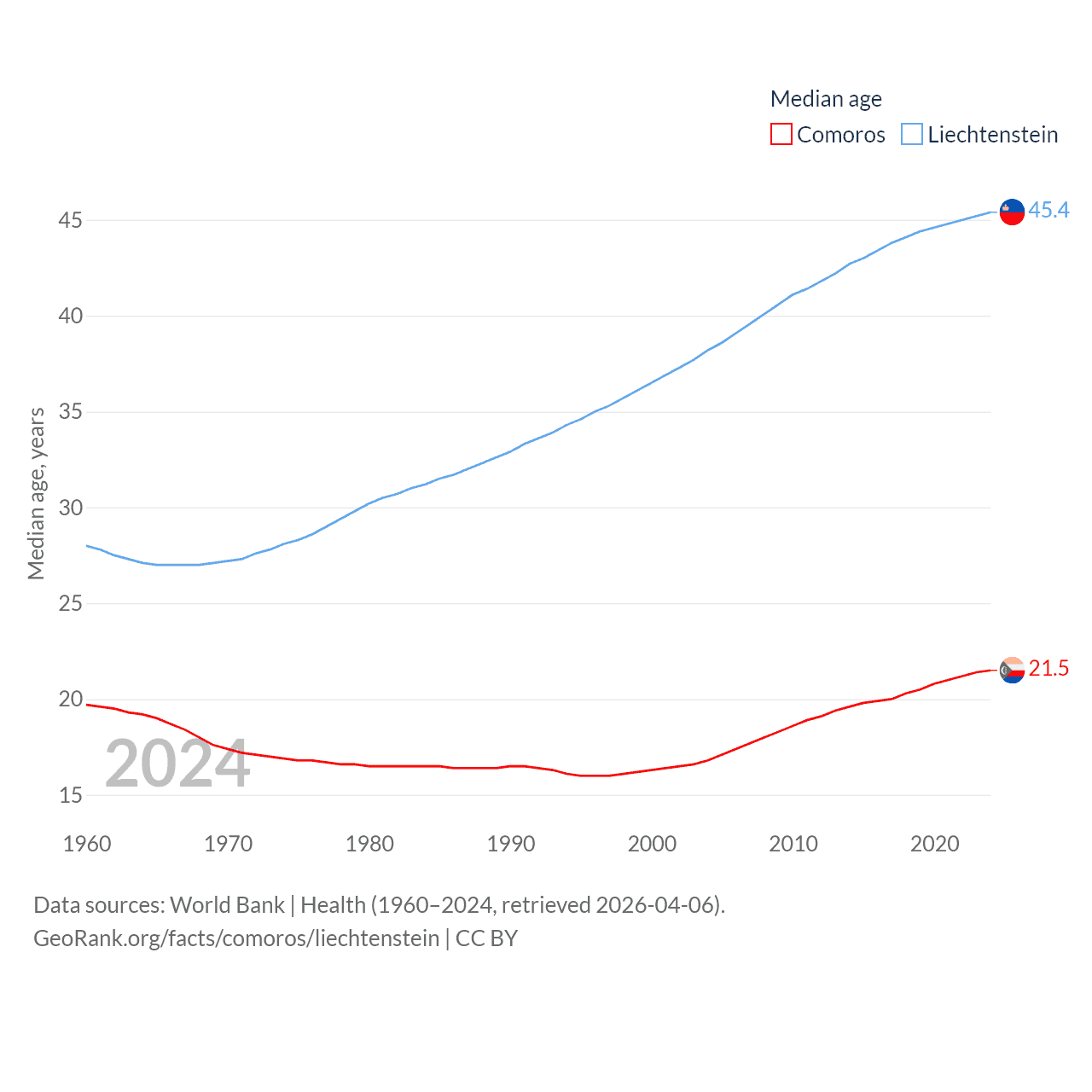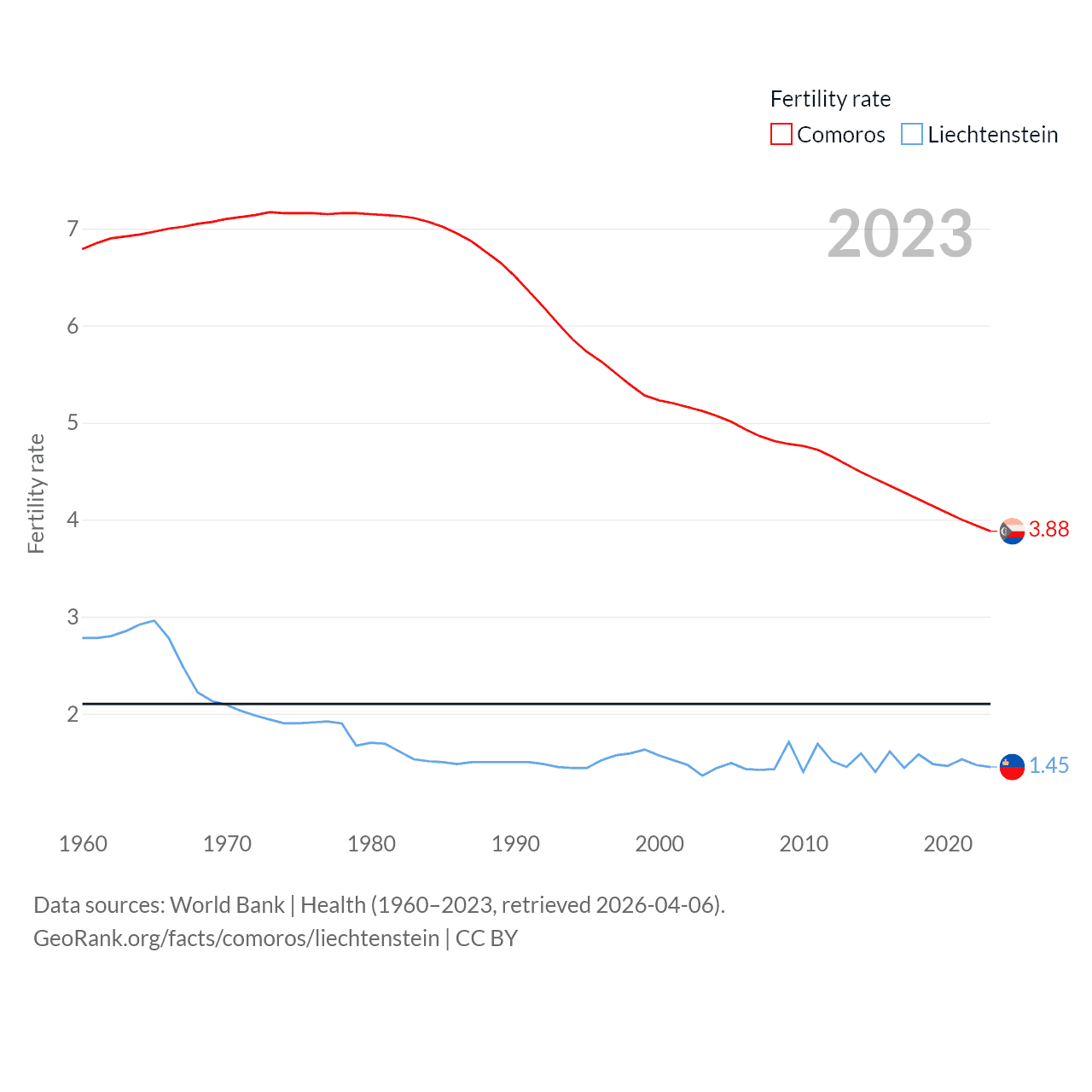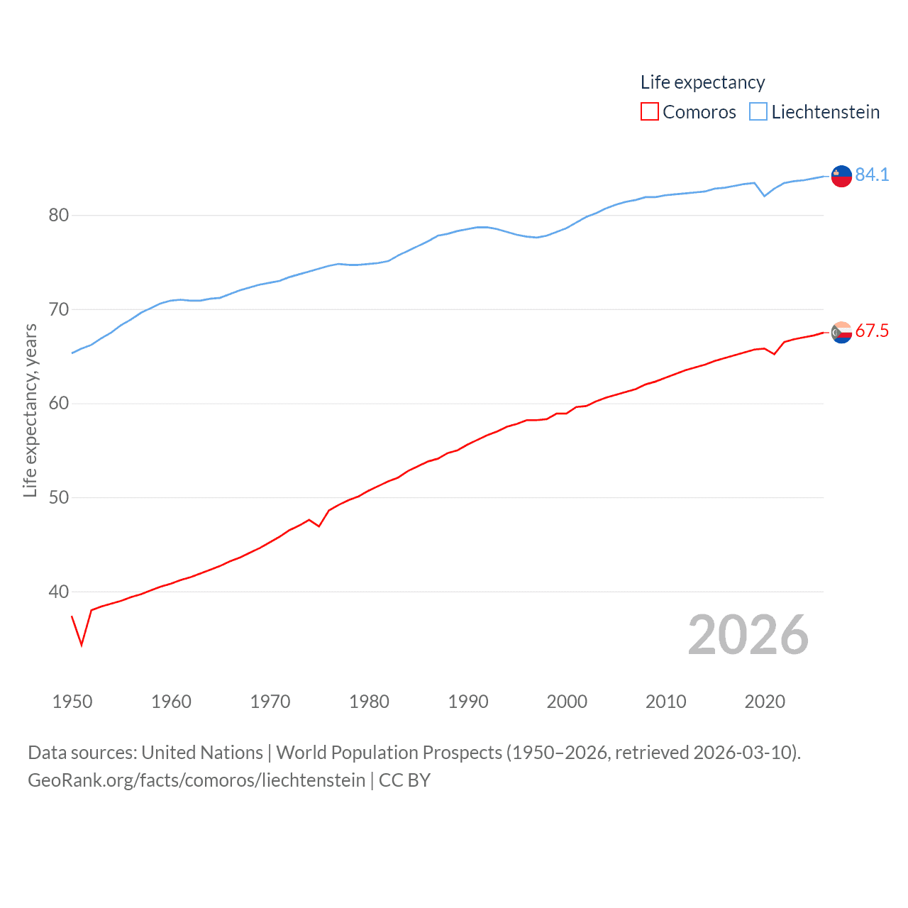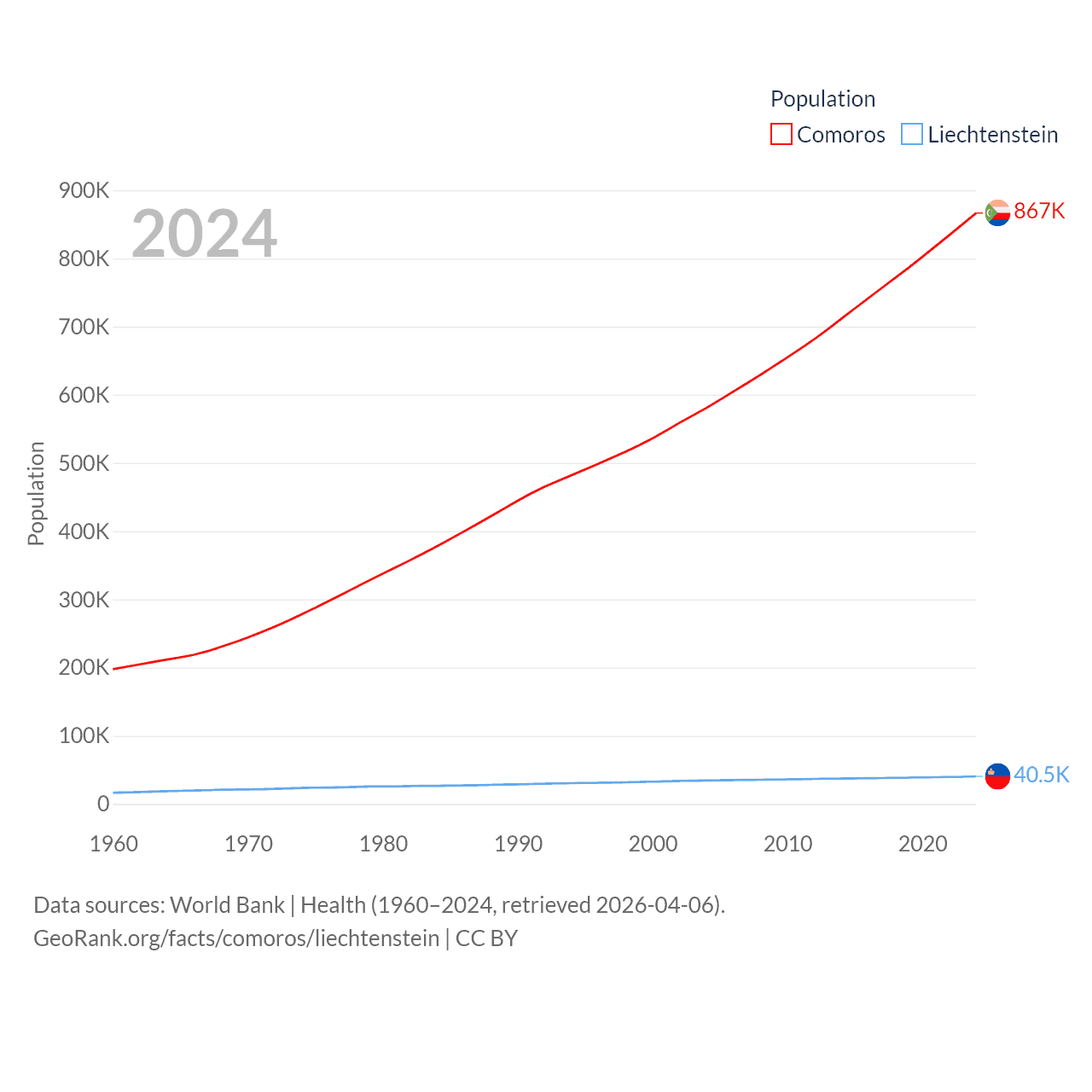 Comoros has a population of 867K (ranked 160/197), compared with 40.4K in Liechtenstein (ranked 190/197). Comoros' land area is 719 sq mi versus 61.8 sq mi for Liechtenstein (ranked 171st vs. 192nd).
