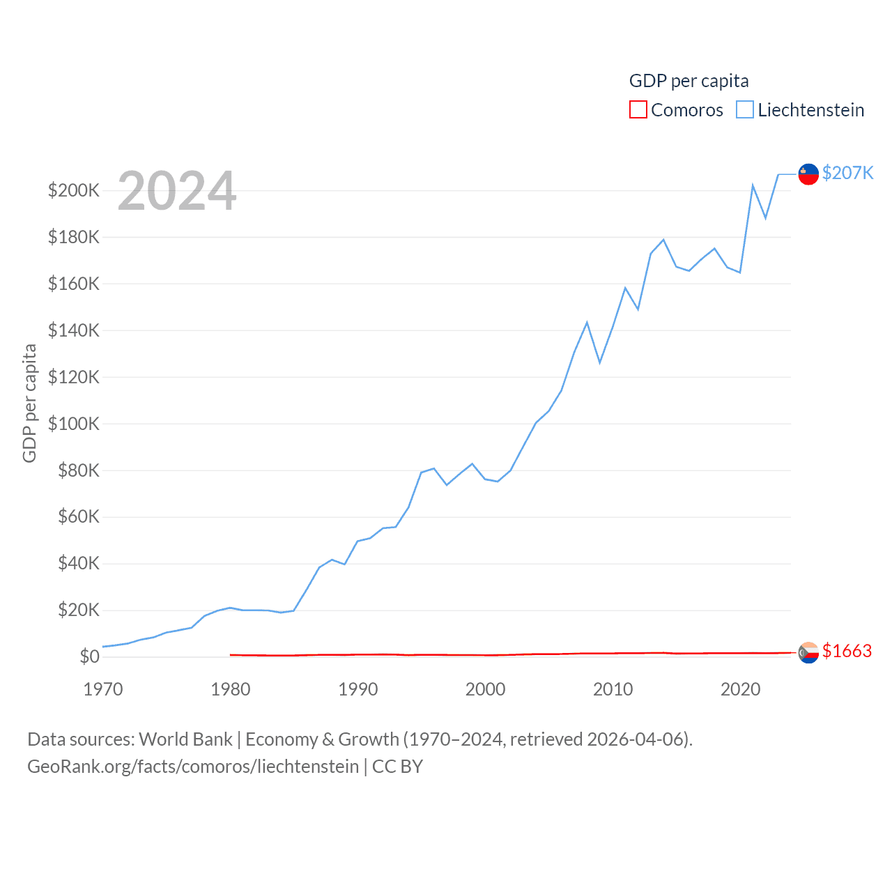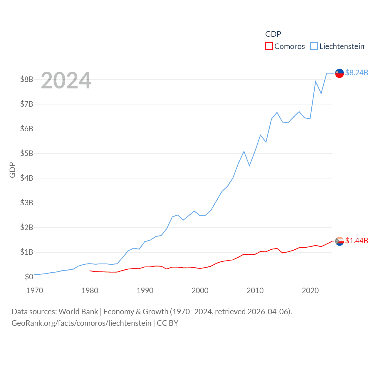 By GDP, Comoros ranks 183/197 ($1.44B) and Liechtenstein ranks 156/197 ($8.24B). By GDP per capita, Comoros ranks 161/197 ($1,663), while Liechtenstein ranks 2/197 ($206,781).