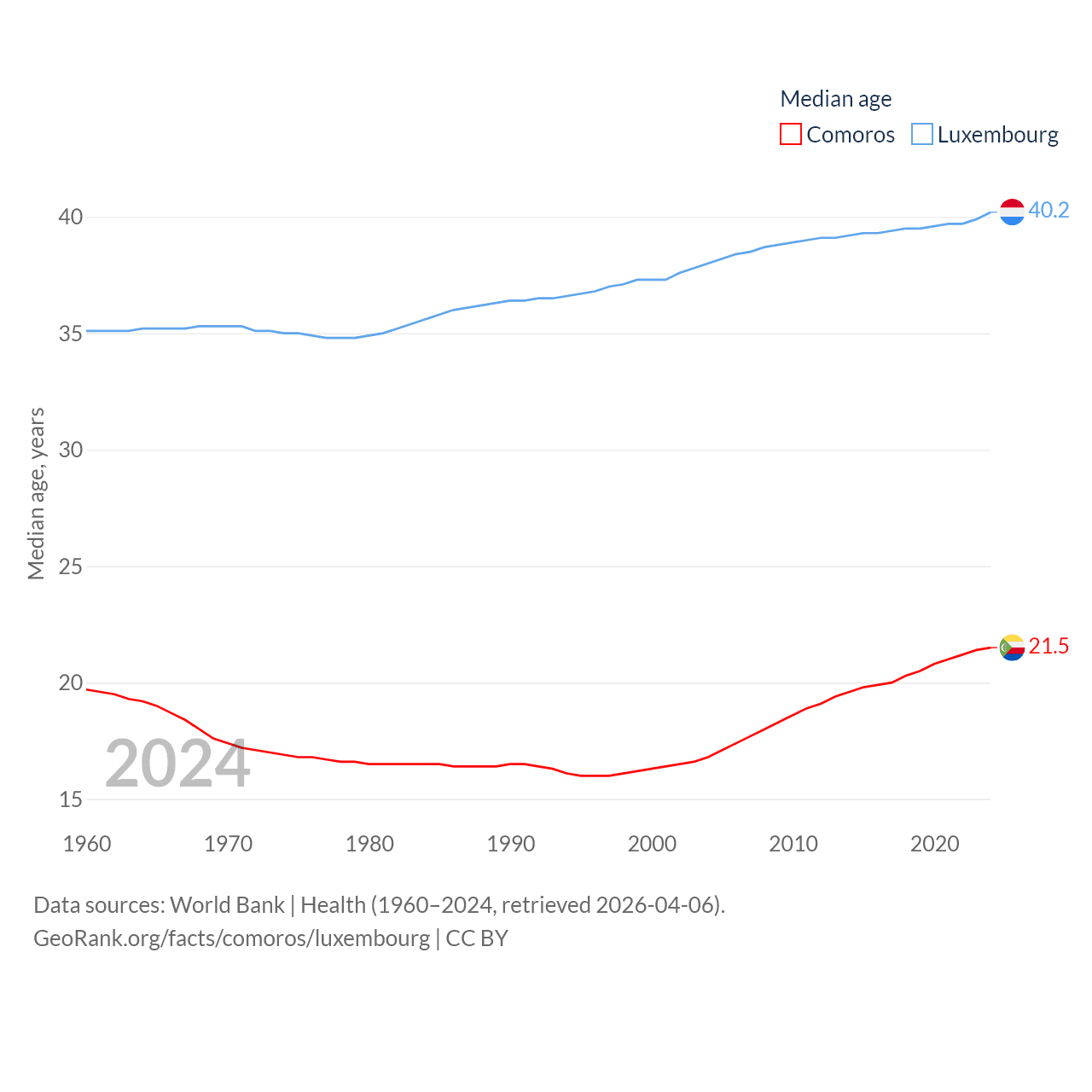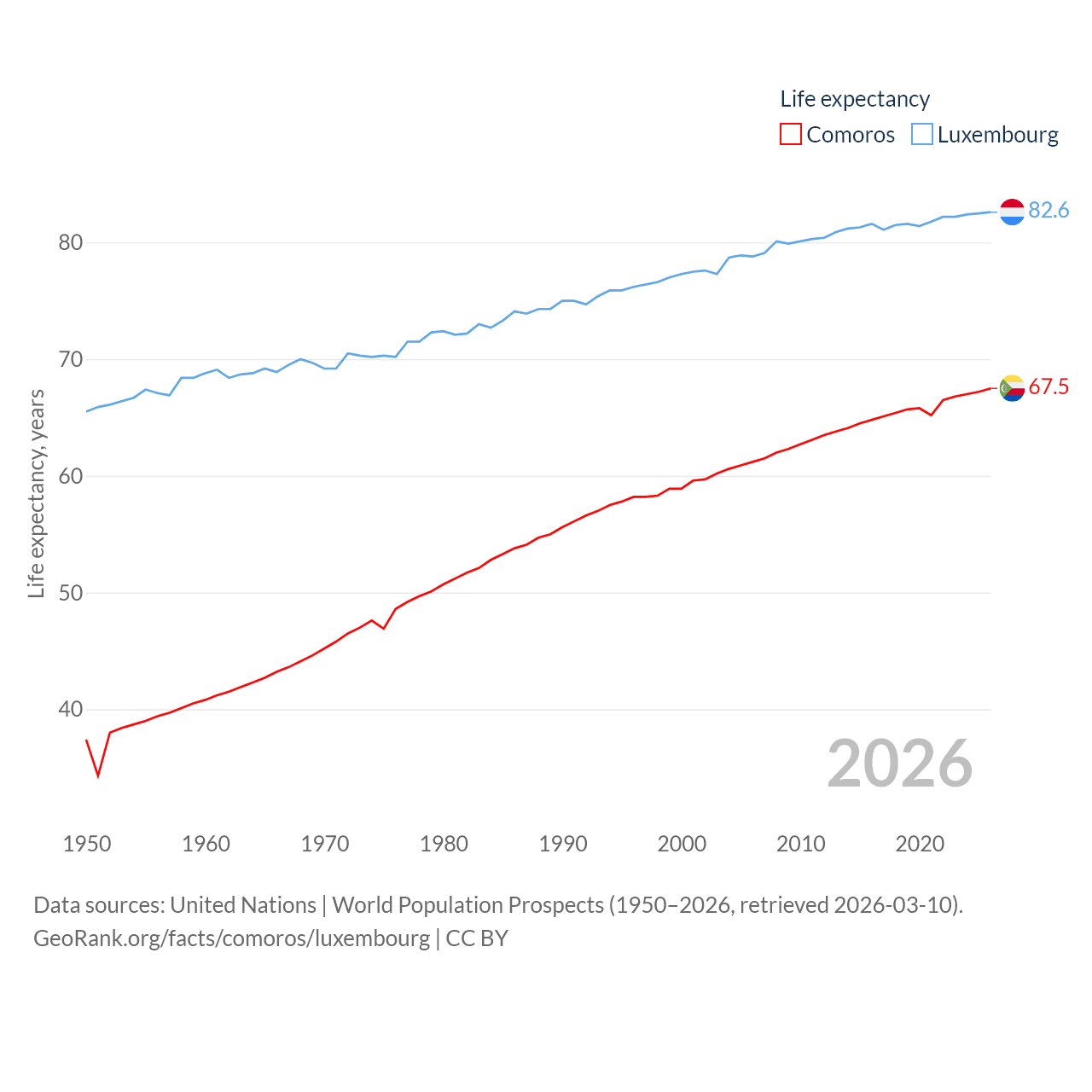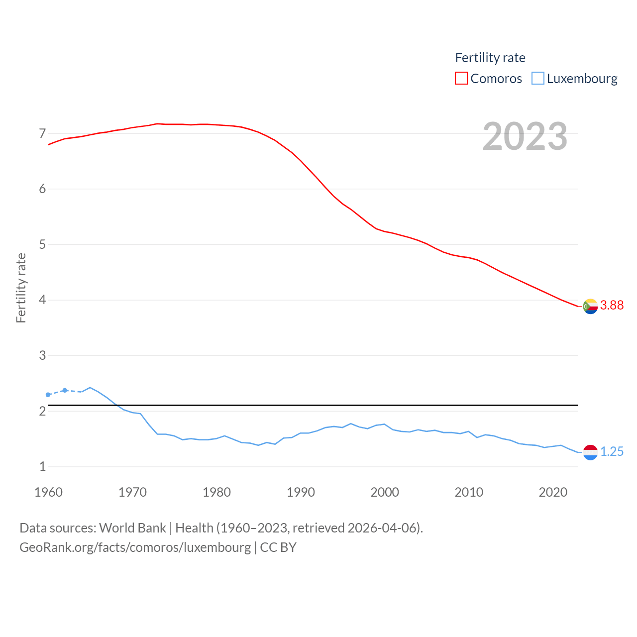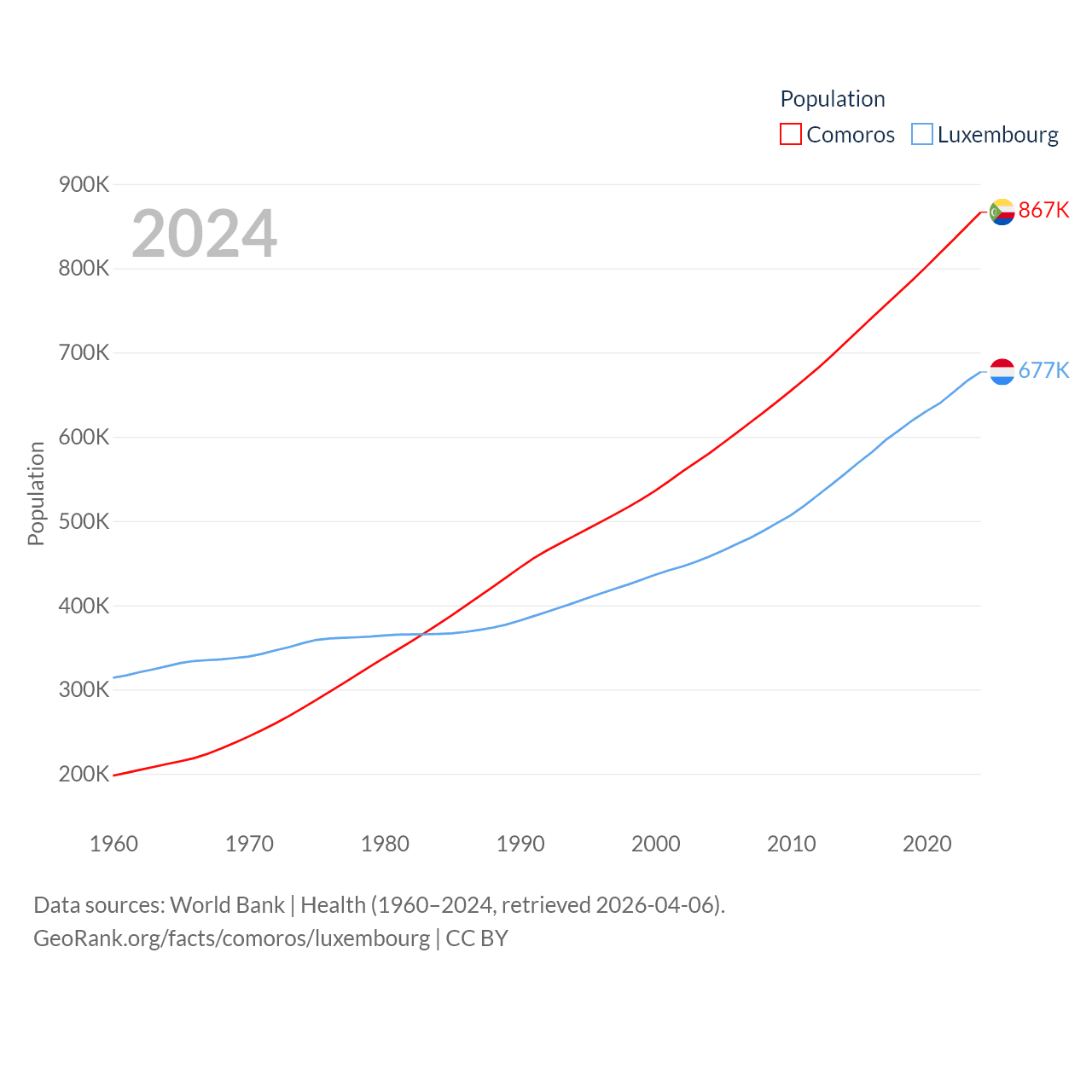 Comoros has a population of 867K (ranked 160/197), compared with 677K in Luxembourg (ranked 164/197). Comoros' land area is 719 sq mi versus 994 sq mi for Luxembourg (ranked 171st vs. 169th).
