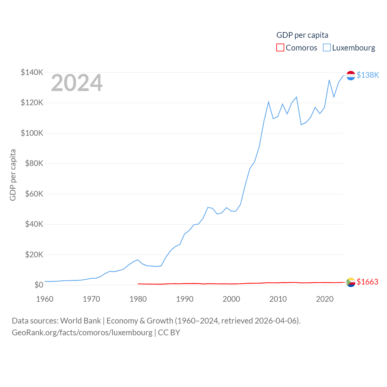 By GDP, Comoros ranks 183/197 ($1.44B) and Luxembourg ranks 74/197 ($93.3B). By GDP per capita, Comoros ranks 161/197 ($1,663), while Luxembourg ranks 3/197 ($137,782).