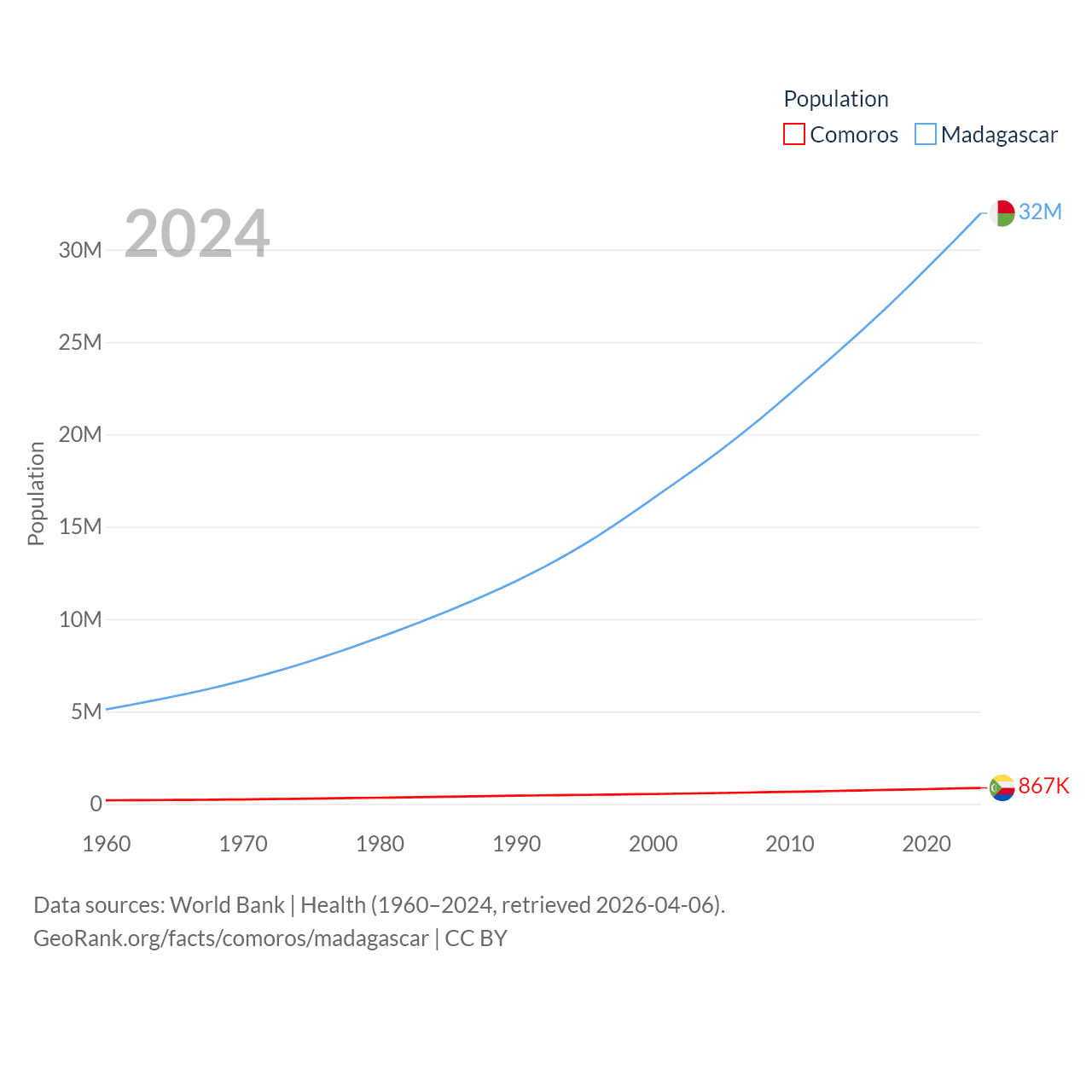 Comoros has a population of 867K (ranked 160/197), compared with 32M in Madagascar (ranked 49/197). Comoros' land area is 719 sq mi versus 224,634 sq mi for Madagascar (ranked 171st vs. 44th).