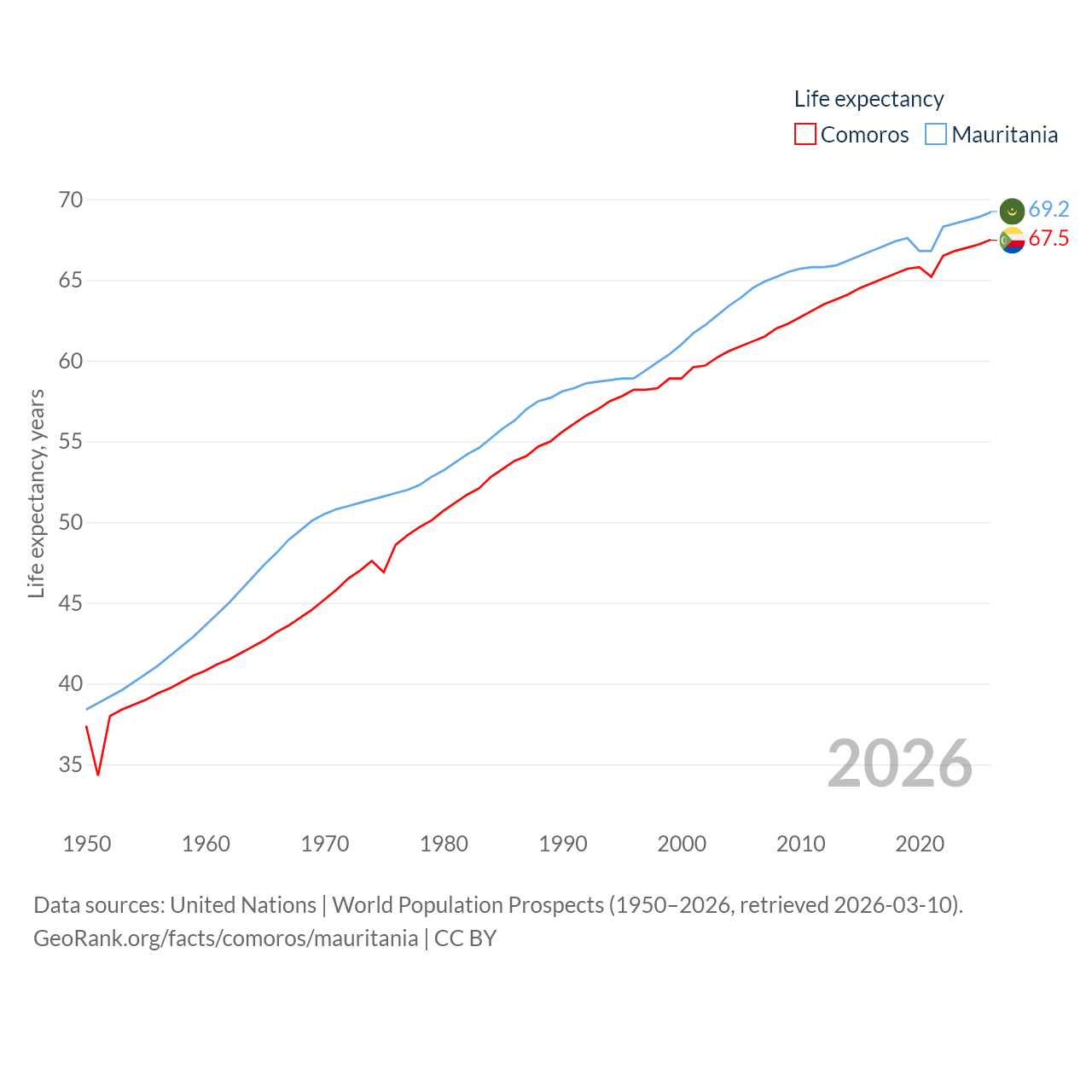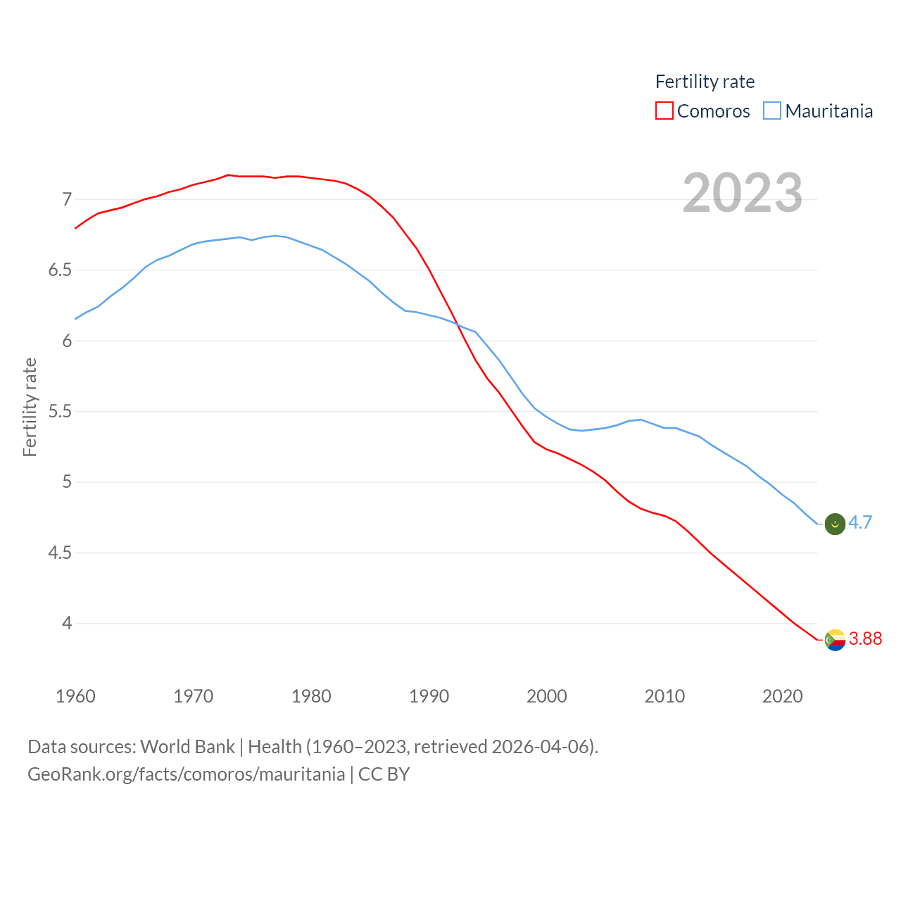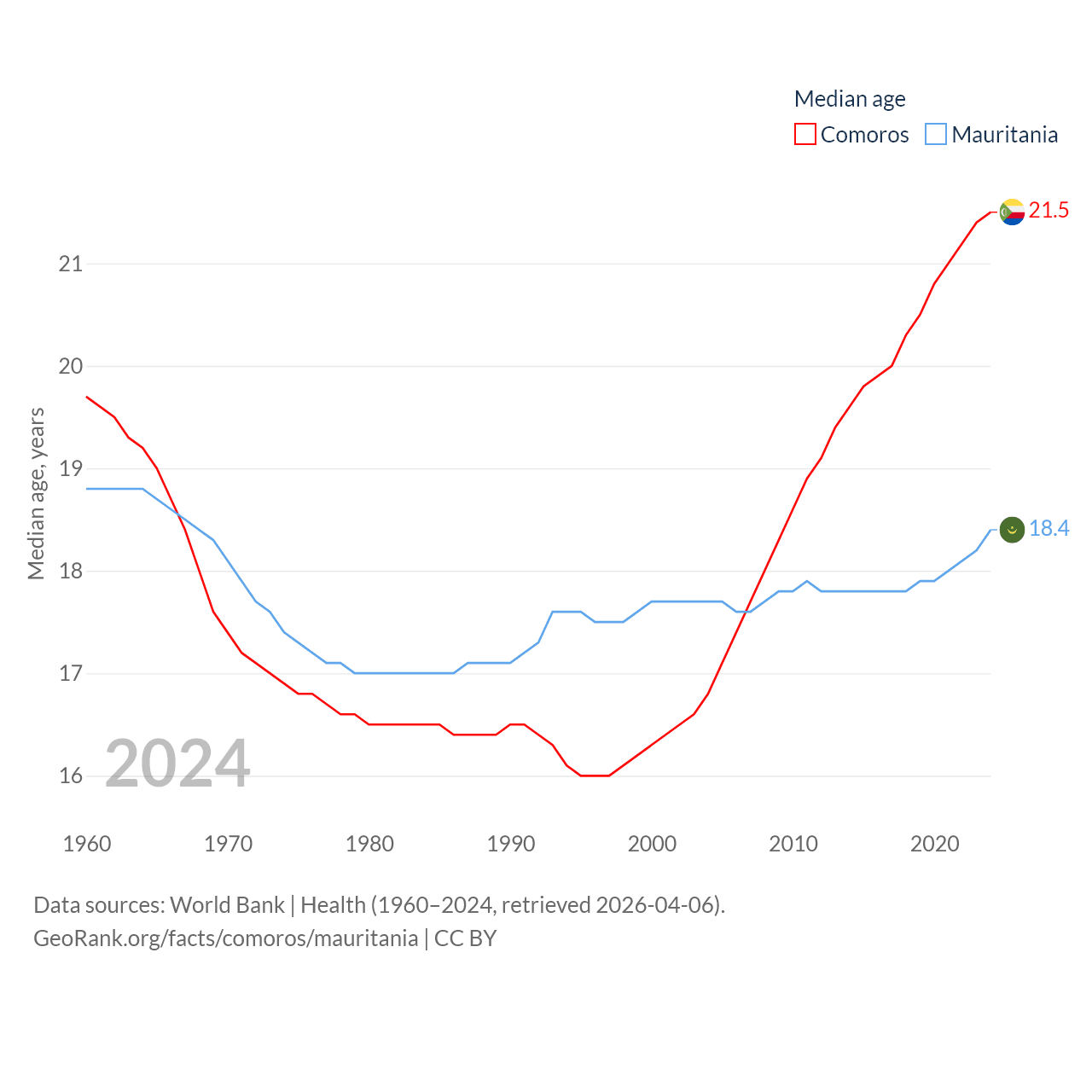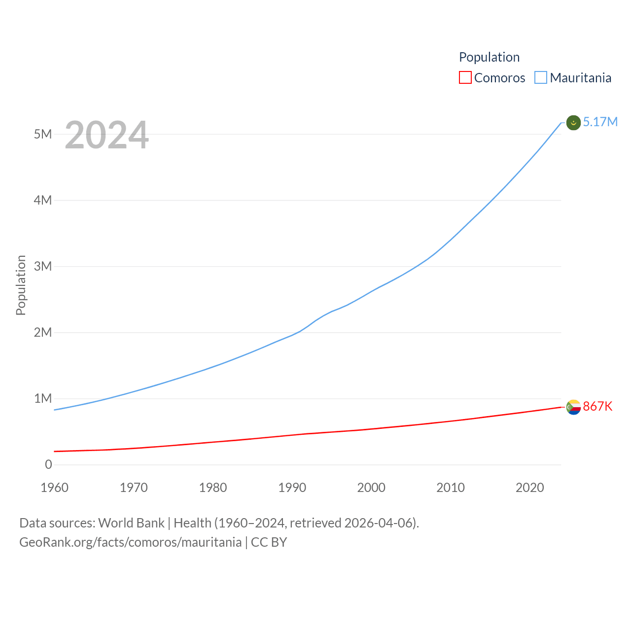 Comoros has a population of 867K (ranked 160/197), compared with 5.17M in Mauritania (ranked 125/197). Comoros' land area is 719 sq mi versus 397,955 sq mi for Mauritania (ranked 171st vs. 28th).