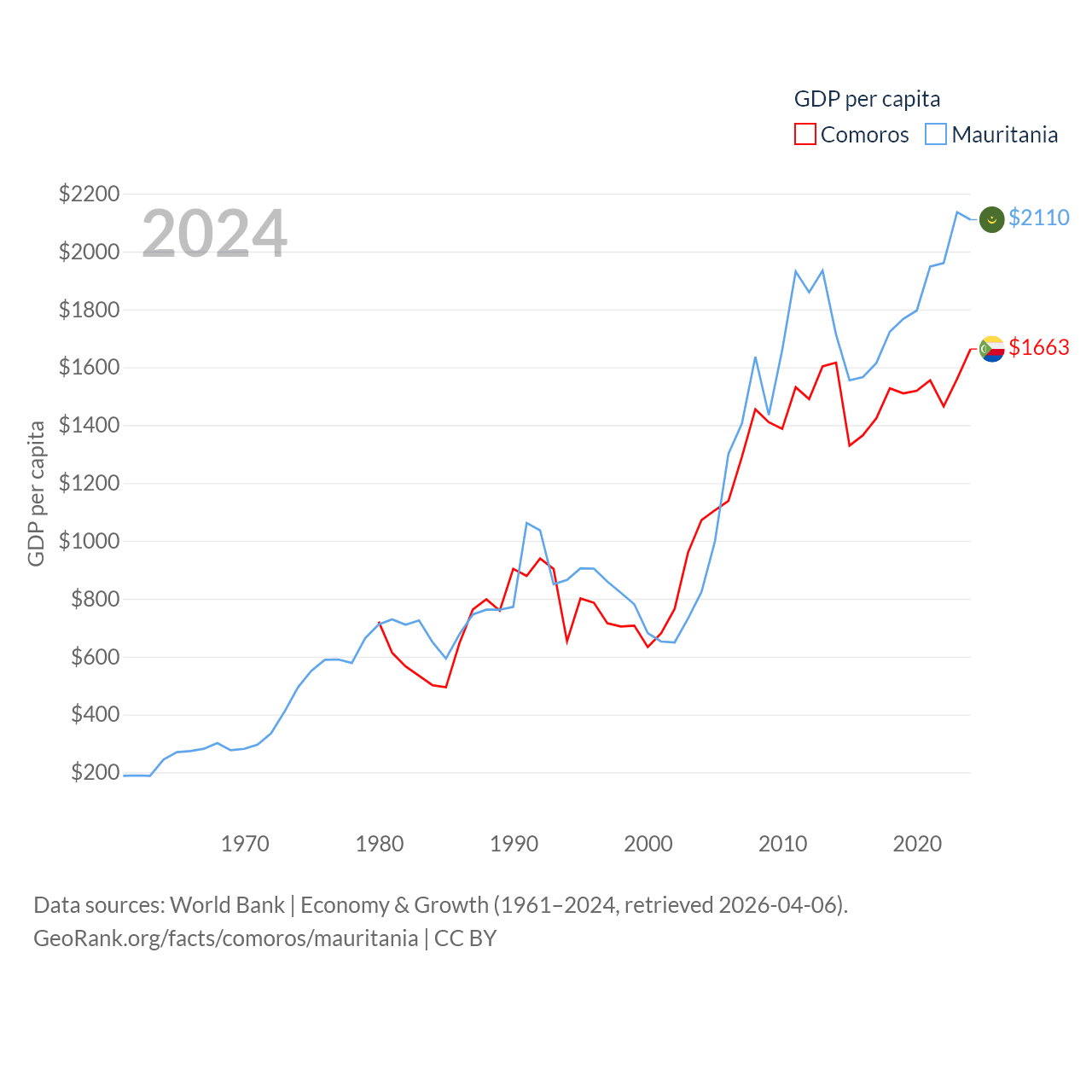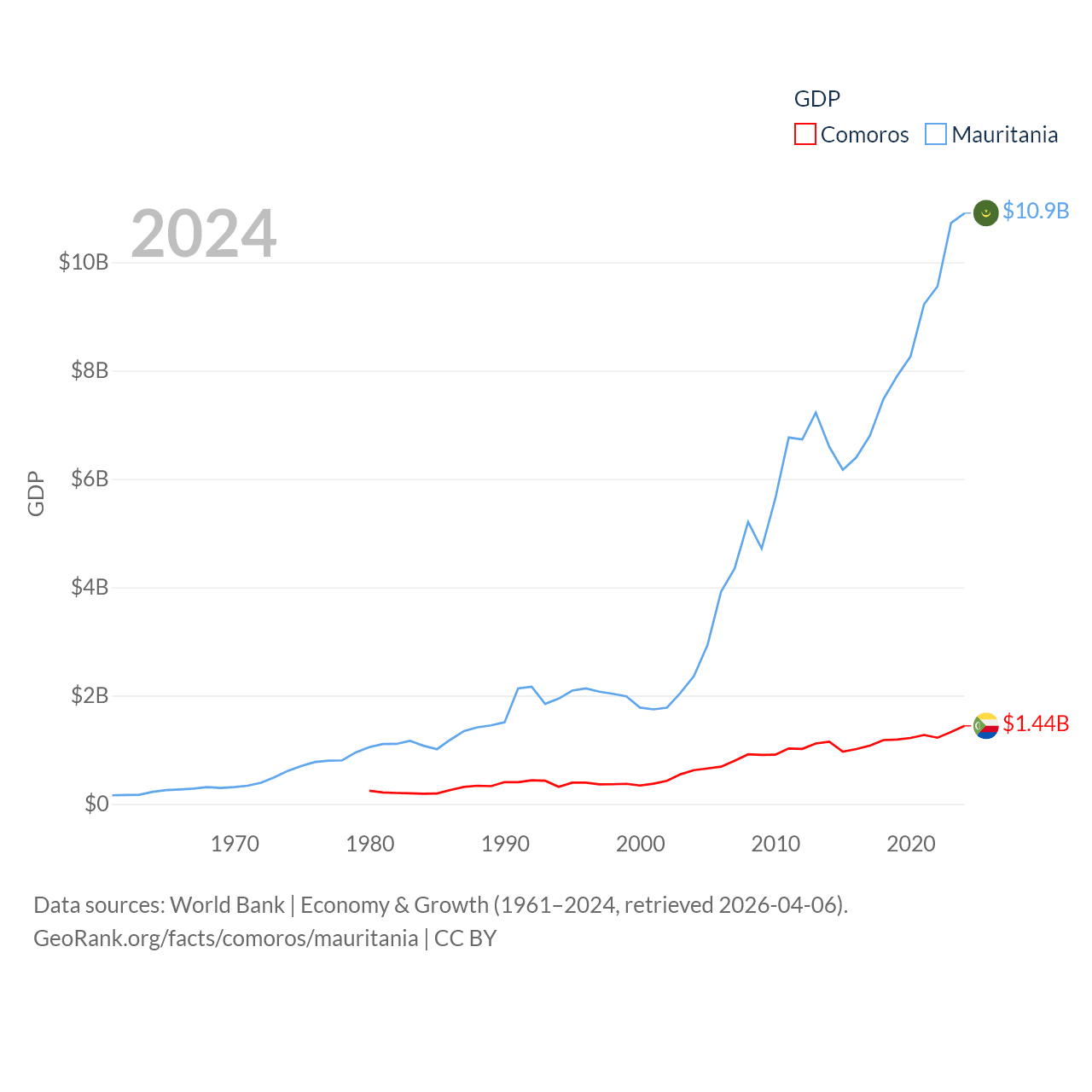 By GDP, Comoros ranks 183/197 ($1.44B) and Mauritania ranks 153/197 ($10.9B). By GDP per capita, Comoros ranks 161/197 ($1,663), while Mauritania ranks 156/197 ($2,110).