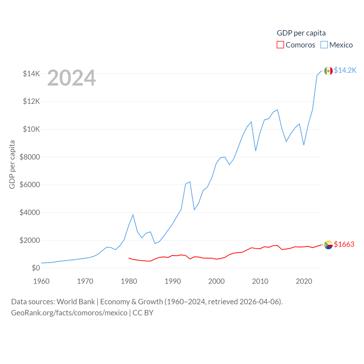 By GDP, Comoros ranks 183/197 ($1.44B) and Mexico ranks 13/197 ($1.86T). By GDP per capita, Comoros ranks 161/197 ($1,663), while Mexico ranks 69/197 ($14,186).