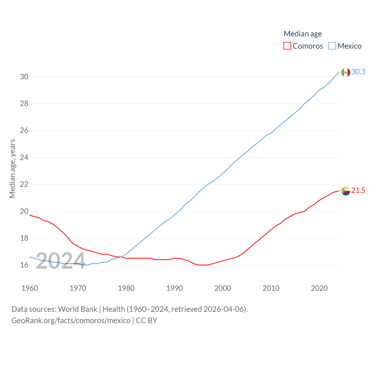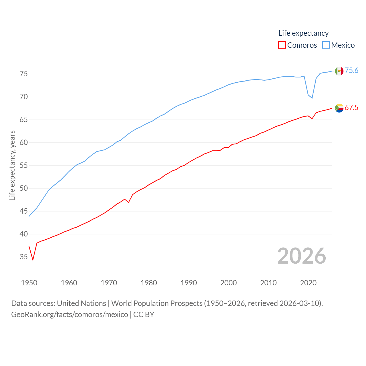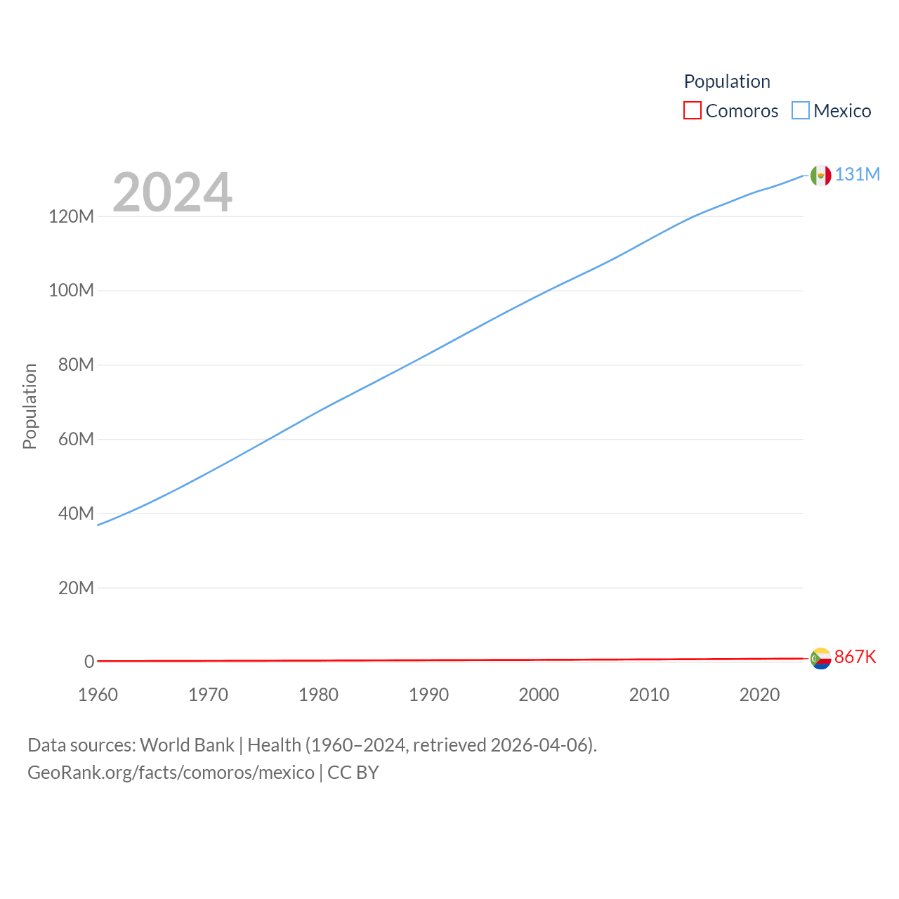 Comoros has a population of 867K (ranked 160/197), compared with 131M in Mexico (ranked 11/197). Comoros' land area is 719 sq mi versus 750,563 sq mi for Mexico (ranked 171st vs. 13th).
