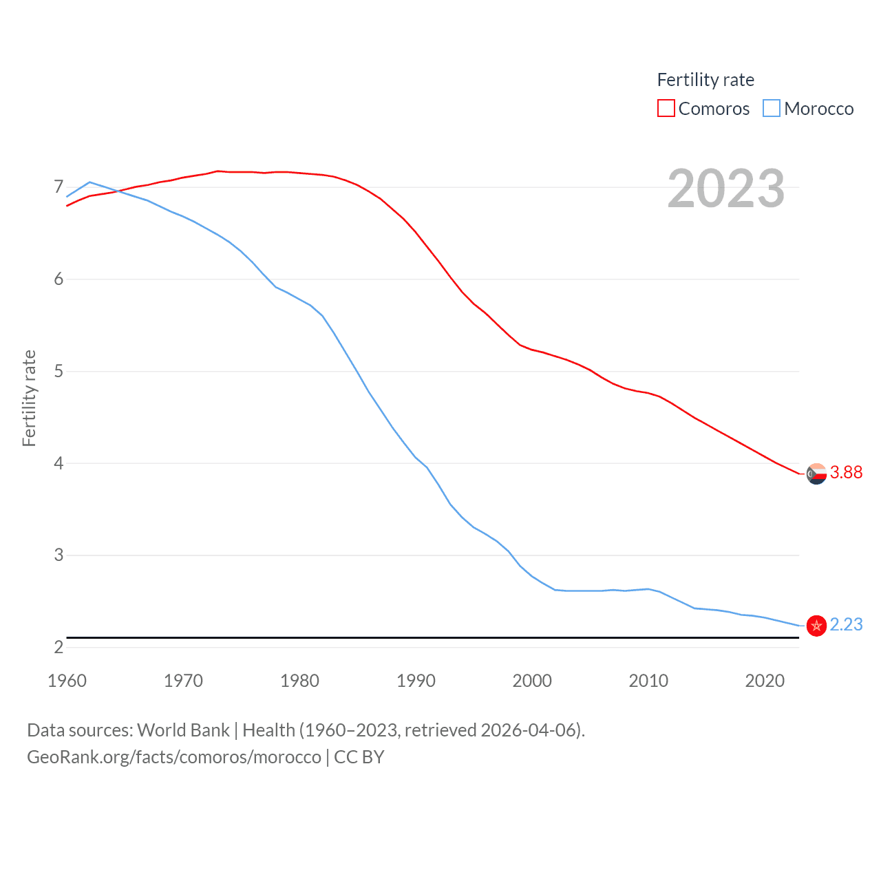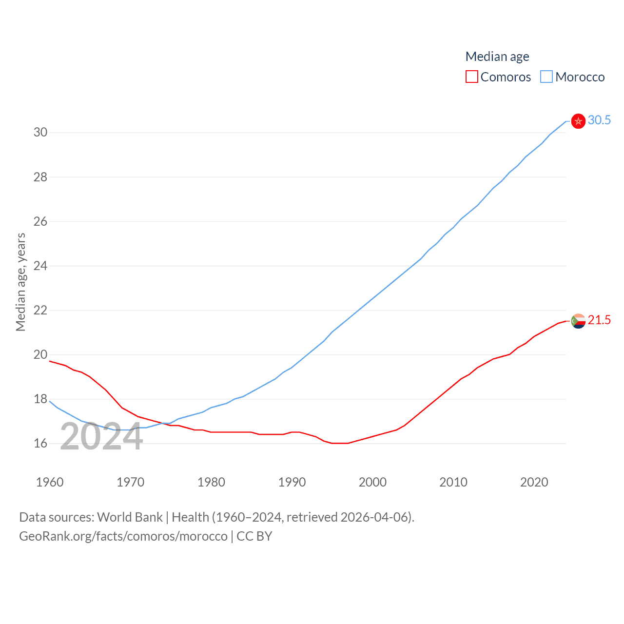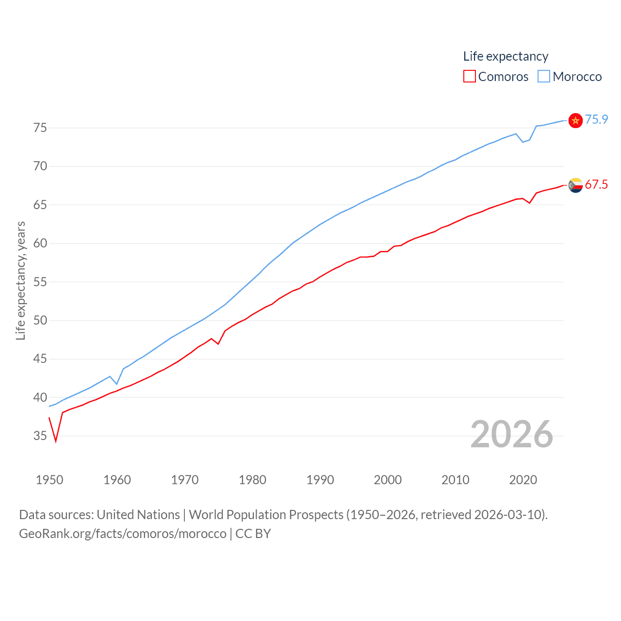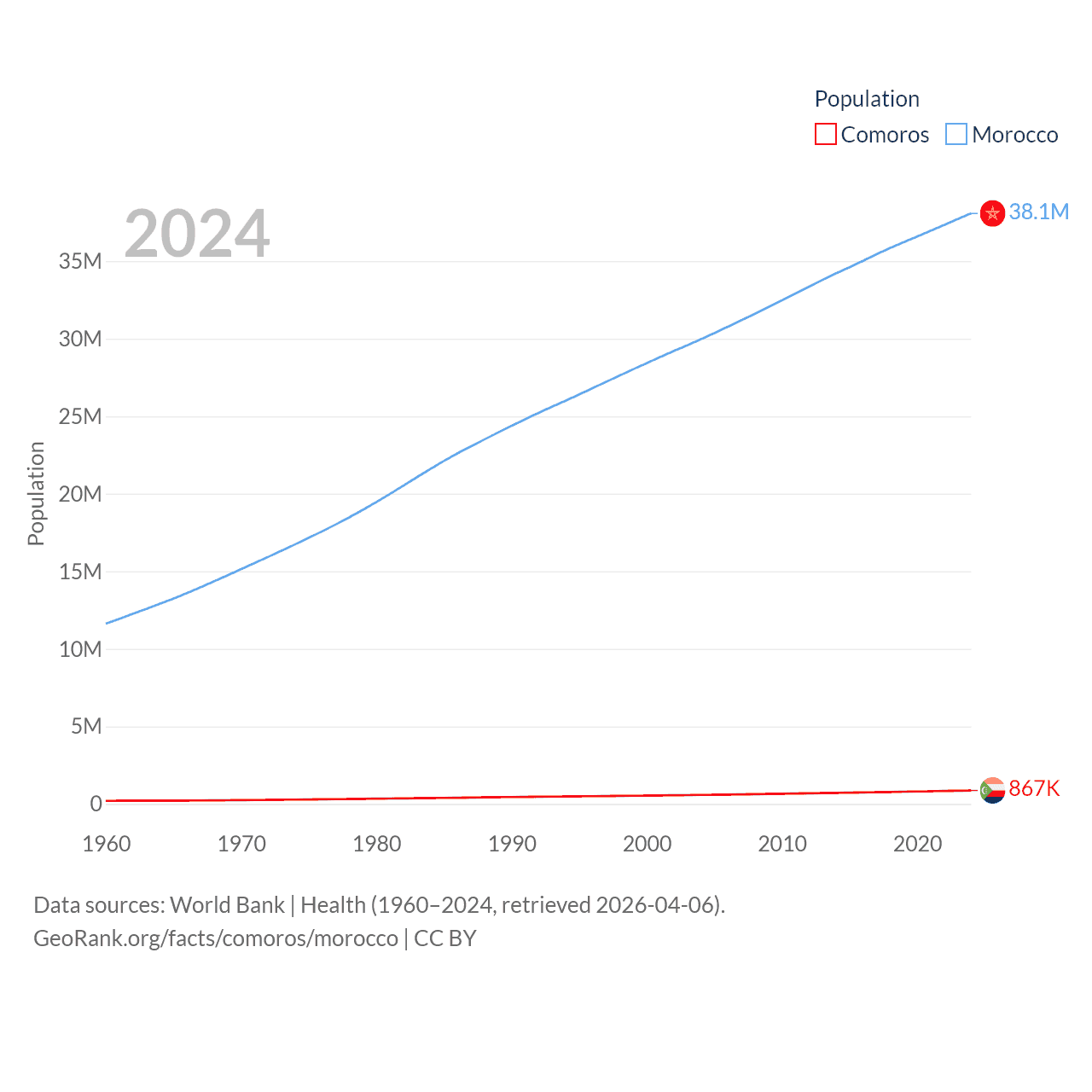 Comoros has a population of 867K (ranked 160/197), compared with 38.1M in Morocco (ranked 39/197). Comoros' land area is 719 sq mi versus 172,317 sq mi for Morocco (ranked 171st vs. 55th).