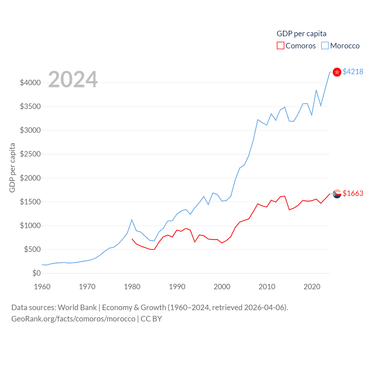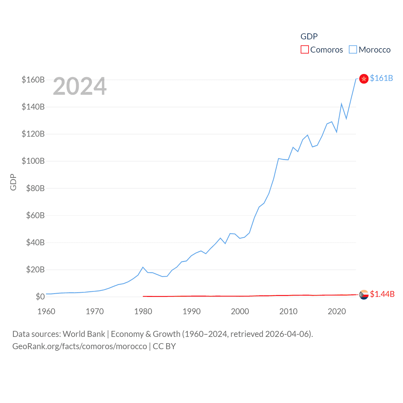 By GDP, Comoros ranks 183/197 ($1.44B) and Morocco ranks 58/197 ($161B). By GDP per capita, Comoros ranks 161/197 ($1,663), while Morocco ranks 127/197 ($4,218).