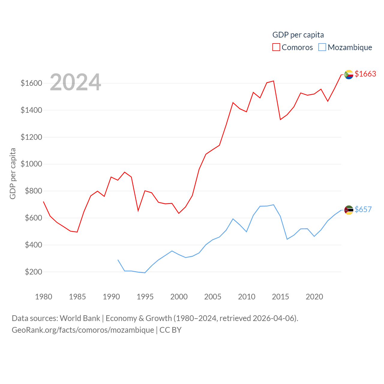By GDP, Comoros ranks 183/197 ($1.44B) and Mozambique ranks 123/197 ($22.7B). By GDP per capita, Comoros ranks 161/197 ($1,663), while Mozambique ranks 189/197 ($657).