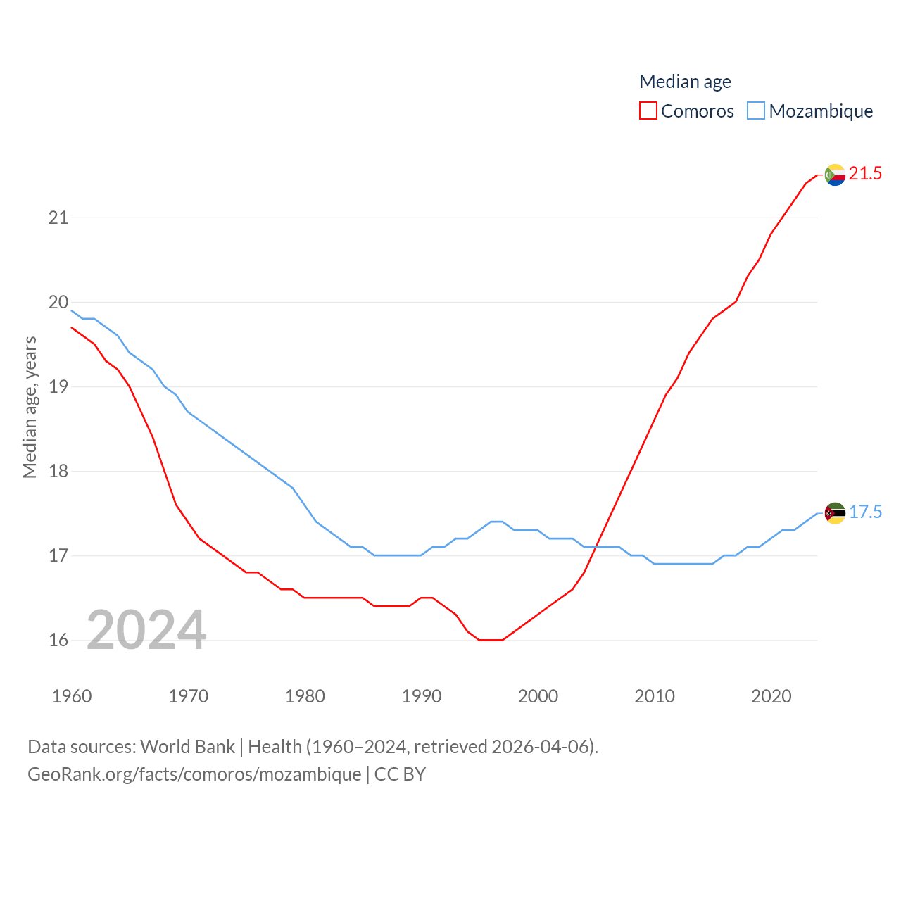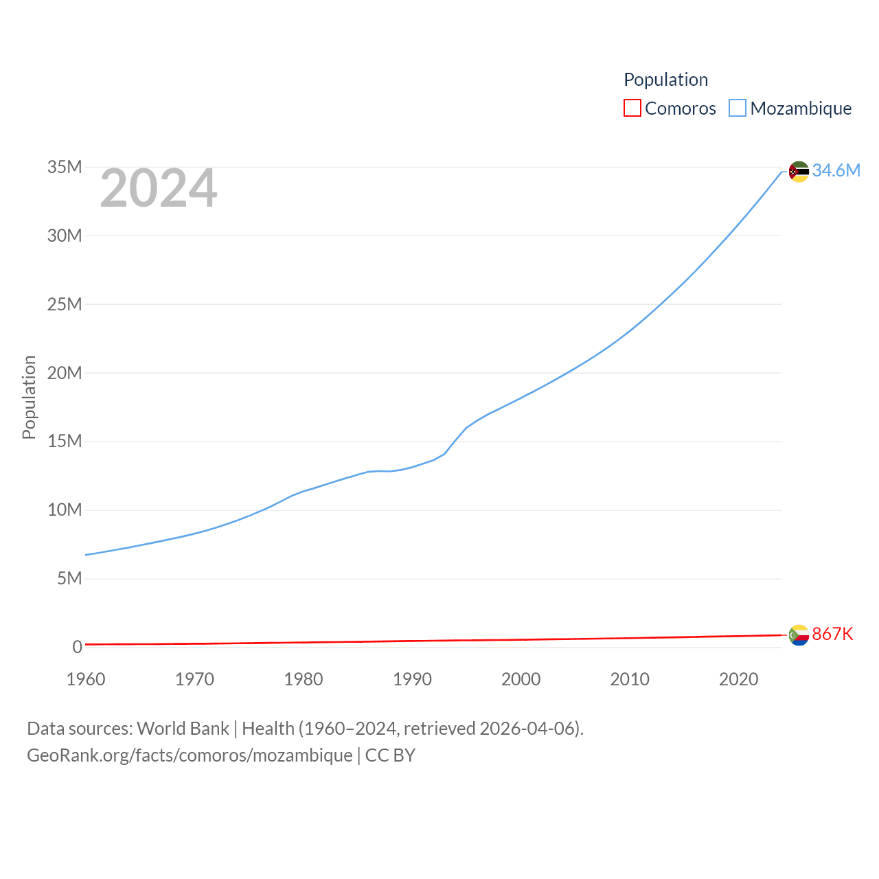 Comoros has a population of 867K (ranked 160/197), compared with 34.6M in Mozambique (ranked 46/197). Comoros' land area is 719 sq mi versus 303,623 sq mi for Mozambique (ranked 171st vs. 34th).