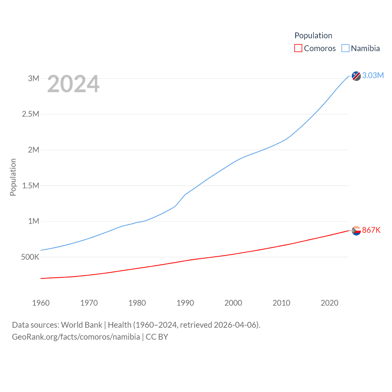 Comoros has a population of 867K (ranked 160/197), compared with 3.03M in Namibia (ranked 136/197). Comoros' land area is 719 sq mi versus 317,874 sq mi for Namibia (ranked 171st vs. 33rd).