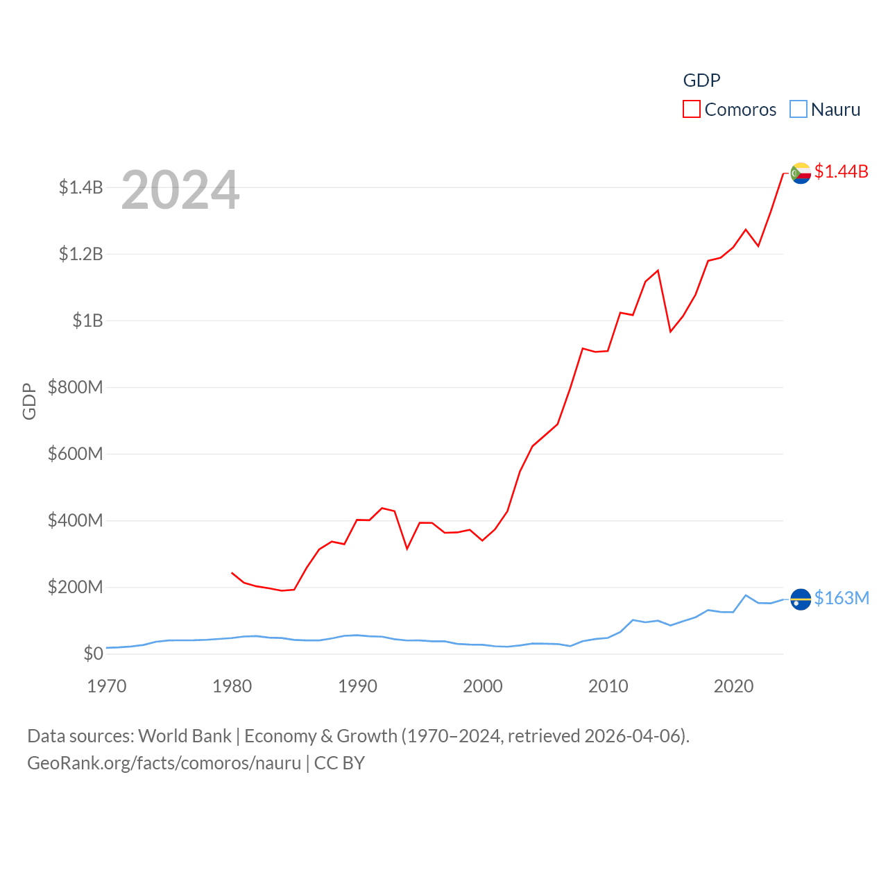 By GDP, Comoros ranks 183/197 ($1.44B) and Nauru ranks 195/197 ($163M). By GDP per capita, Comoros ranks 161/197 ($1,663), while Nauru ranks 74/197 ($13,609).
