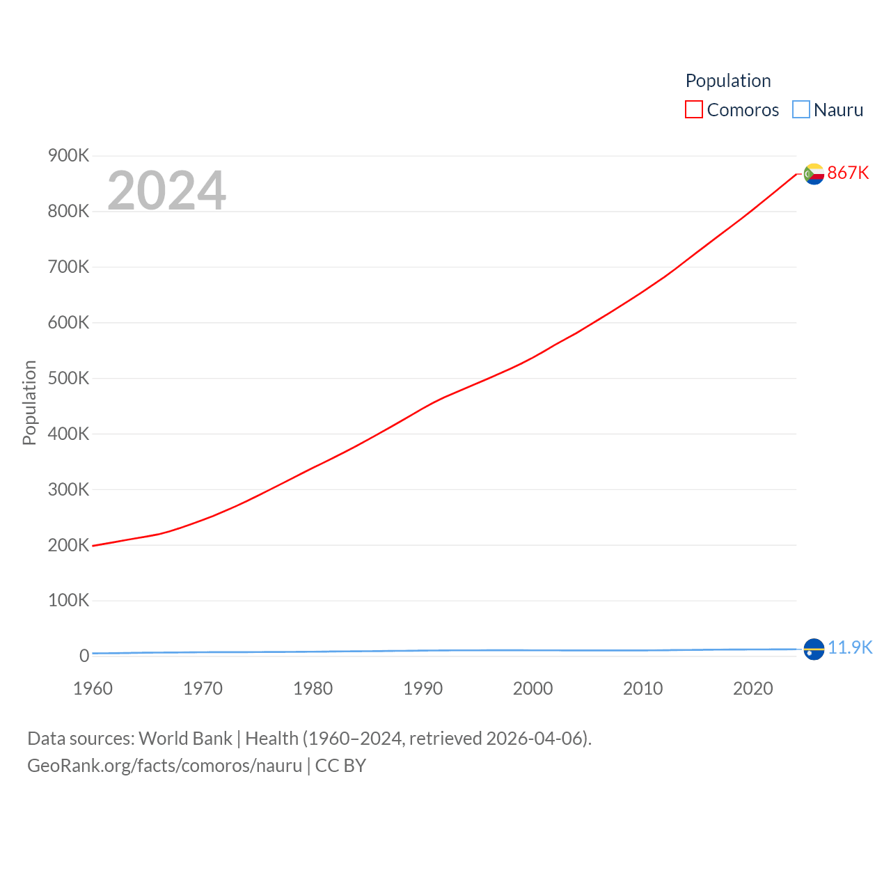 Comoros has a population of 867K (ranked 160/197), compared with 11.9K in Nauru (ranked 195/197). Comoros' land area is 719 sq mi versus 7.72 sq mi for Nauru (ranked 171st vs. 195th).