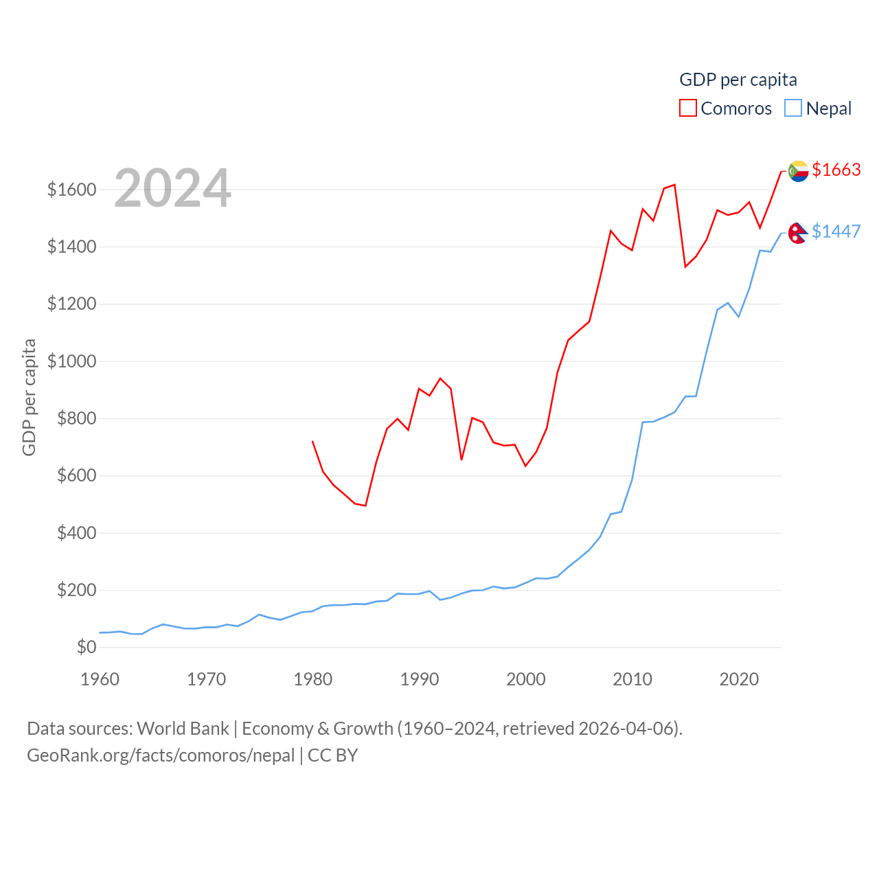 By GDP, Comoros ranks 183/197 ($1.44B) and Nepal ranks 101/197 ($42.9B). By GDP per capita, Comoros ranks 161/197 ($1,663), while Nepal ranks 164/197 ($1,447).