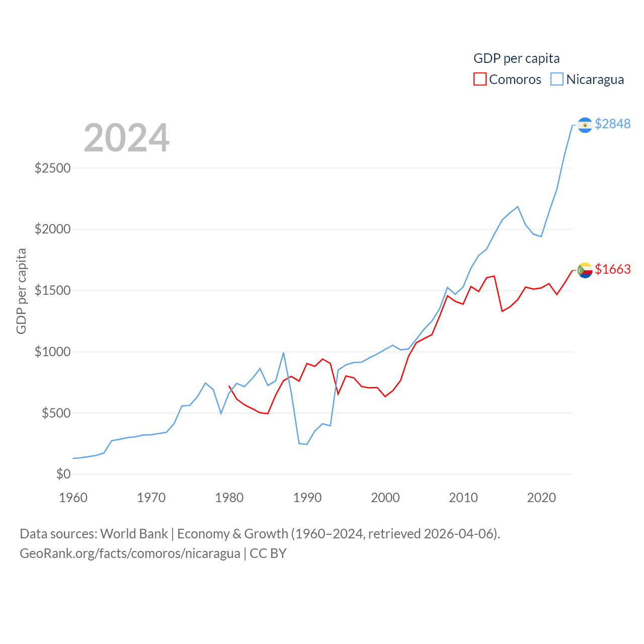 By GDP, Comoros ranks 183/197 ($1.44B) and Nicaragua ranks 131/197 ($19.7B). By GDP per capita, Comoros ranks 161/197 ($1,663), while Nicaragua ranks 141/197 ($2,848).
