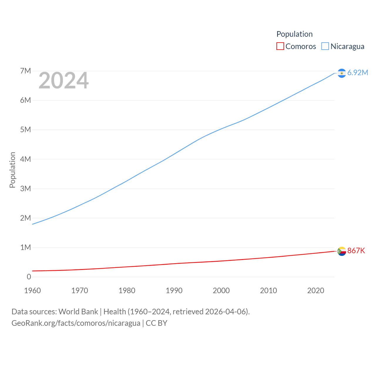 Comoros has a population of 867K (ranked 160/197), compared with 6.92M in Nicaragua (ranked 108/197). Comoros' land area is 719 sq mi versus 46,464 sq mi for Nicaragua (ranked 171st vs. 98th).