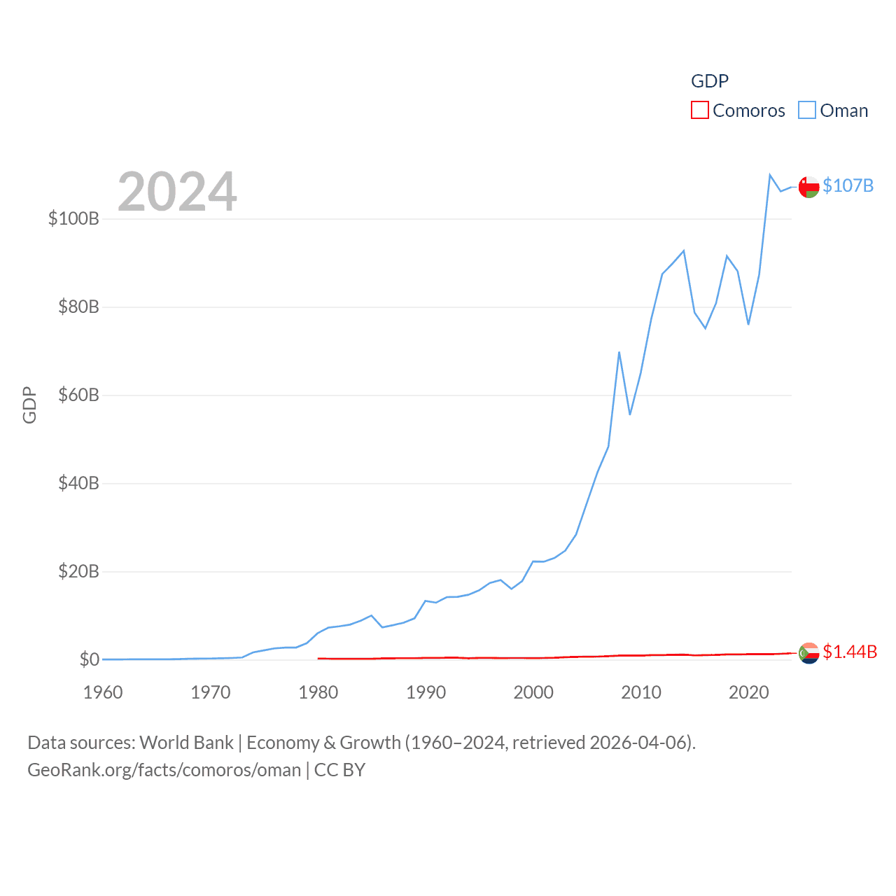 By GDP, Comoros ranks 183/197 ($1.44B) and Oman ranks 70/197 ($107B). By GDP per capita, Comoros ranks 161/197 ($1,663), while Oman ranks 57/197 ($20,285).