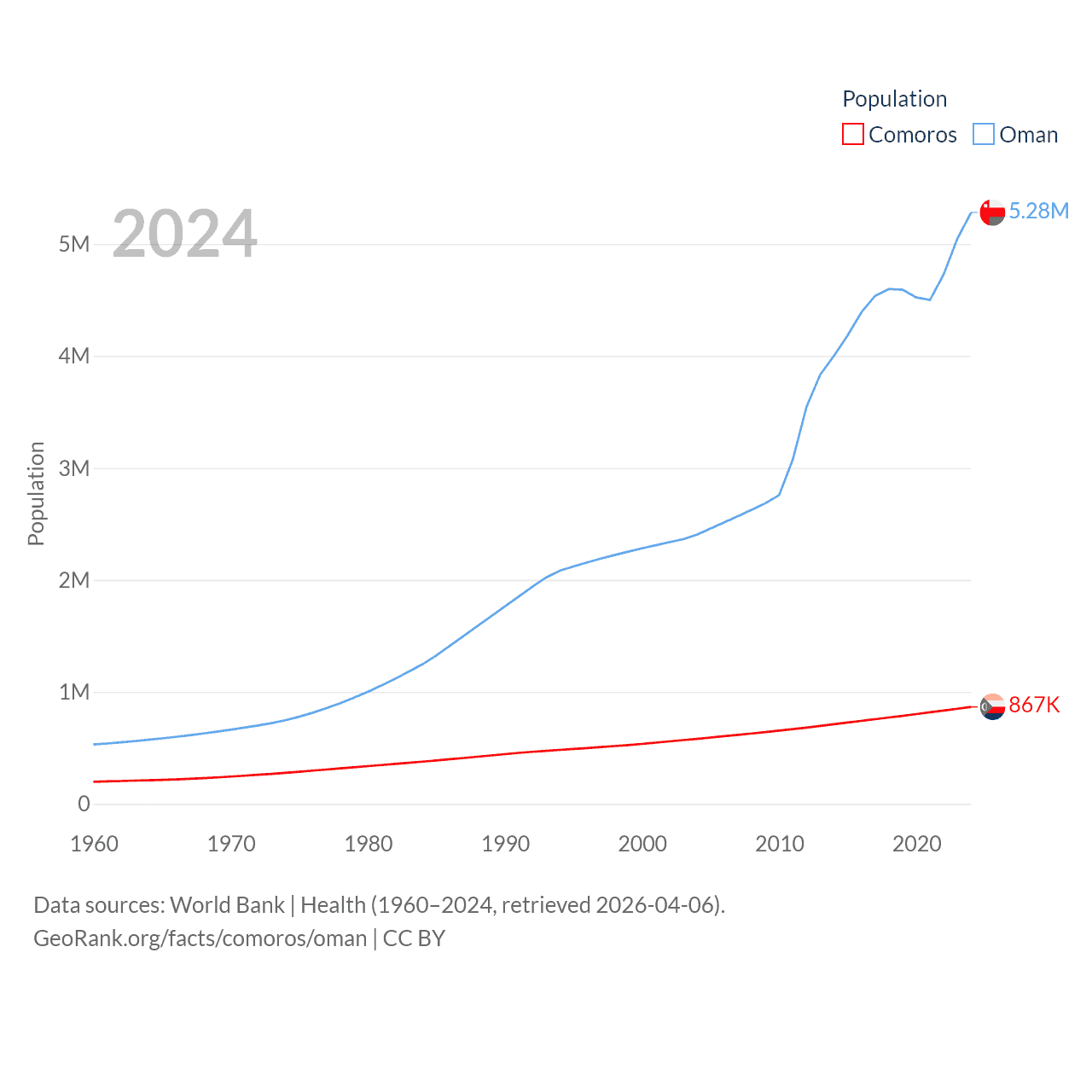 Comoros has a population of 867K (ranked 160/197), compared with 5.28M in Oman (ranked 124/197). Comoros' land area is 719 sq mi versus 119,499 sq mi for Oman (ranked 171st vs. 68th).