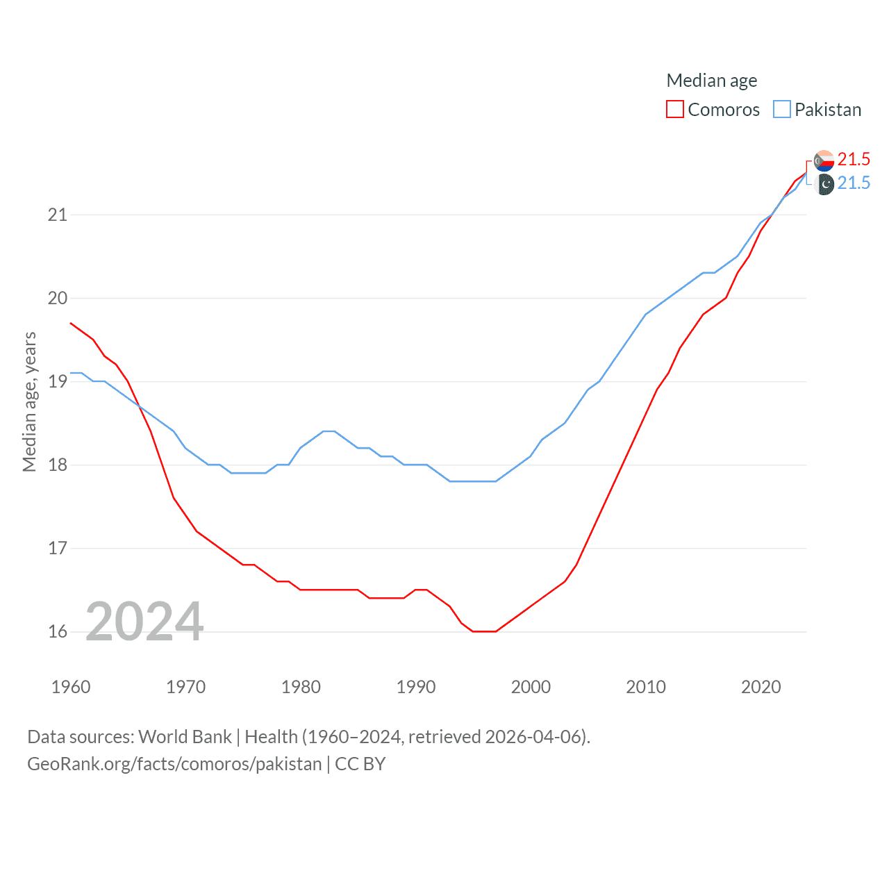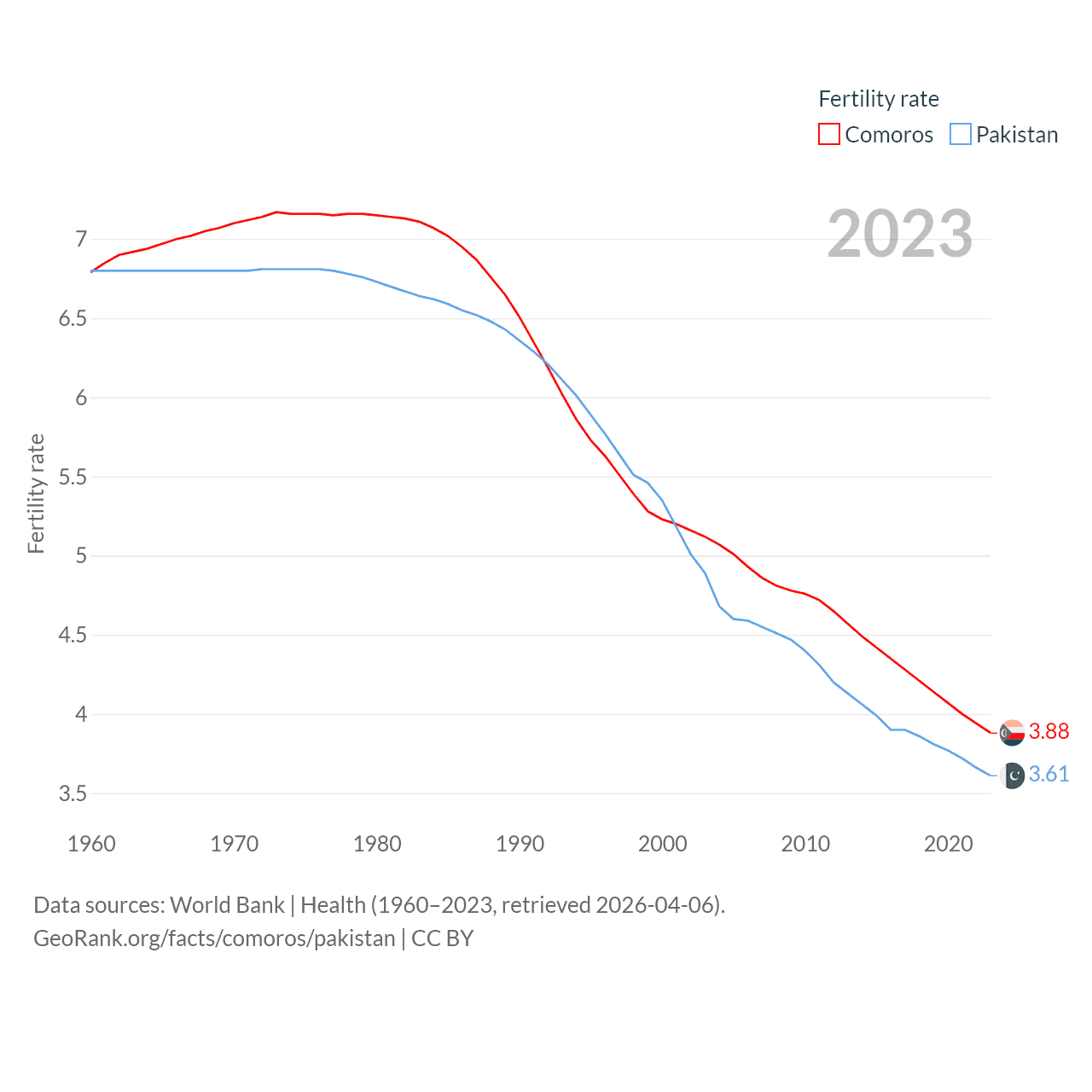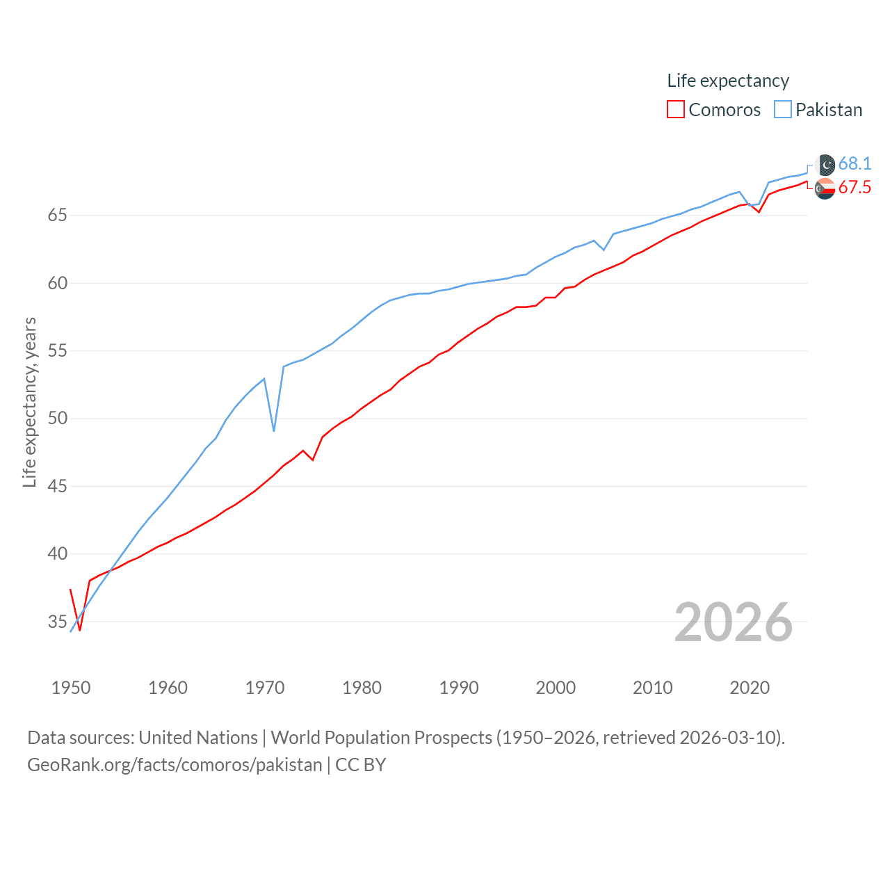 Comoros has a population of 867K (ranked 160/197), compared with 251M in Pakistan (ranked 5/197). Comoros' land area is 719 sq mi versus 297,638 sq mi for Pakistan (ranked 171st vs. 35th).