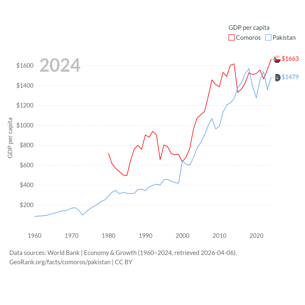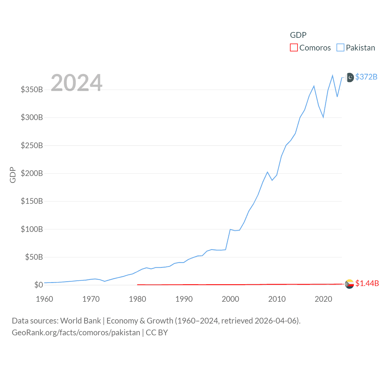 By GDP, Comoros ranks 183/197 ($1.44B) and Pakistan ranks 43/197 ($372B). By GDP per capita, Comoros ranks 161/197 ($1,663), while Pakistan ranks 163/197 ($1,479).