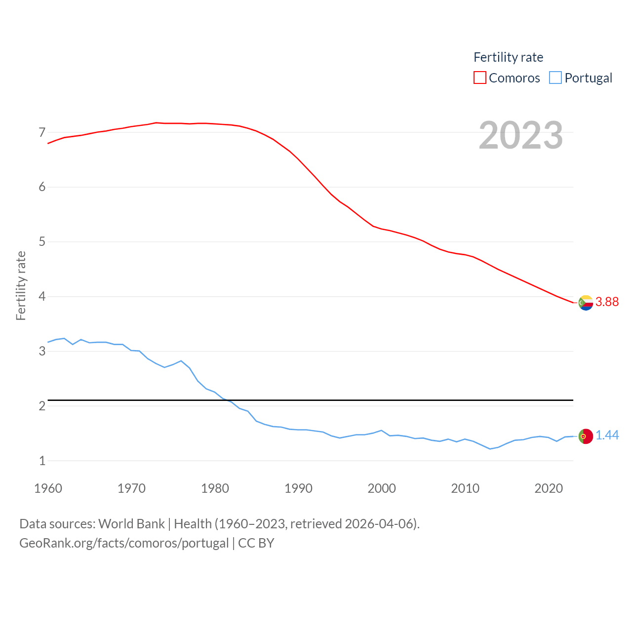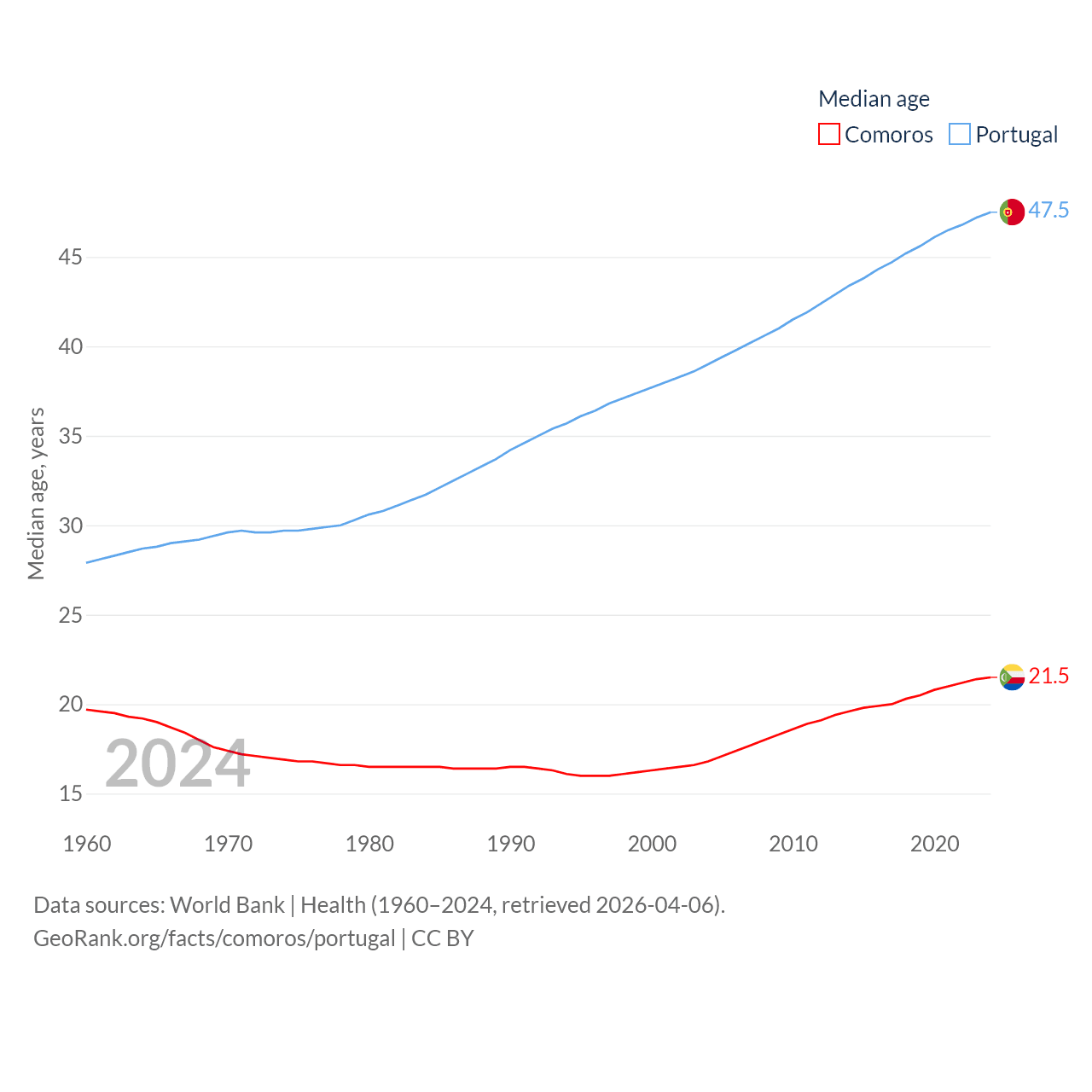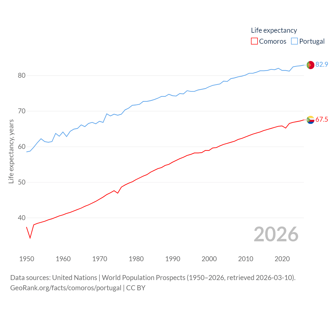 Comoros has a population of 867K (ranked 160/197), compared with 10.7M in Portugal (ranked 90/197). Comoros' land area is 719 sq mi versus 35,369 sq mi for Portugal (ranked 171st vs. 108th).