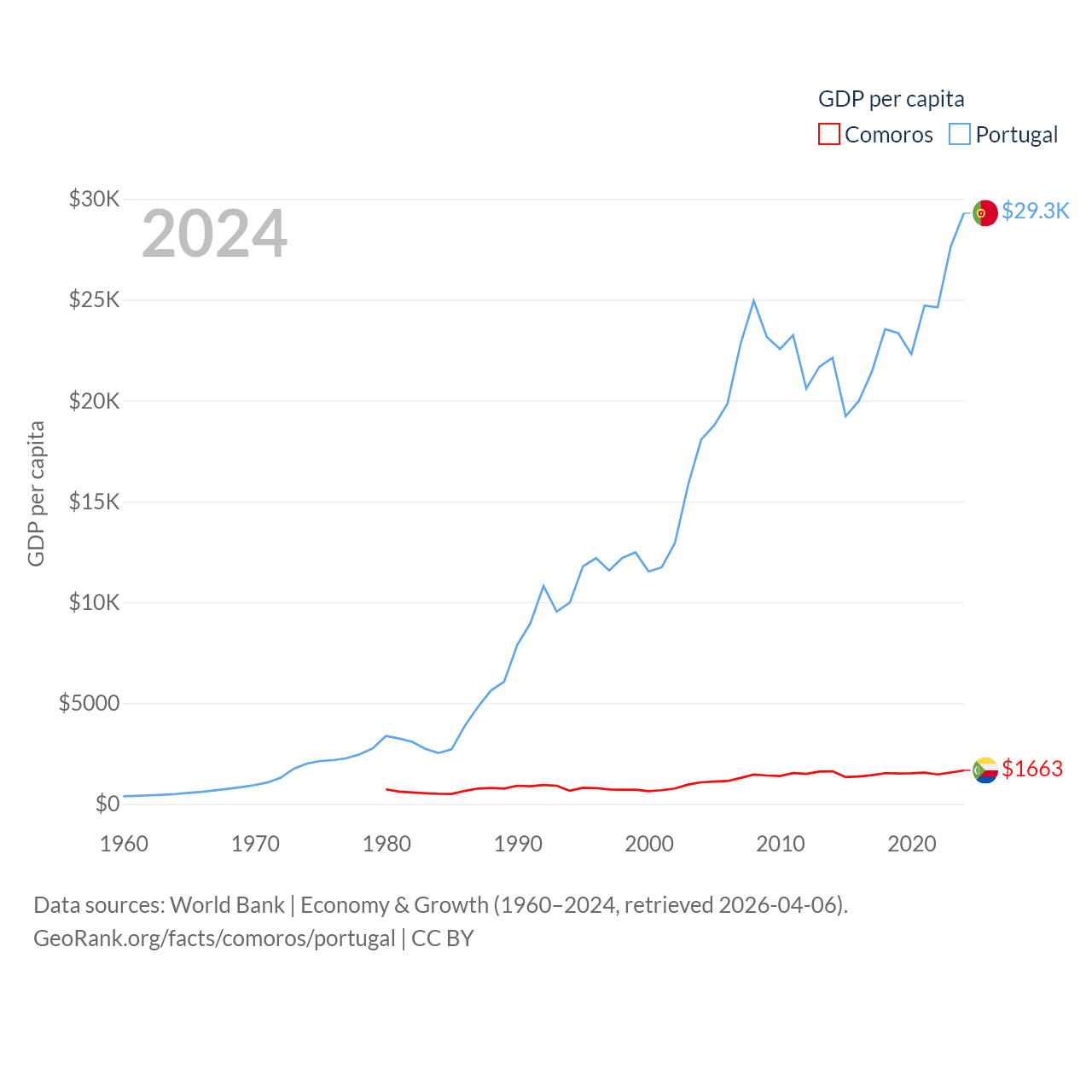 By GDP, Comoros ranks 183/197 ($1.44B) and Portugal ranks 46/197 ($313B). By GDP per capita, Comoros ranks 161/197 ($1,663), while Portugal ranks 44/197 ($29,292).