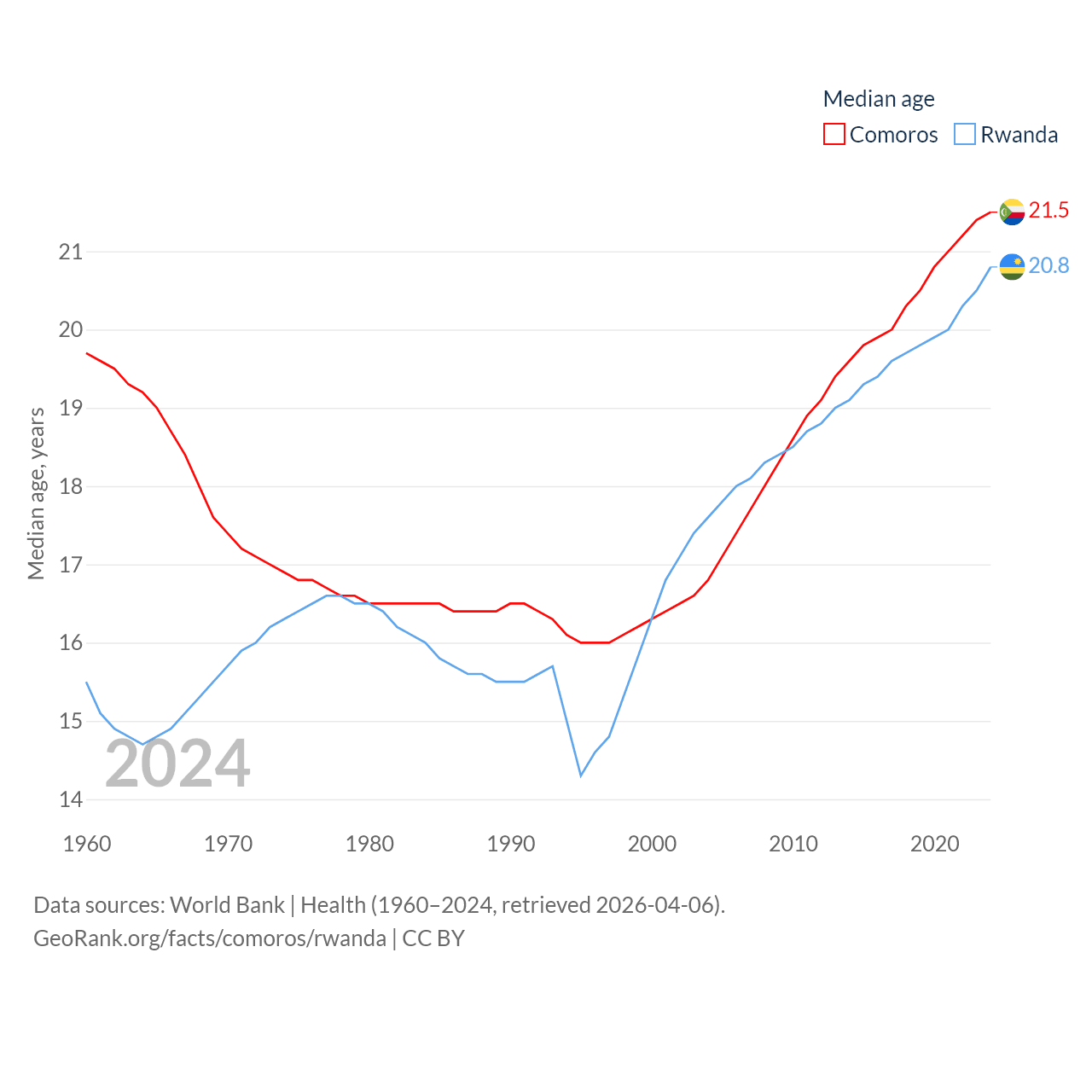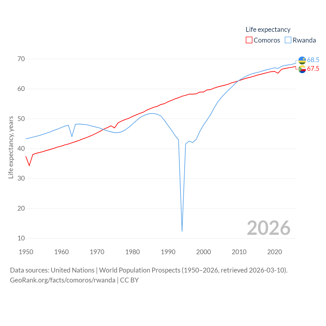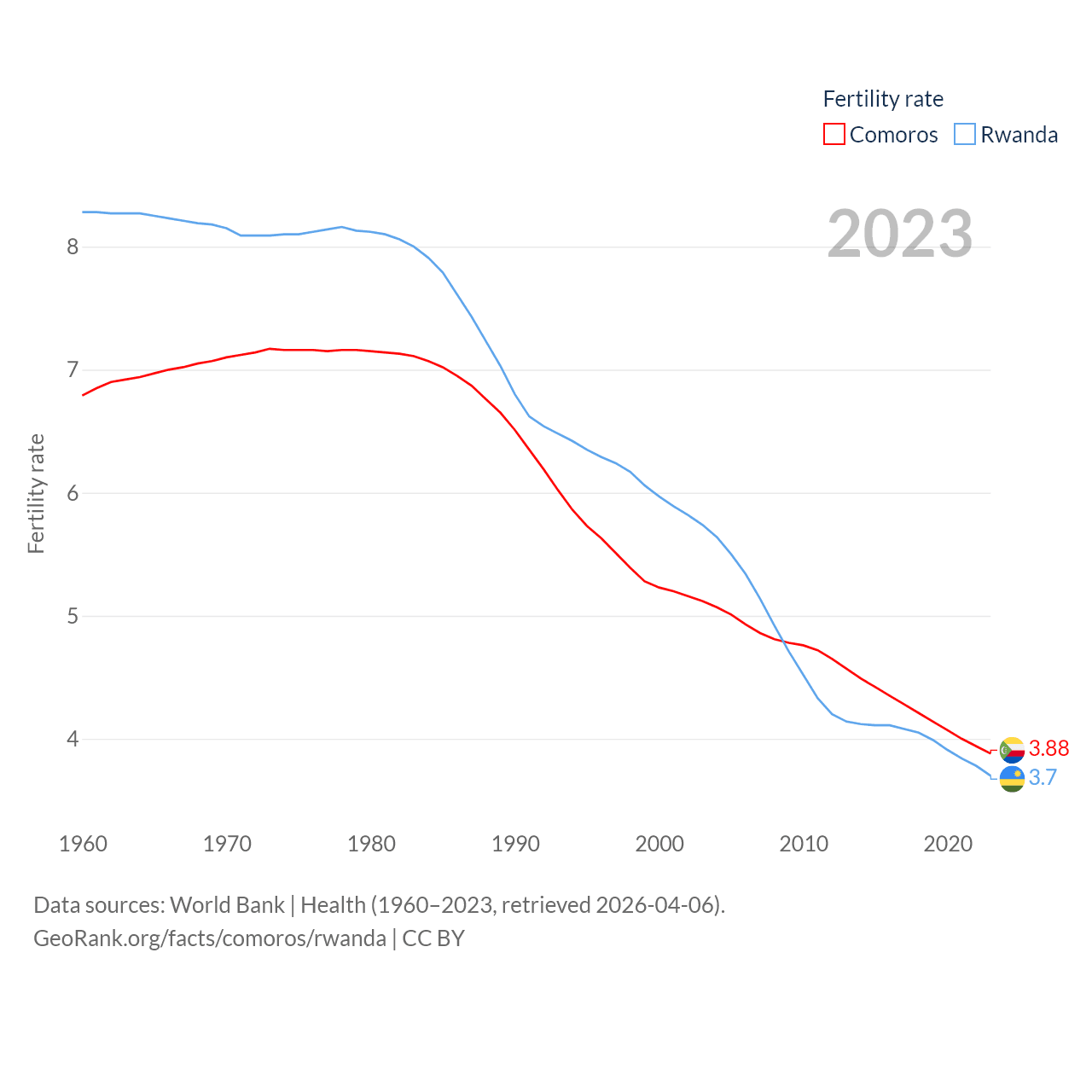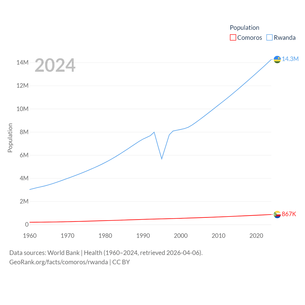Comoros has a population of 867K (ranked 160/197), compared with 14.3M in Rwanda (ranked 77/197). Comoros' land area is 719 sq mi versus 9,525 sq mi for Rwanda (ranked 171st vs. 146th).