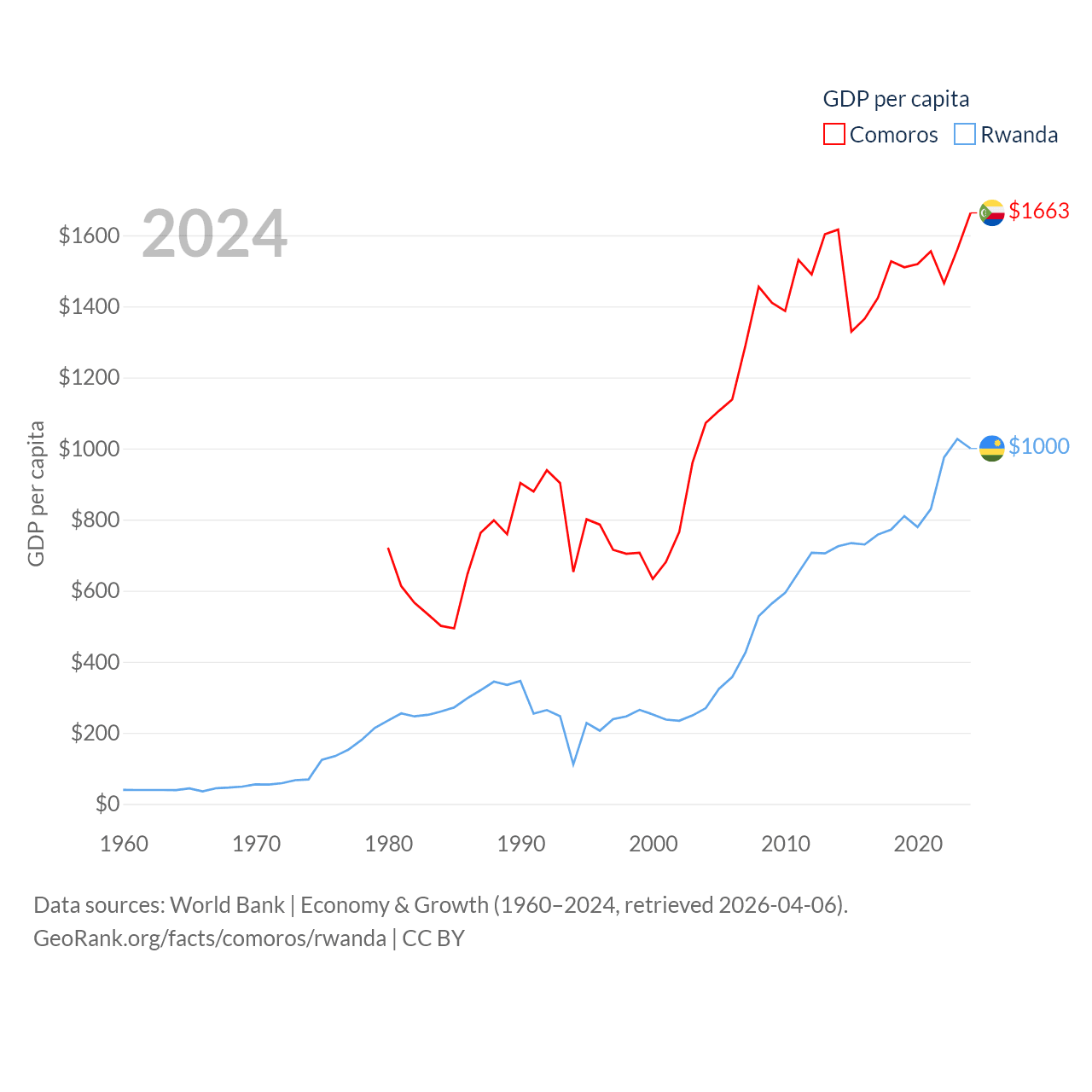 By GDP, Comoros ranks 183/197 ($1.44B) and Rwanda ranks 144/197 ($14.3B). By GDP per capita, Comoros ranks 161/197 ($1,663), while Rwanda ranks 178/197 ($1,000).