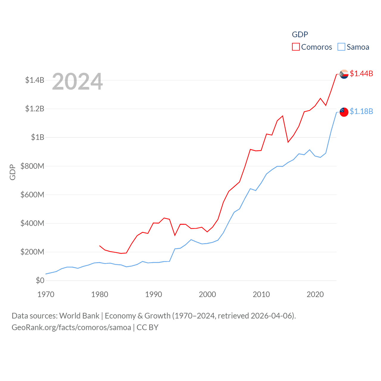 By GDP, Comoros ranks 183/197 ($1.44B) and Samoa ranks 185/197 ($1.18B). By GDP per capita, Comoros ranks 161/197 ($1,663), while Samoa ranks 117/197 ($5,393).