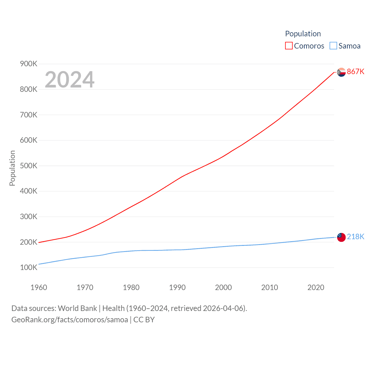 Comoros has a population of 867K (ranked 160/197), compared with 218K in Samoa (ranked 177/197). Comoros' land area is 719 sq mi versus 1,073 sq mi for Samoa (ranked 171st vs. 168th).
