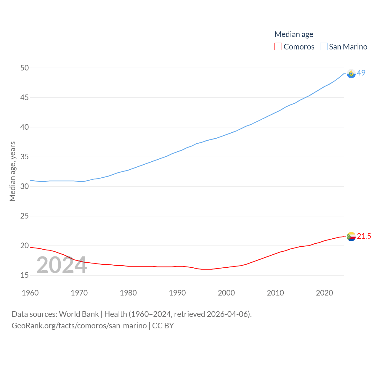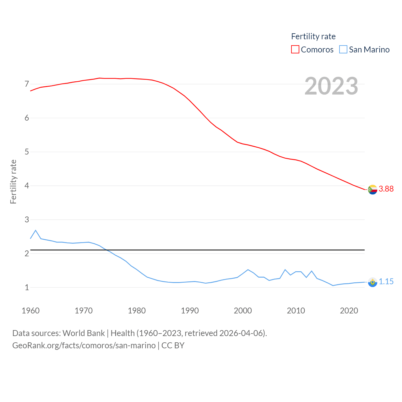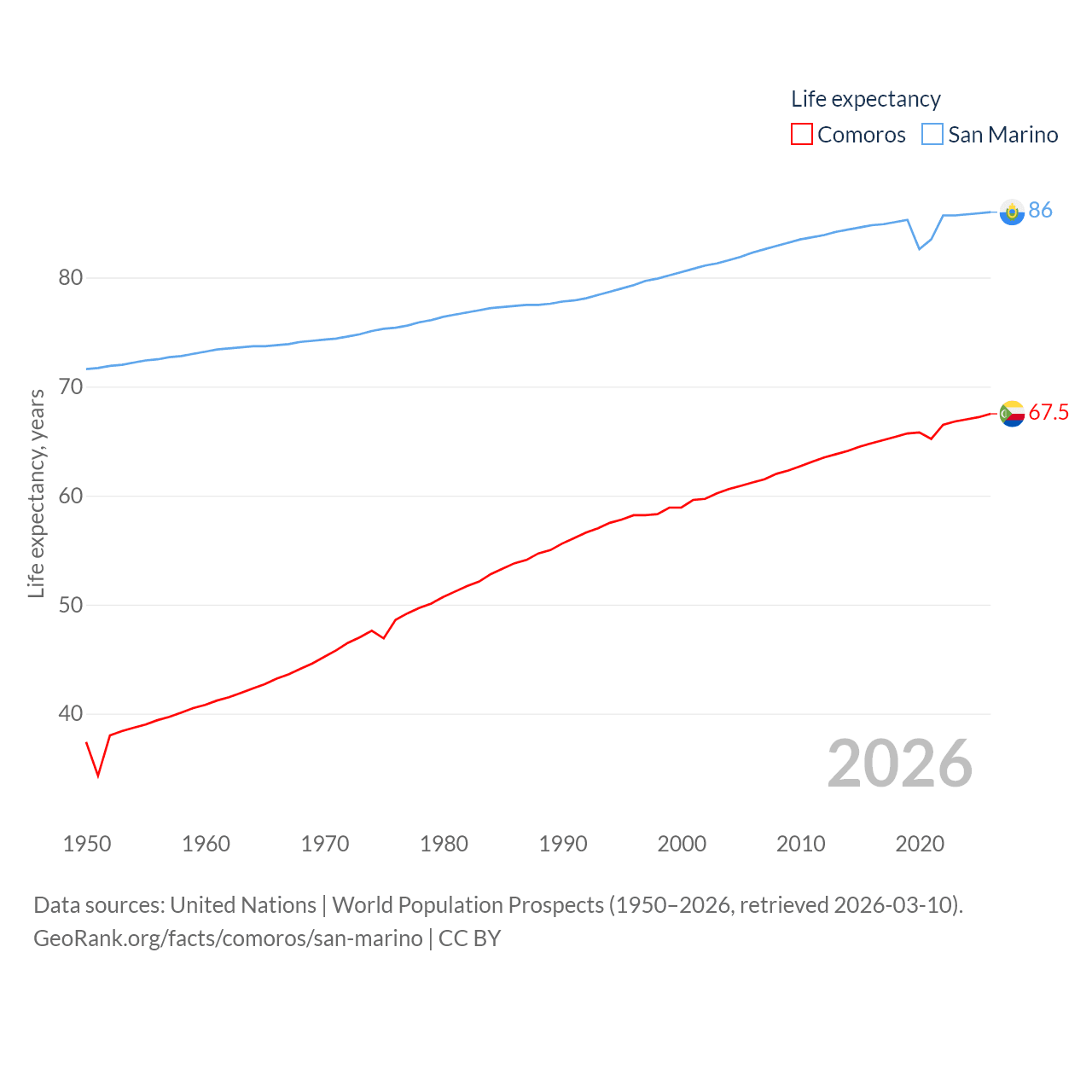 Comoros has a population of 867K (ranked 160/197), compared with 34K in San Marino (ranked 193/197). Comoros' land area is 719 sq mi versus 23.2 sq mi for San Marino (ranked 171st vs. 193rd).