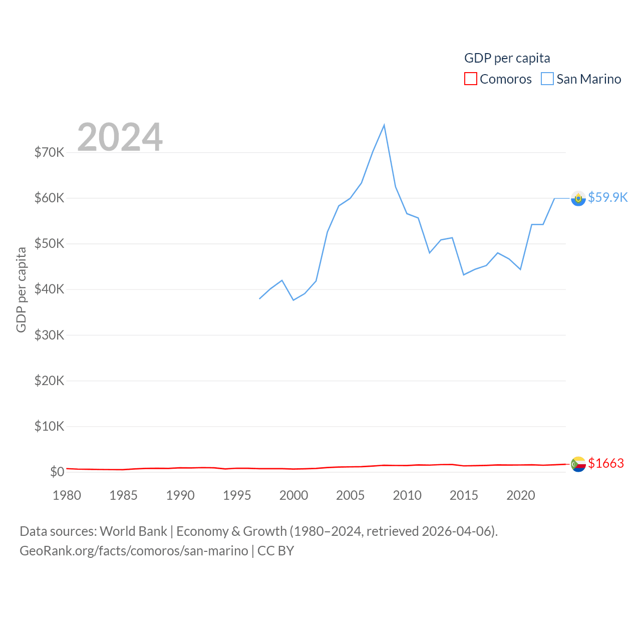 By GDP, Comoros ranks 183/197 ($1.44B) and San Marino ranks 180/197 ($2.03B). By GDP per capita, Comoros ranks 161/197 ($1,663), while San Marino ranks 15/197 ($59,880).