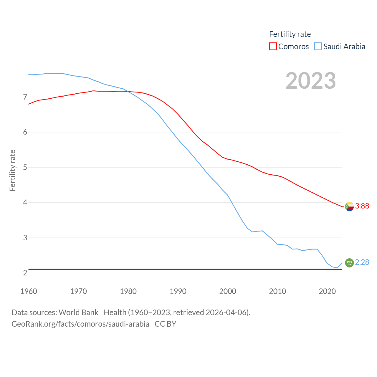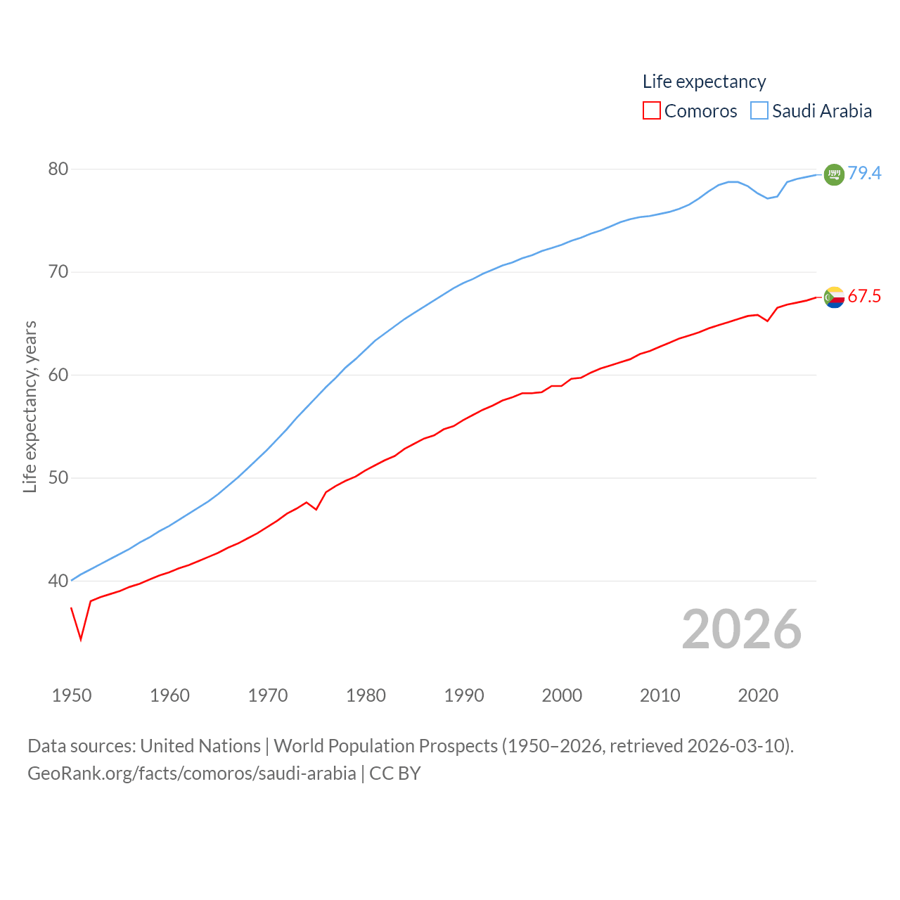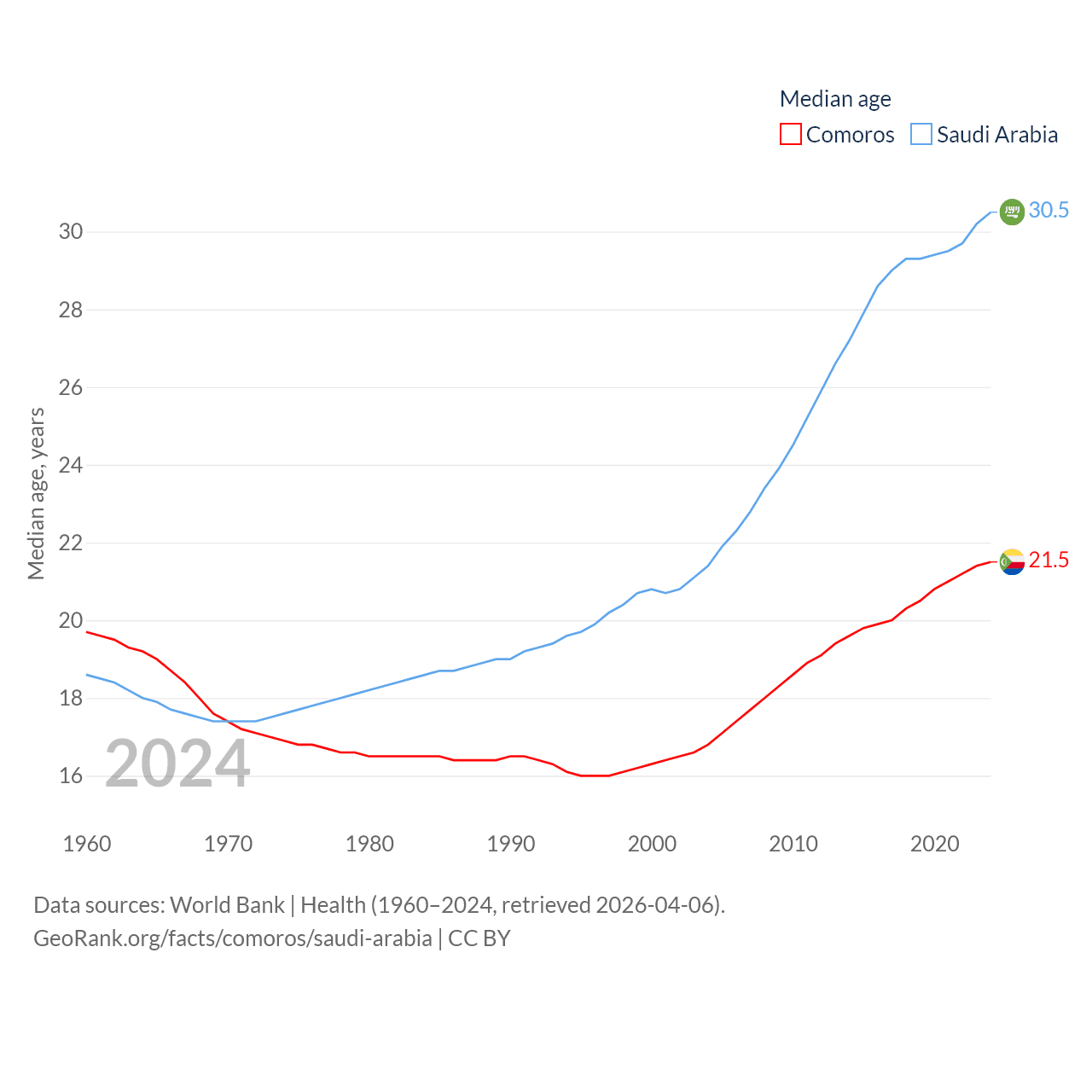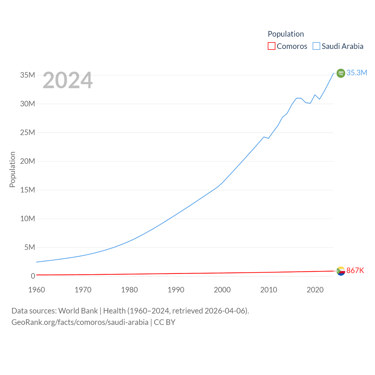Comoros has a population of 867K (ranked 160/197), compared with 35.3M in Saudi Arabia (ranked 45/197). Comoros' land area is 719 sq mi versus 830,000 sq mi for Saudi Arabia (ranked 171st vs. 12th).