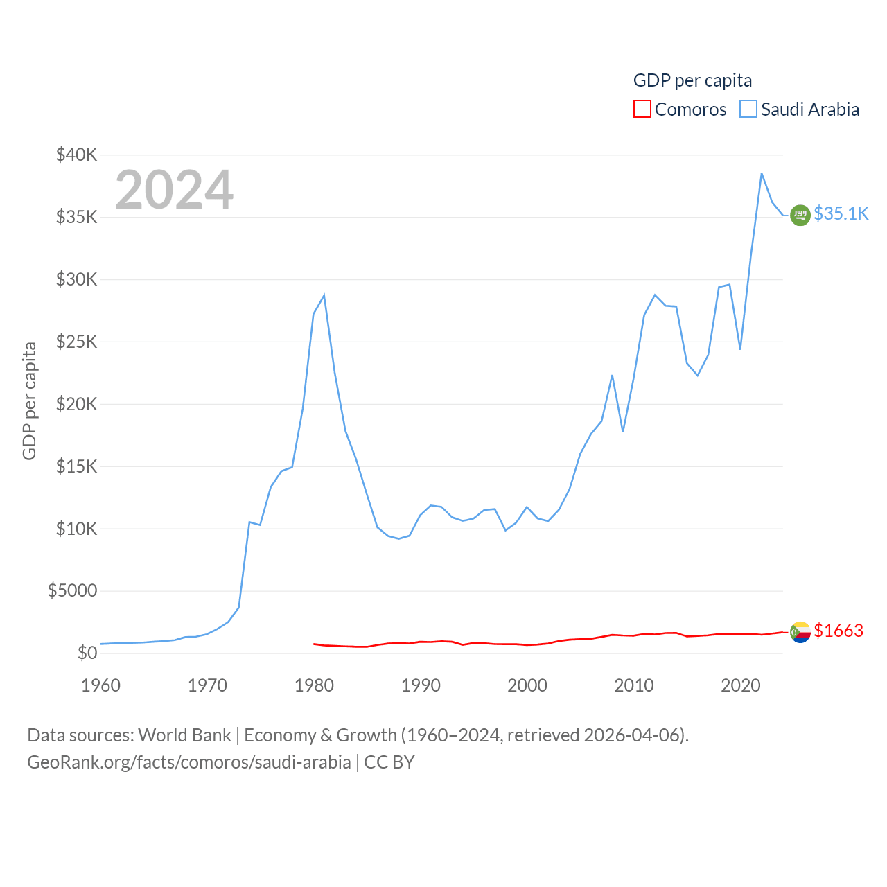 By GDP, Comoros ranks 183/197 ($1.44B) and Saudi Arabia ranks 18/197 ($1.24T). By GDP per capita, Comoros ranks 161/197 ($1,663), while Saudi Arabia ranks 33/197 ($35,122).