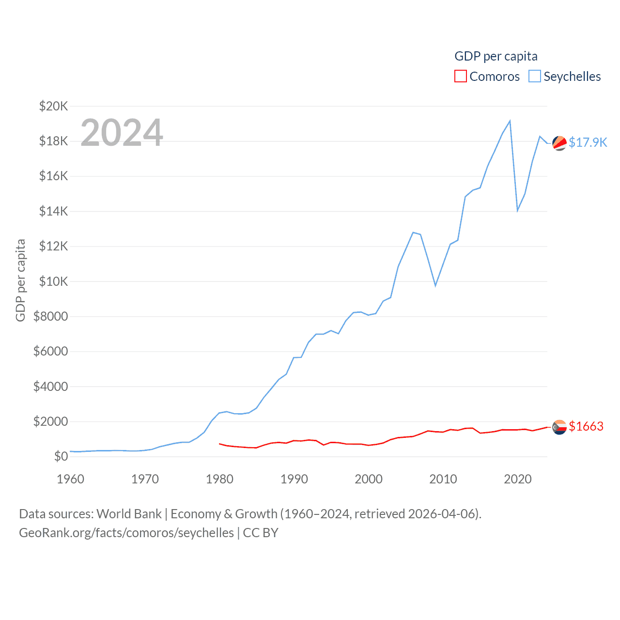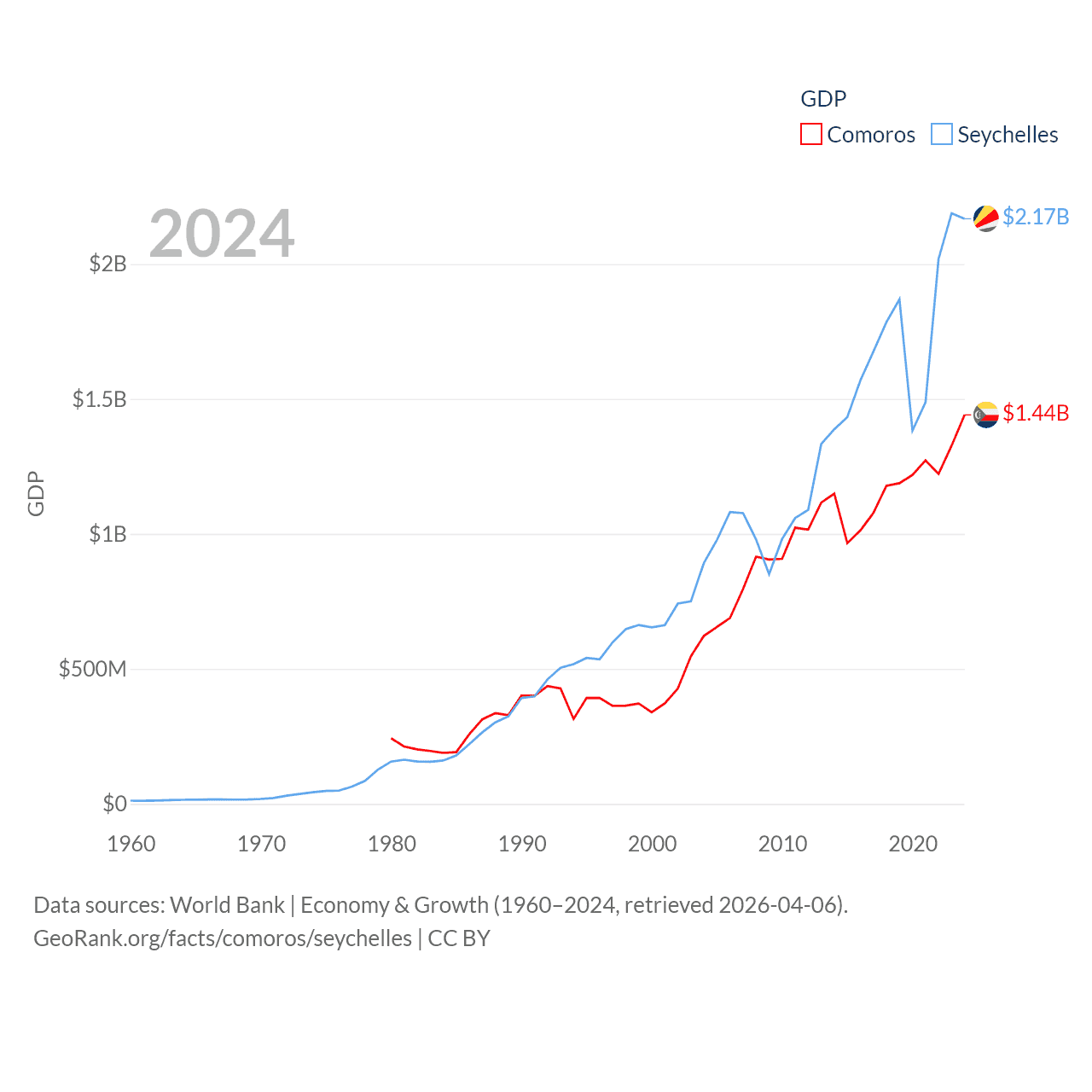 By GDP, Comoros ranks 183/197 ($1.44B) and The Seychelles ranks 178/197 ($2.17B). By GDP per capita, Comoros ranks 161/197 ($1,663), while The Seychelles ranks 63/197 ($17,859).