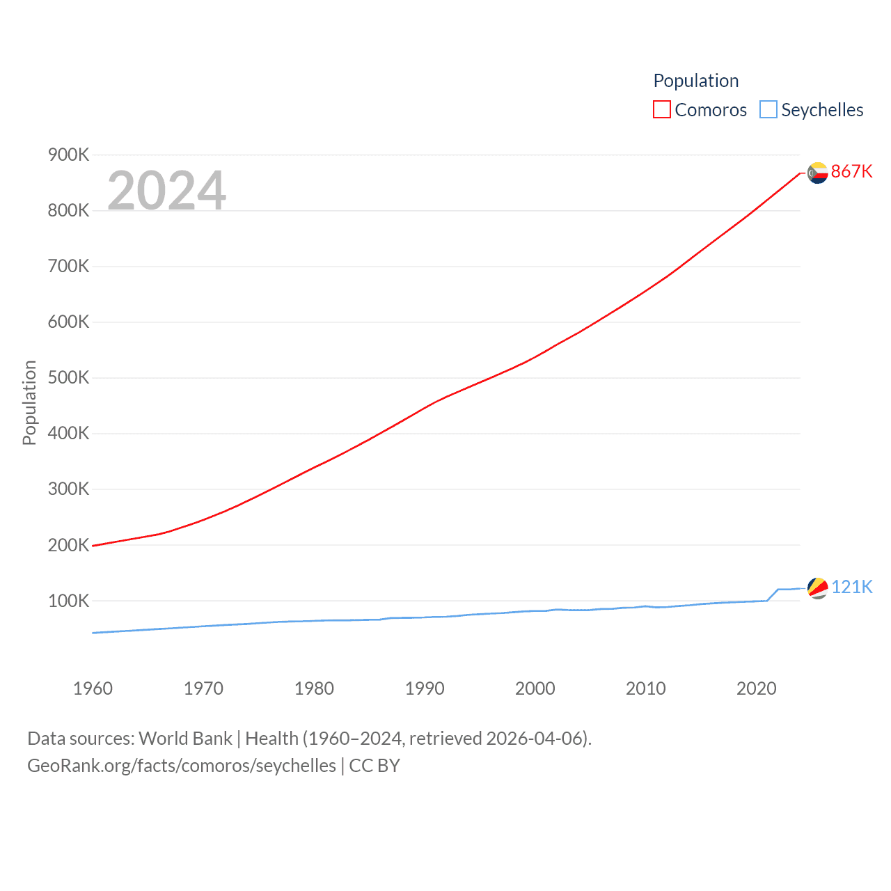 Comoros has a population of 867K (ranked 160/197), compared with 121K in The Seychelles (ranked 181/197). Comoros' land area is 719 sq mi versus 177.6 sq mi for The Seychelles (ranked 171st vs. 181st).