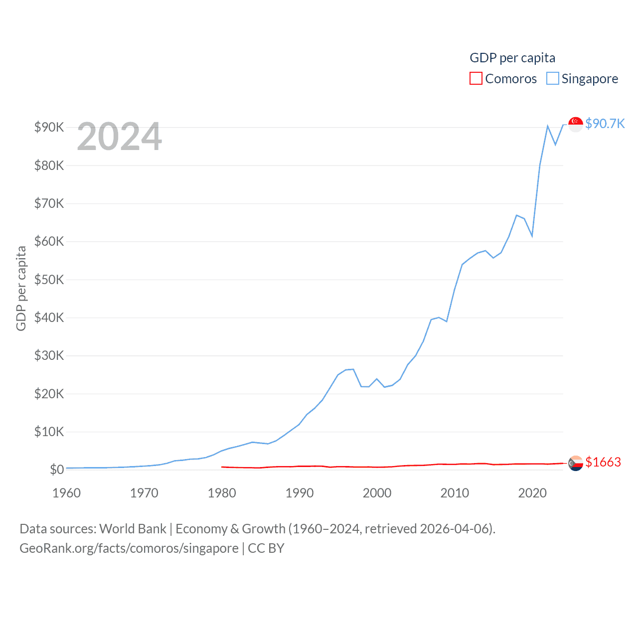 By GDP, Comoros ranks 183/197 ($1.44B) and Singapore ranks 28/197 ($547B). By GDP per capita, Comoros ranks 161/197 ($1,663), while Singapore ranks 7/197 ($90,674).