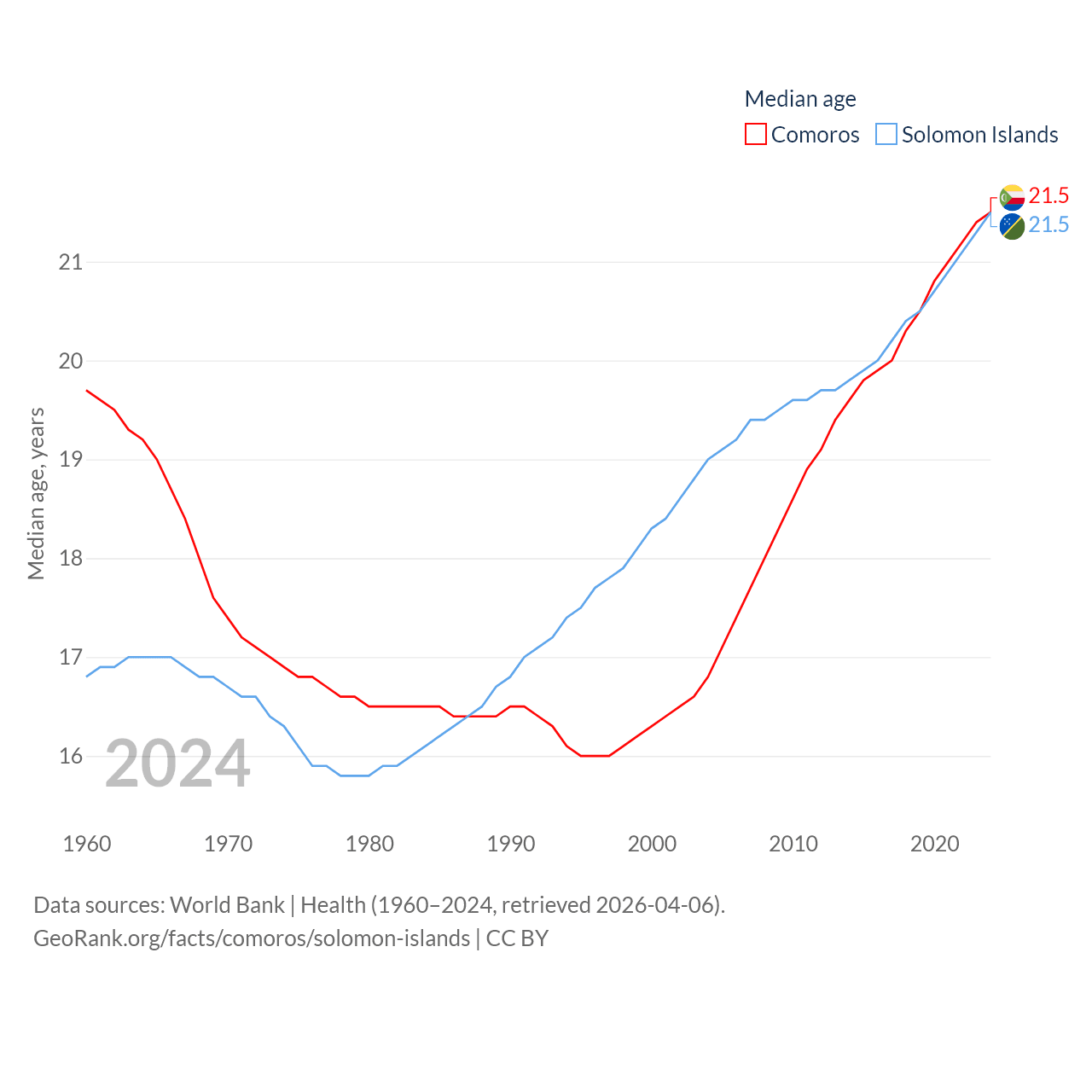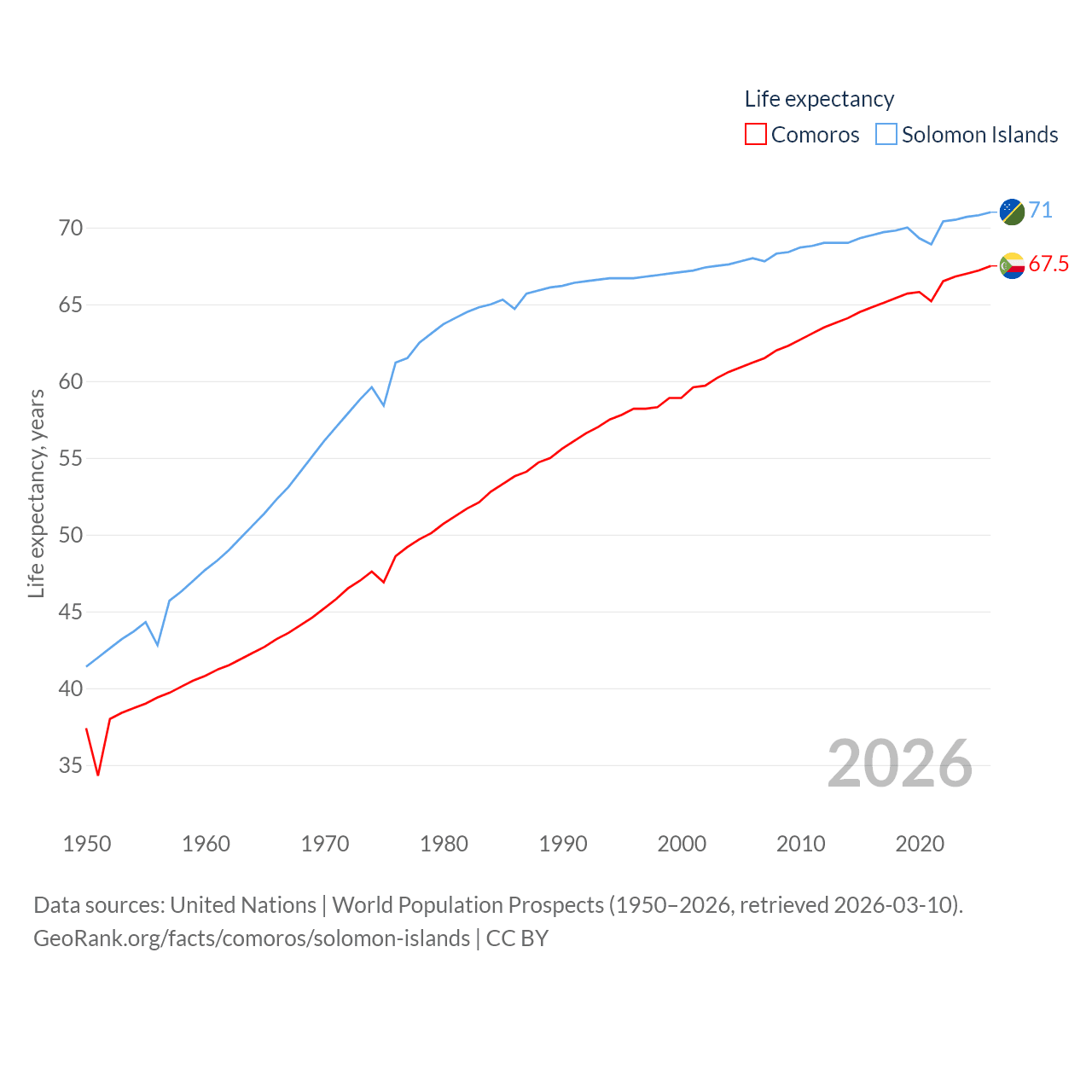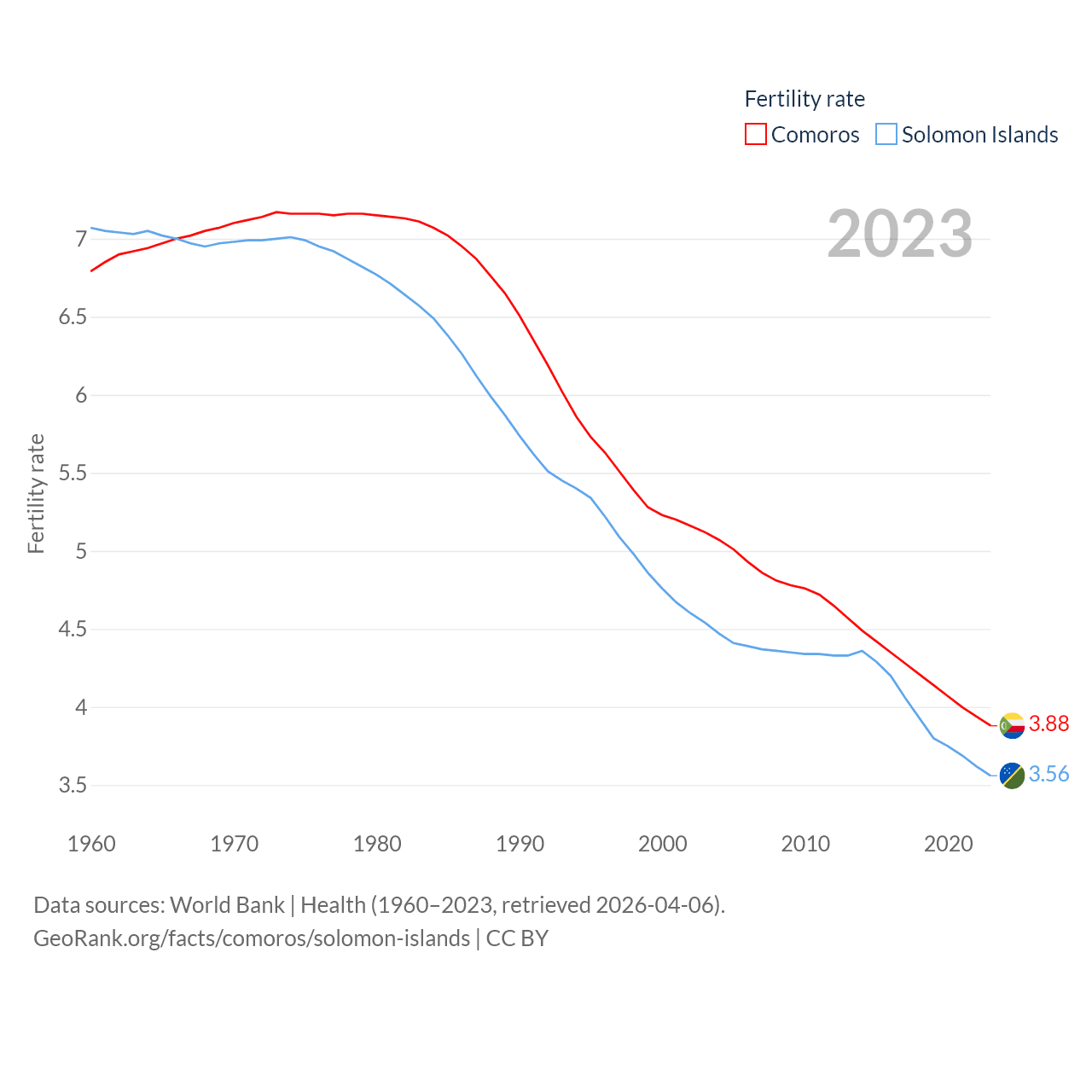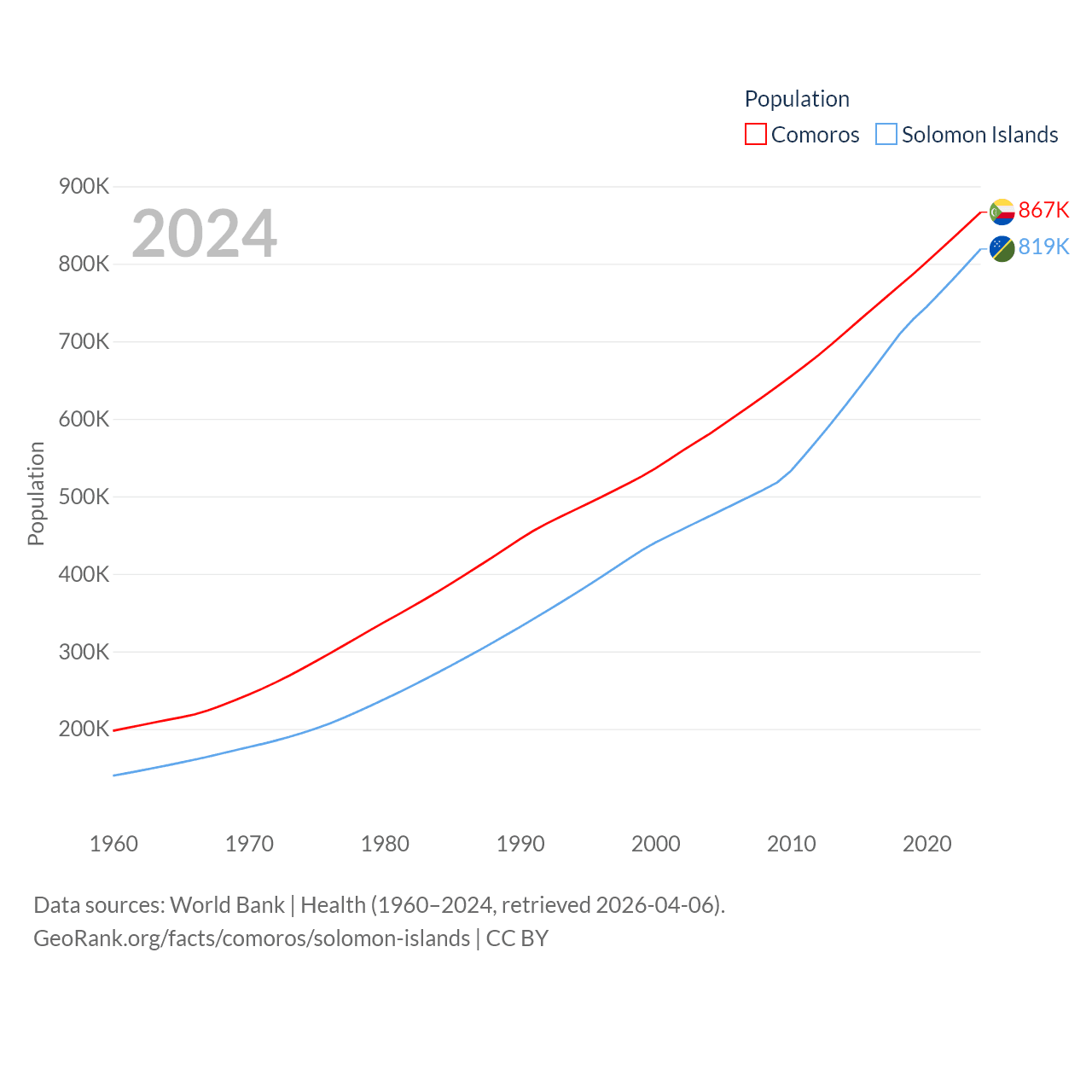Comoros has a population of 867K (ranked 160/197), compared with 819K in The Solomon Islands (ranked 162/197). Comoros' land area is 719 sq mi versus 10,807 sq mi for The Solomon Islands (ranked 171st vs. 141st).