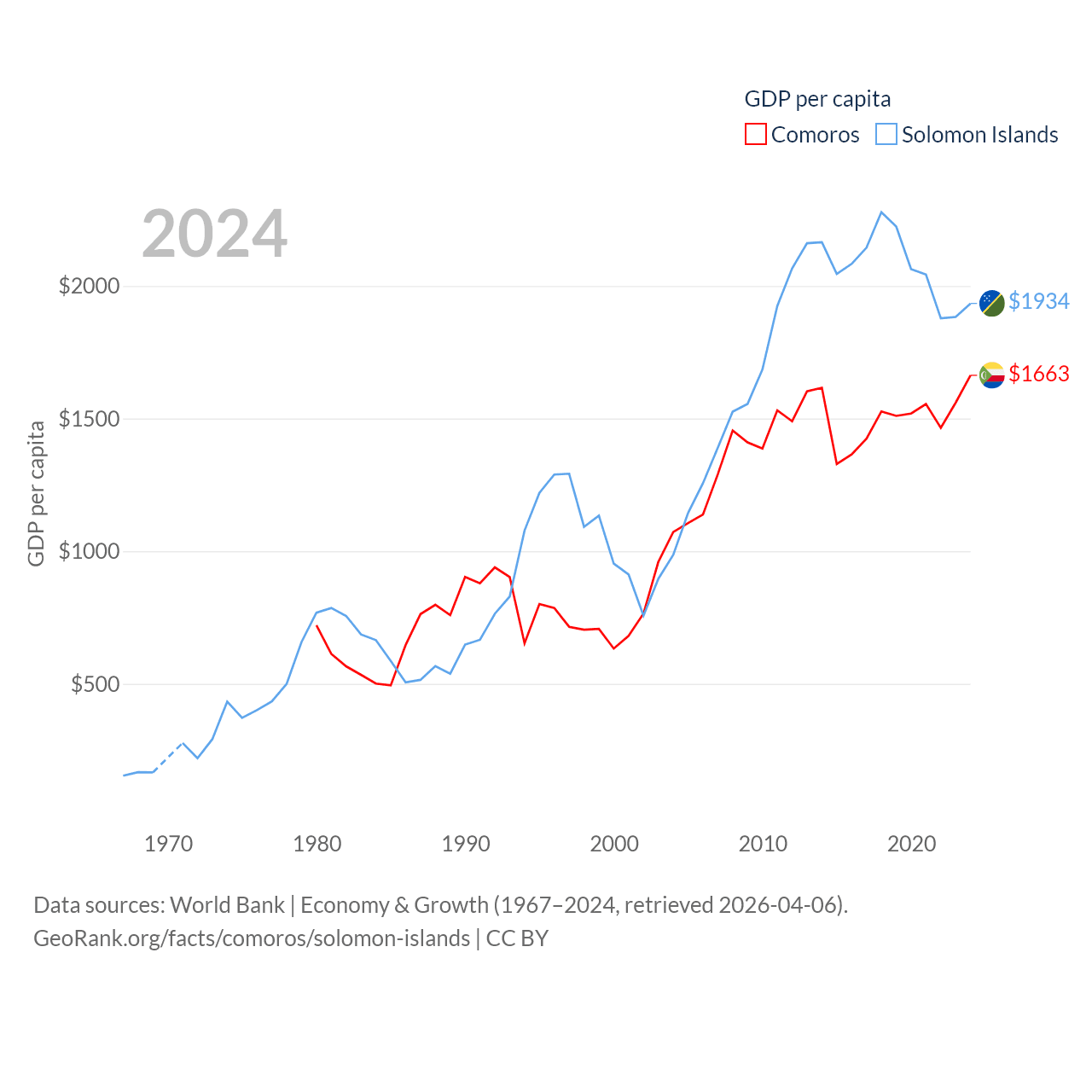 By GDP, Comoros ranks 183/197 ($1.44B) and The Solomon Islands ranks 182/197 ($1.58B). By GDP per capita, Comoros ranks 161/197 ($1,663), while The Solomon Islands ranks 157/197 ($1,934).